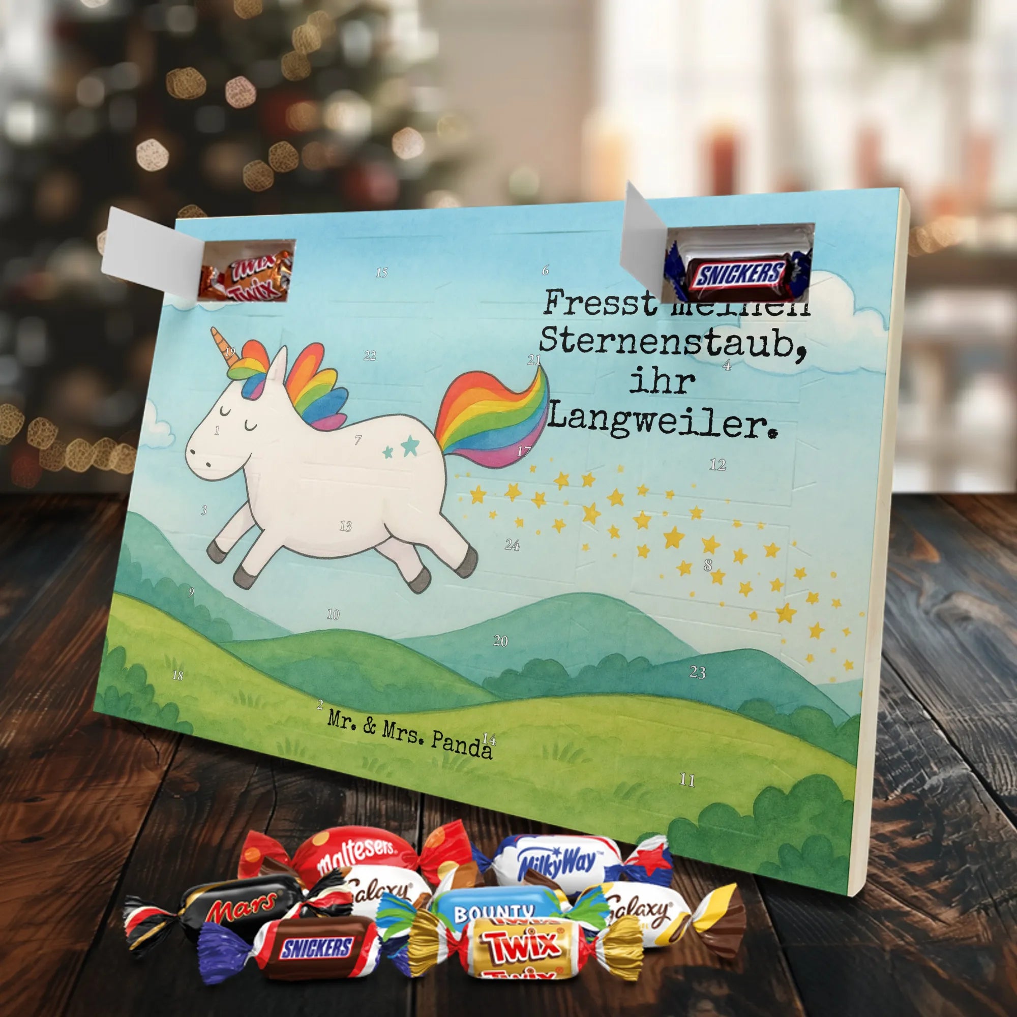 Unser Adventskalender mit Schokolade von Mr. & Mrs. Panda ist ein liebevoll gestaltetes Highlight für die Adventszeit. Die süßen Illustrationen und charmanten Sprüche sorgen für gute Stimmung bei Groß und Klein. Gedruckt in brillanter Qualität mit seidenmatter Oberflächenveredelung, wirken die Farben kräftig und edel; auch die Seitenflächen sind dekorativ bedruckt. Bitte beachten: Der Kalender ist nicht personalisierbar. Gefüllt ist er mit 24 Celebrations-Überraschungen in acht verschiedenen Sorten: Maltesers, Mars, Snickers, Twix, Milky Way, Bounty, Galaxy und Galaxy Caramel — perfekte Abwechslung für jeden Tag. Besonderheit: Du kannst den Kalender sowohl aufstellen als auch aufhängen. Maße: 325 mm x 225 mm x 27 mm. Schenke Vorfreude und kleine Genussmomente – ideal als Geschenk oder für deine eigene Adventszeit.