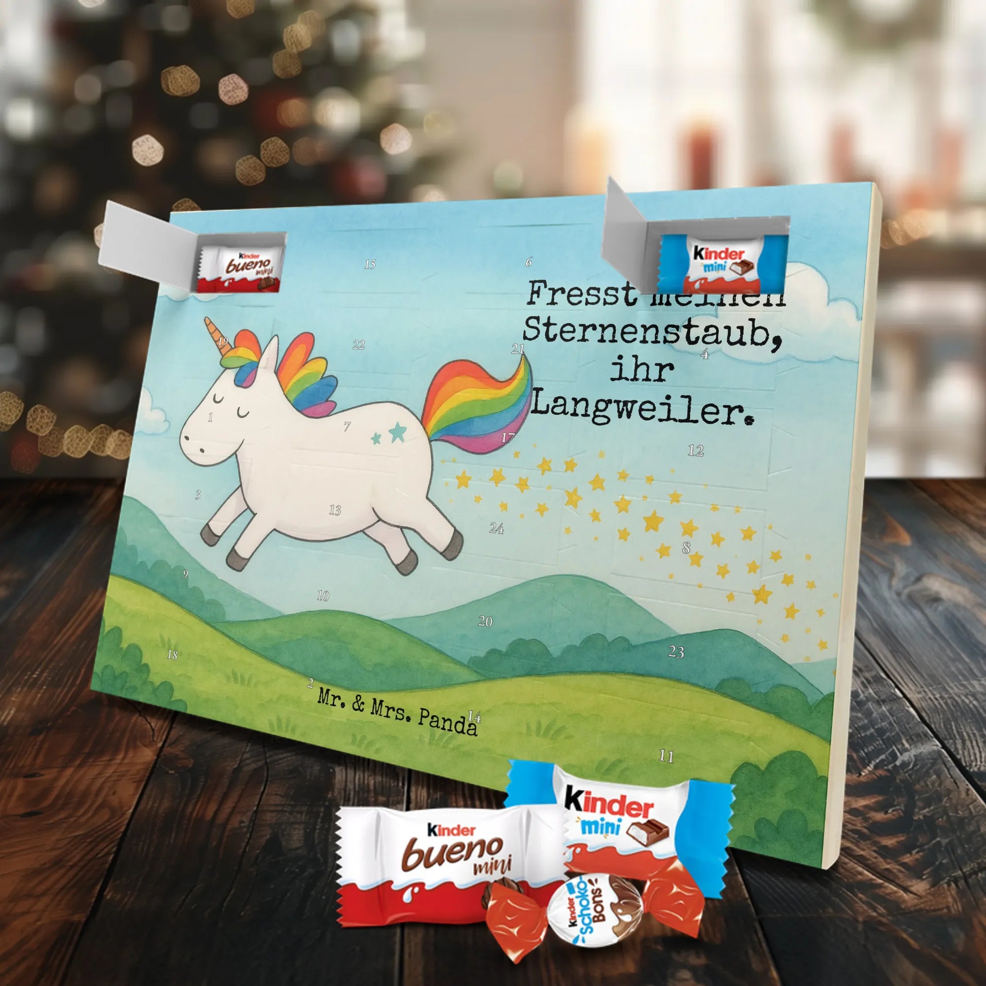Entdecke unseren liebevoll gestalteten Schoko-Adventskalender von Mr. & Mrs. Panda – eine zauberhafte Idee, um die Tage bis Weihnachten zu versüßen. Der Kalender ist bedruckt mit wunderschönen Motiven & Sprüchen von Mr. & Mrs. Panda und ist nicht personalisierbar. Wir setzen auf brillante Druckqualität mit seidenmatter Oberflächenveredelung und bedruckte Seitenflächen für ein rundum schönes Erscheinungsbild. Maße: 355 mm x 245 mm x 11 mm. Die clevere Bauweise erlaubt es, den Kalender entweder aufzuhängen oder freistehend aufzustellen – so bist du flexibel bei der Dekoration. Gefüllt mit Markenname Schokolade: Adventskalender gefüllt mit kinder® Schokolade. Inhalt: kinder® Schoko-Bons, kinder® Bueno mini und kinder® Schokolade mini. Jeder Tag bringt eine kleine Freude und eignet sich perfekt als Geschenk oder als dekoratives Highlight in deinem Zuhause. Die stabile Verarbeitung sorgt dafür, dass der Kalender die ganze Adventszeit über Freude bereitet. Hol dir diesen Schoko-Adventskalender und lade die Vorweihnachtszeit mit süßen Überraschungen auf!