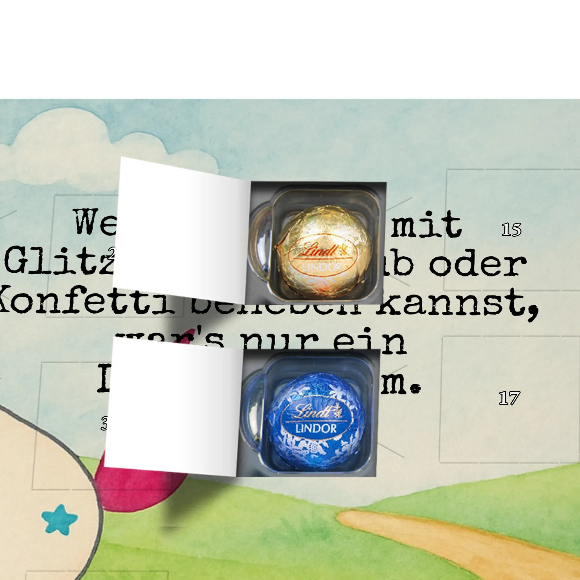 Der Adventskalender mit Schokolade von Mr. & Mrs. Panda ist ein echter Blickfang und eine köstliche Überraschung für die Vorweihnachtszeit. Er ist bedruckt mit wunderschönen Motiven & Sprüchen von Mr. & Mrs. Panda und nicht personalisierbar – deshalb perfekt als unkompliziertes Geschenk. Die brillante Druckqualität und die seidenmatte Oberflächenveredelung sorgen für eine hochwertige Optik, ergänzt durch bedruckte Seitenflächen. Maße: 233 mm x 178 mm x 24 mm. Besonderheit: kann aufgehängt oder aufgestellt werden, ganz wie es dir gefällt. Gefüllt mit Lindt Lindor: 24 einzeln verpackte Markenschokoladen Kugeln in den Sorten Vollmilch, Feinherb und Weiße Schokolade bieten täglich neue Geschmackserlebnisse. Zutaten: Zucker, pflanzliches Fett (Kokosnuss, Palmkern), Kakaobutter, Vollmilchpulver, Kakaomasse, Milchzucker, Magermilchpulver, Butterreinfett, Emulgator (Sojalecithin), Gerstenmalzextrakt, Aromen. Besondere Hinweise: Kann Haselnüsse und Mandeln enthalten. Ob als Mitbringsel, Geschenk oder zum Selbstverwöhnen – dieser Adventskalender vereint schönes Design mit zarter Markenschokolade.