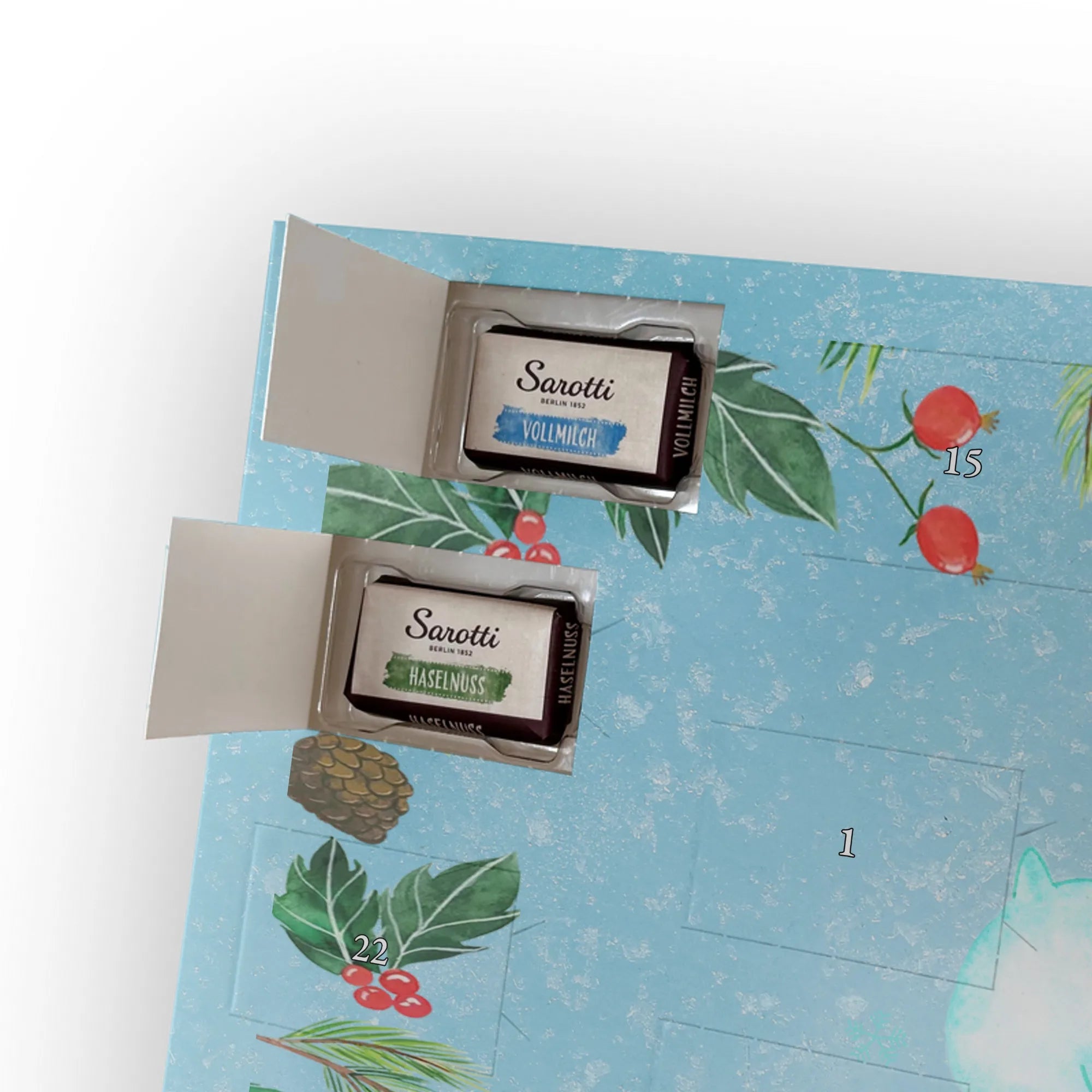🐼 SCHOKOLADEN-ADVENTSKALENDER: Edler, seidenmatter Druck mit liebevollen Illustrationen.