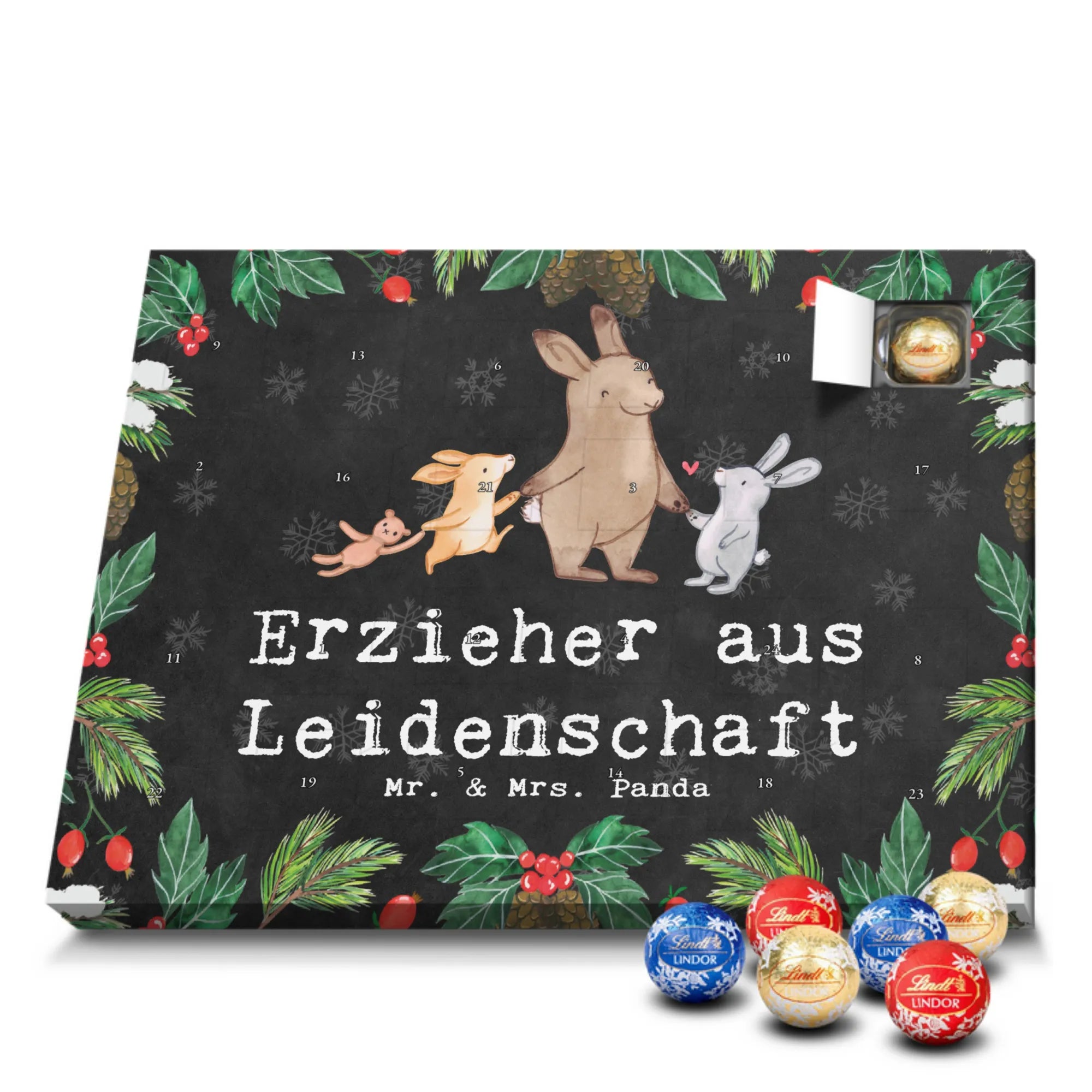 Mr. & Mrs. Panda Schoko Adventskalender „Erzieher aus Leidenschaft“ – ein liebevolles Geschenk für alle, die mit Herz und Leidenschaft im Kindergarten arbeiten. Dieser Schokoladen Adventskalender vereint süßen Genuss mit einer persönlichen Botschaft und dem niedlichen Hasenmotiv von Mrs. Panda. 🎁