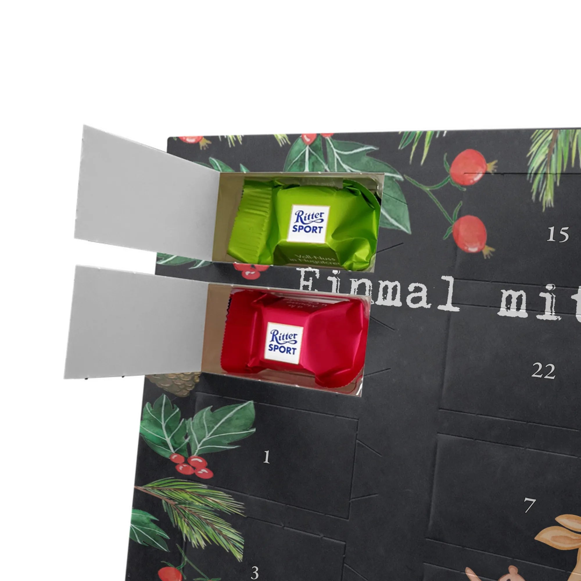 Adventskalender mit Schokolade – so schmeckt Vorfreude! Unser Mr. & Mrs. Panda Adventskalender ist liebevoll gestaltet und bedruckt mit wunderschönen Motiven & Sprüchen, die jeden Tag versüßen. Die brillante Druckqualität mit seidenmatter Oberflächenveredelung sorgt für ein edles Finish, und auch die Seitenflächen sind hübsch bedruckt. Der Kalender ist nicht personalisierbar, dafür aber vielseitig einsetzbar: Maße: 325 mm x 225 mm x 27 mm und die besondere Eigenschaft, dass du ihn aufgehängt oder aufgestellt verwenden kannst, geben dir Flexibilität bei der Dekoration. Gefüllt ist der Kalender mit Ritter Sport Schokowürfeln in beliebten Geschmacksrichtungen wie Mousse au Chocolat, Schoko Crisp, Voll-Nuss in Nougatcreme, Karamell Duo, Joghurt und Erdbeer-Joghurt. Wichtig: Es handelt sich um einen Kalender gefüllt mit Ritter Sport Schokolade, nicht um einen Kalender der Marke Ritter Sport. Ideal als Geschenk oder als Adventsdeko für dein Zuhause – kleine Schokofreuden warten hinter jedem Türchen.
