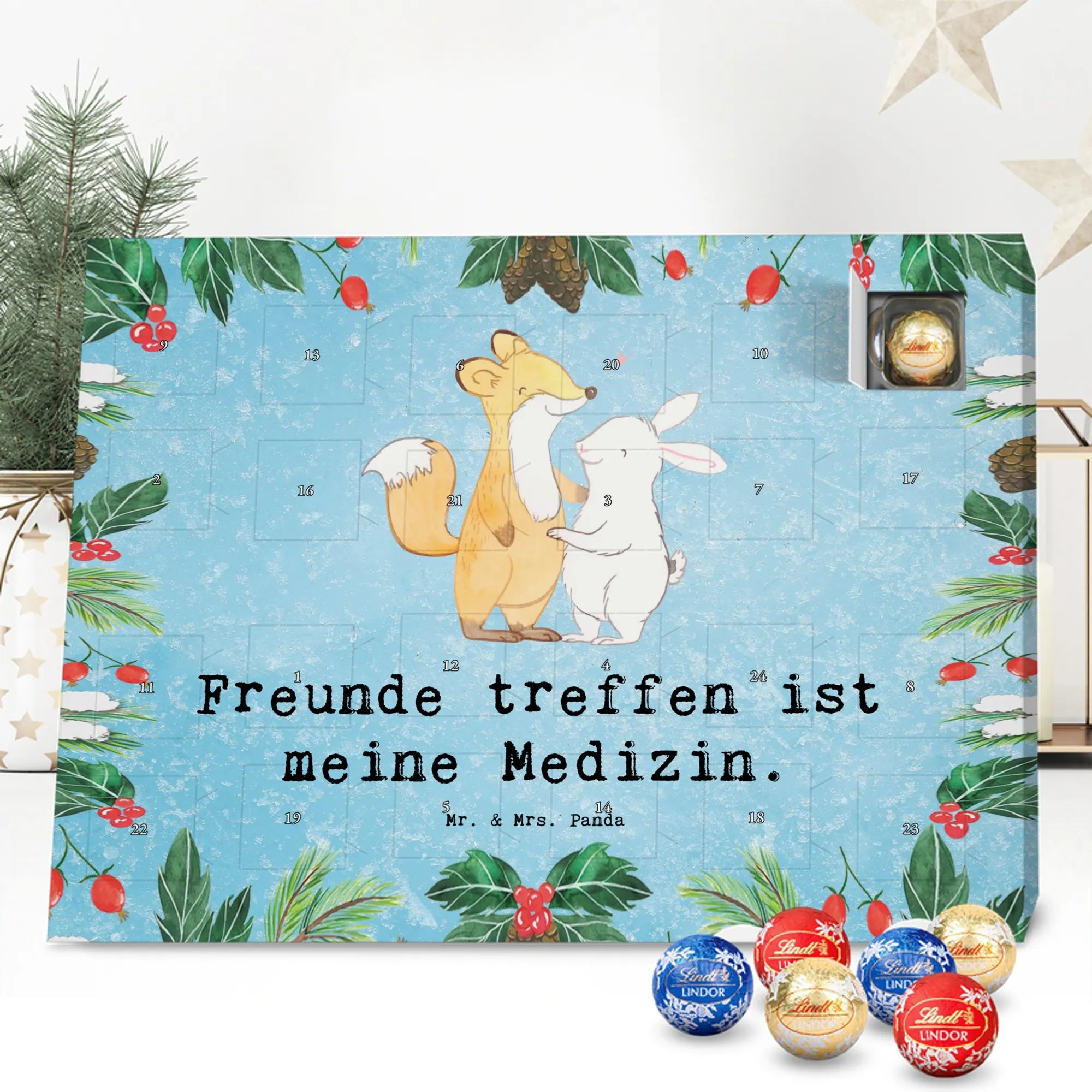 Wunderschöner Adventskalender mit Schokolade von Mr. & Mrs. Panda – für alle, die Advent und Design lieben. Dieser Adventskalender mit Schokolade ist liebevoll bedruckt mit wunderschönen Motiven & Sprüchen von Mr. & Mrs. Panda und ist nicht personalisierbar, aber mit viel Liebe zum Detail gefertigt. Brillante Druckqualität mit seidenmatter Oberflächenveredelung sorgt für einen edlen Look, und die bedruckten Seitenflächen geben dem Kalender eine besondere Optik. Maße: 233 mm x 178 mm x 24 mm. Dank seiner stabilen Verarbeitung kannst du ihn aufstellen oder ganz einfach aufhängen – Besonderheit: kann aufgehängt oder aufgestellt werden. Gefüllt mit MARKENNAMEN Schokolade und leckeren Schokoladenkugeln, bringt er jeden Tag ein kleines Glückserlebnis. Wichtige Hinweise: (Kann Spuren von Haselnüssen, Mandeln, Gluten und Soja enthalten!), bitte kühl und trocken lagern. Ob als Geschenk, Mitbringsel oder Adventsdeko – dieser Kalender zaubert ein Lächeln und sorgt für gemütliche Vorfreude. Viel Freude beim Entdecken der süßen Überraschungen wünscht dir Mr. & Mrs. Panda!