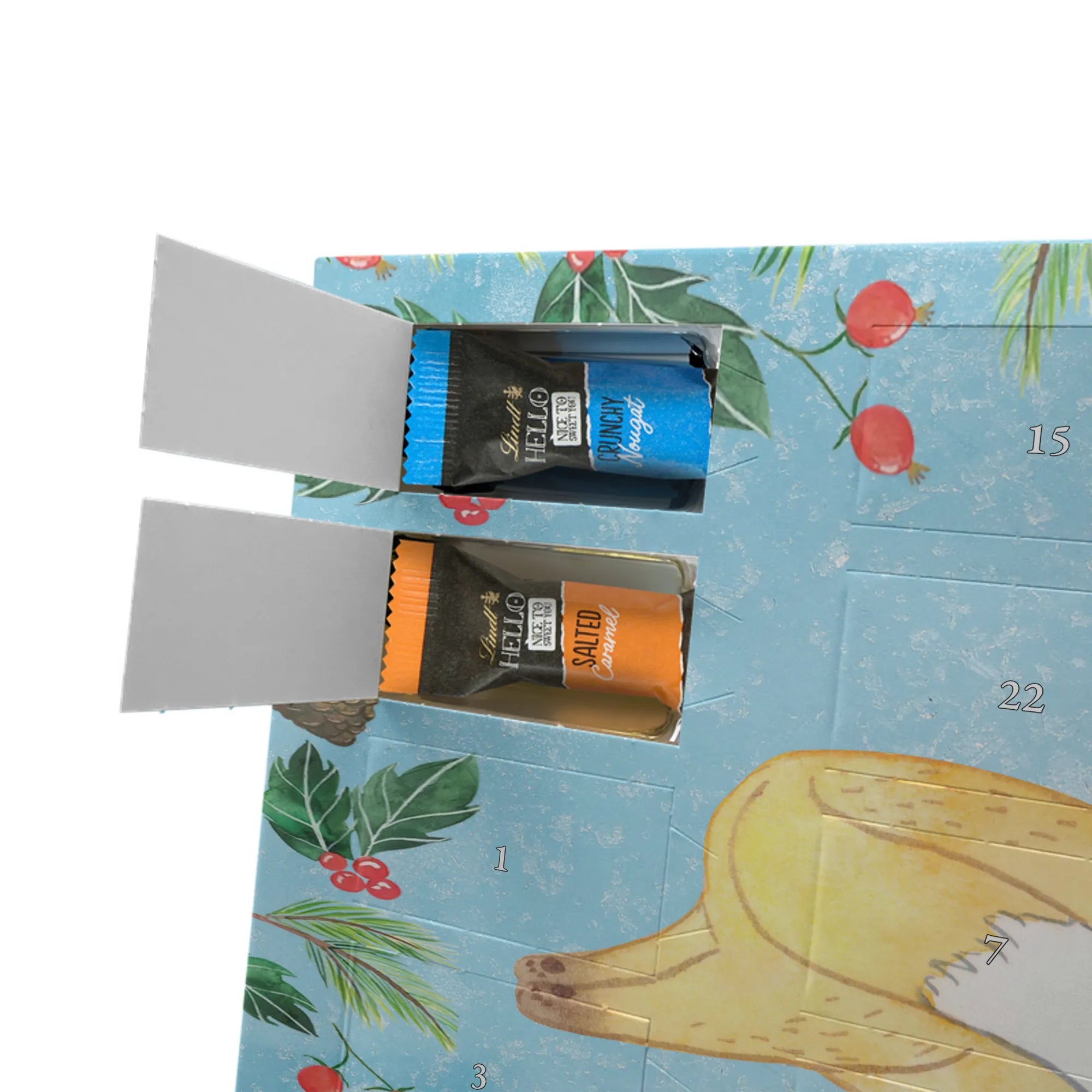 Entdecke den charmanten Schokoladen Adventskalender von Mr. & Mrs. Panda – ein kleines Kunstwerk für alle Schoko-Liebhaber. Der Schoko-Adventskalender ist mit liebevollen Illustrationen und kurzen Sprüchen bedruckt und verbreitet gemütliche Vorfreude auf Weihnachten. Er ist nicht personalisierbar, aber durch die brillante Druckqualität und die seidenmatte Oberflächenveredelung ein echtes Hingucker-Produkt. Auch die Seitenflächen sind bedruckt, was dem Kalender ein rundum schönes Erscheinungsbild verleiht. Maße: 325 mm x 225 mm x 27 mm. Das praktische Design erlaubt es, den Kalender aufzuhängen oder aufzustellen. Gefüllt mit Lindt Hello Schokolade: 24 einzeln verpackte Mini Sticks in vier leckeren Sorten – Karamell-Schokoladenkuchen, Kekse, Knuspriger Nougat und Erdbeer-Cheesecake. Zutaten sind u. a. Zucker, Kakaobutter, Vollmilchpulver, Haselnüsse und weitere Zutaten; Allergene: Milcheiweiß, Milchzucker, Soja, Weizen, Haselnüsse; kann Spuren von Mandeln und anderen Schalenfrüchten enthalten. Ideal als Geschenk oder zum Selbernaschen – einfach jeden Tag ein Türchen öffnen und genießen.