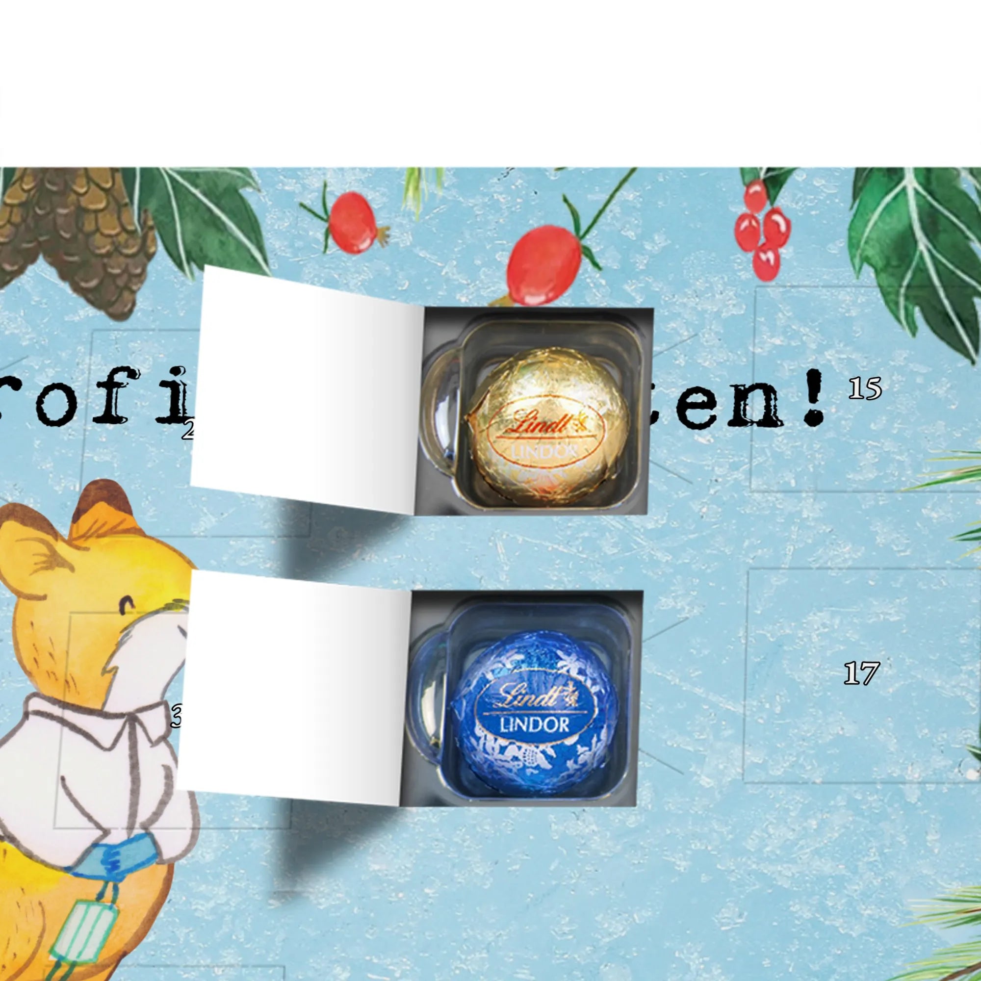 Der Schokolade Adventskalender von Mr. & Mrs. Panda ist ein liebevoll gestaltetes Highlight für deine Adventsdeko. Bedruckt mit wunderschönen Motiven & Sprüchen, nicht personalisierbar, bietet er eine charmante Optik für jeden Haushalt. Die brillante Druckqualität mit seidenmatter Oberflächenveredelung sorgt für edle Akzente, und die bedruckten Seitenflächen machen den Kalender rundum schön. Maße: 233 mm x 178 mm x 24 mm. Besonderheit: kann aufgehängt oder aufgestellt werden – richtig praktisch! Gefüllt mit Lindt Lindor: 24 einzeln verpackte Markenschokoladen Kugeln in drei köstlichen Varianten – Vollmilch, Feinherb und Weiße Schokolade – sorgen für tägliche Freuden. Zutaten: Zucker, pflanzliches Fett (Kokosnuss, Palmkern), Kakaobutter, Vollmilchpulver, Kakaomasse, Milchzucker, Magermilchpulver, Butterreinfett, Emulgator (Sojalecithin), Gerstenmalzextrakt, Aromen. Besondere Hinweise: Kann Haselnüsse und Mandeln enthalten. Ob als Geschenk oder für dich selbst – dieser Kalender ist eine wunderbare Mischung aus Design und feiner Markenschokolade.