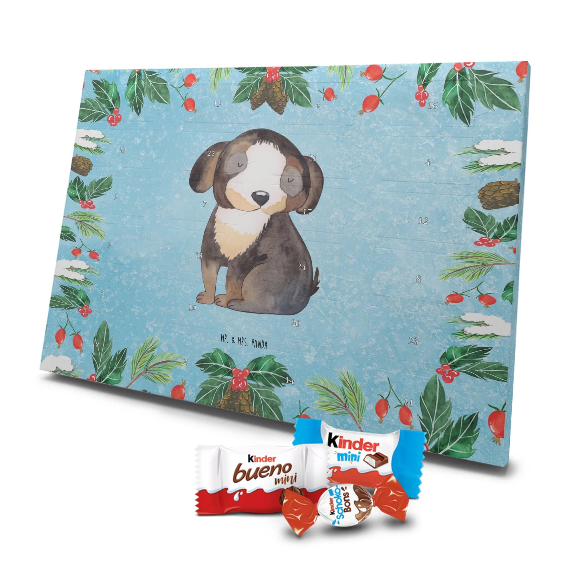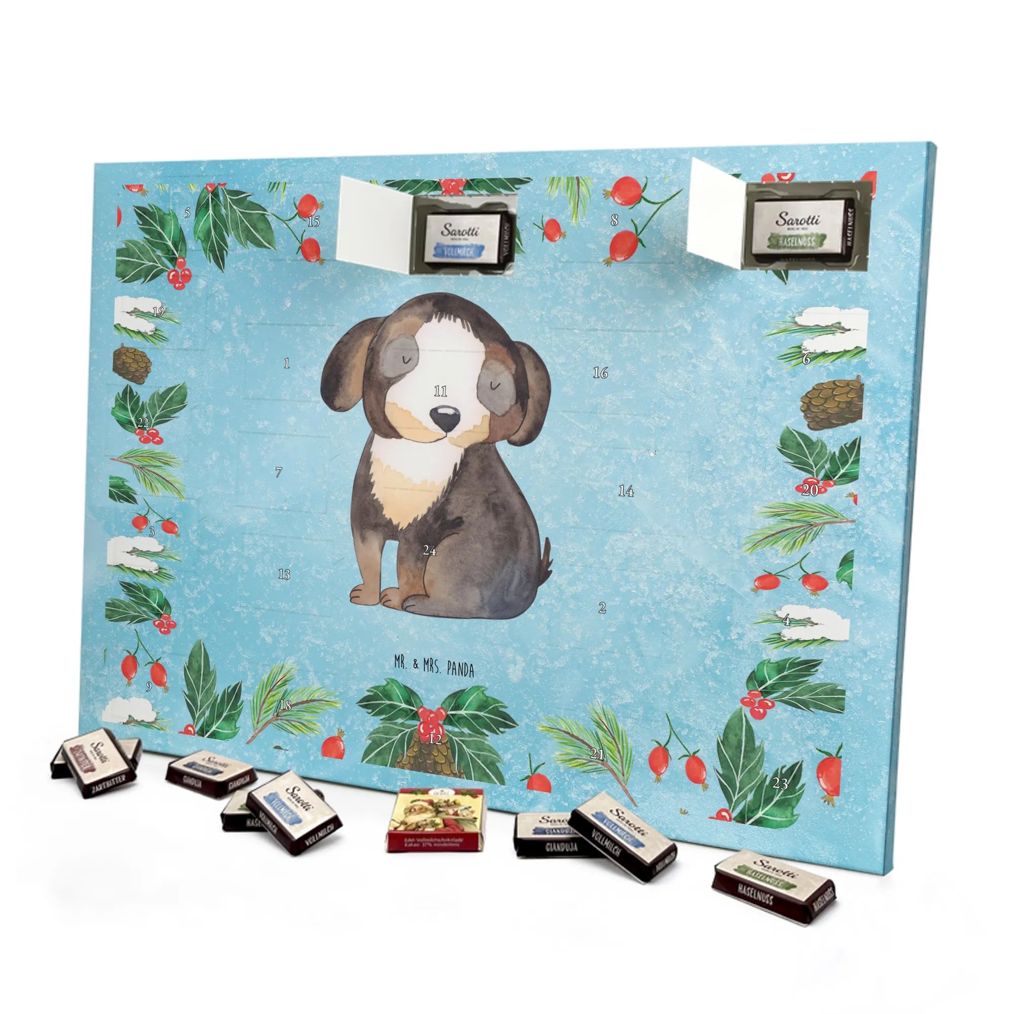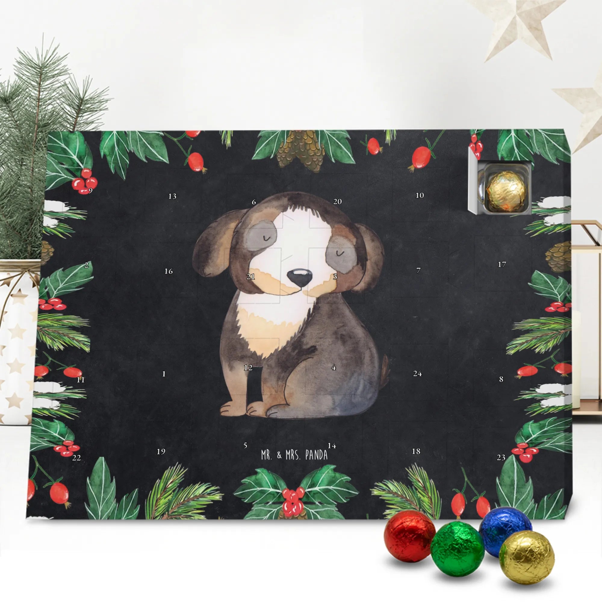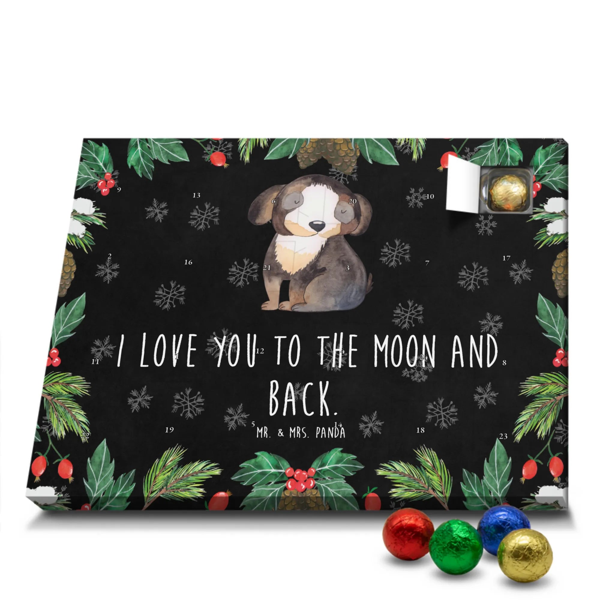 Wunderschöner Schokoladen-Adventskalender von Mr. & Mrs. Panda – süßes Design trifft hochwertige Verarbeitung. Unser Schokoladen-Adventskalender ist bedruckt mit wunderschönen Motiven & Sprüchen von Mr. & Mrs. Panda und nicht personalisierbar, dafür aber mit liebevollen Details gestaltet. Die brillante Druckqualität mit seidenmatter Oberflächenveredelung verleiht dem Kalender ein edles Finish, und auch die Seitenflächen sind bedruckt für einen rundum stimmigen Look. Maße: 233 mm x 178 mm x 24 mm. Die Konstruktion erlaubt sowohl das Aufstellen als auch das Aufhängen – Besonderheit: kann aufgehängt oder aufgestellt werden. Gefüllt mit MARKENNAMEN Schokolade und mit leckeren Schokoladenkugeln bestückt, ist jeder Dezembertag eine kleine Belohnung. Bitte lies die besonderen Hinweise: (Kann Spuren von Haselnüssen, Mandeln, Gluten und Soja enthalten!), kühl und trocken lagern. Ideal als Geschenk, Adventsdekoration oder süße Überraschung für Freunde und Familie. Mr. & Mrs. Panda wünscht dir eine gemütliche und genussvolle Adventszeit!