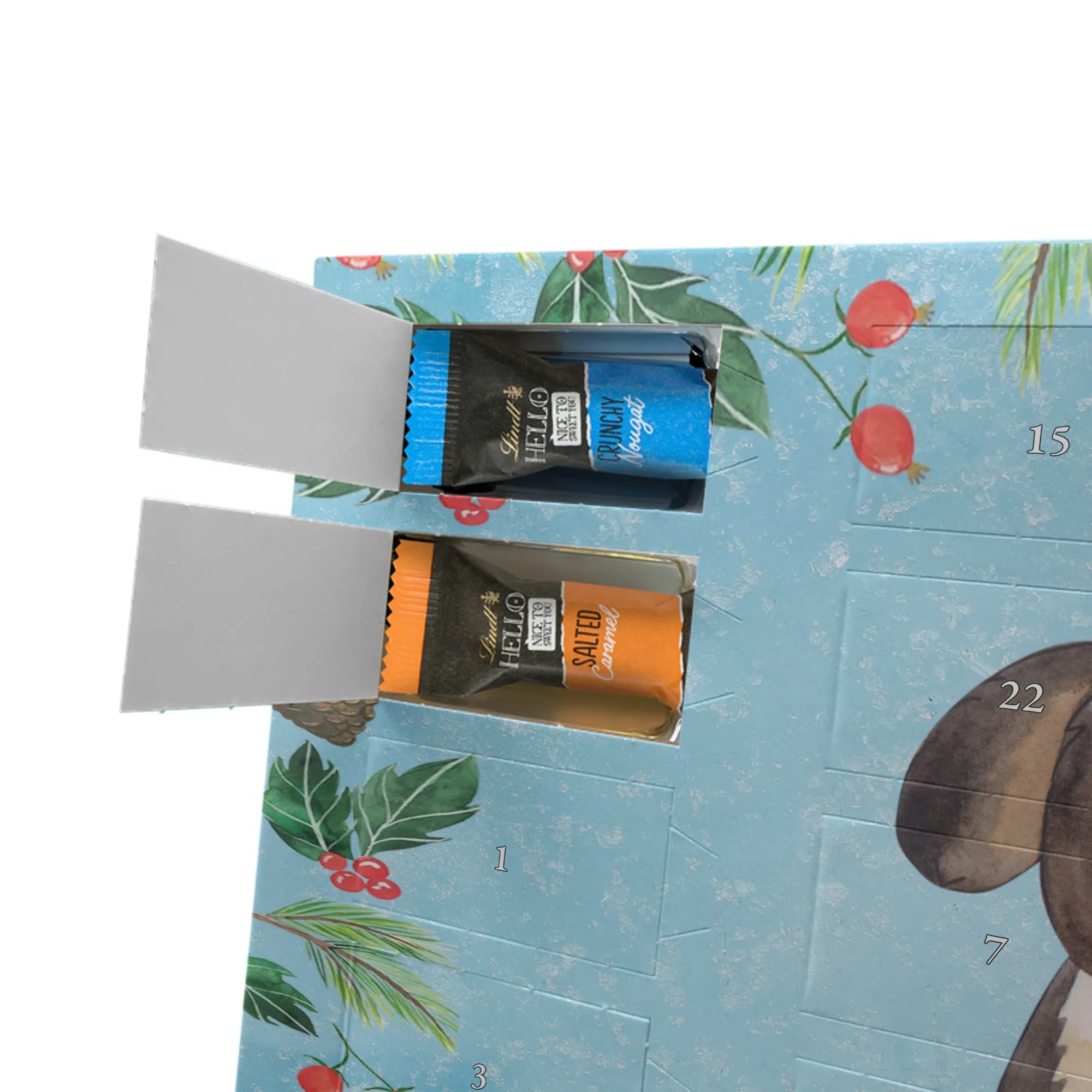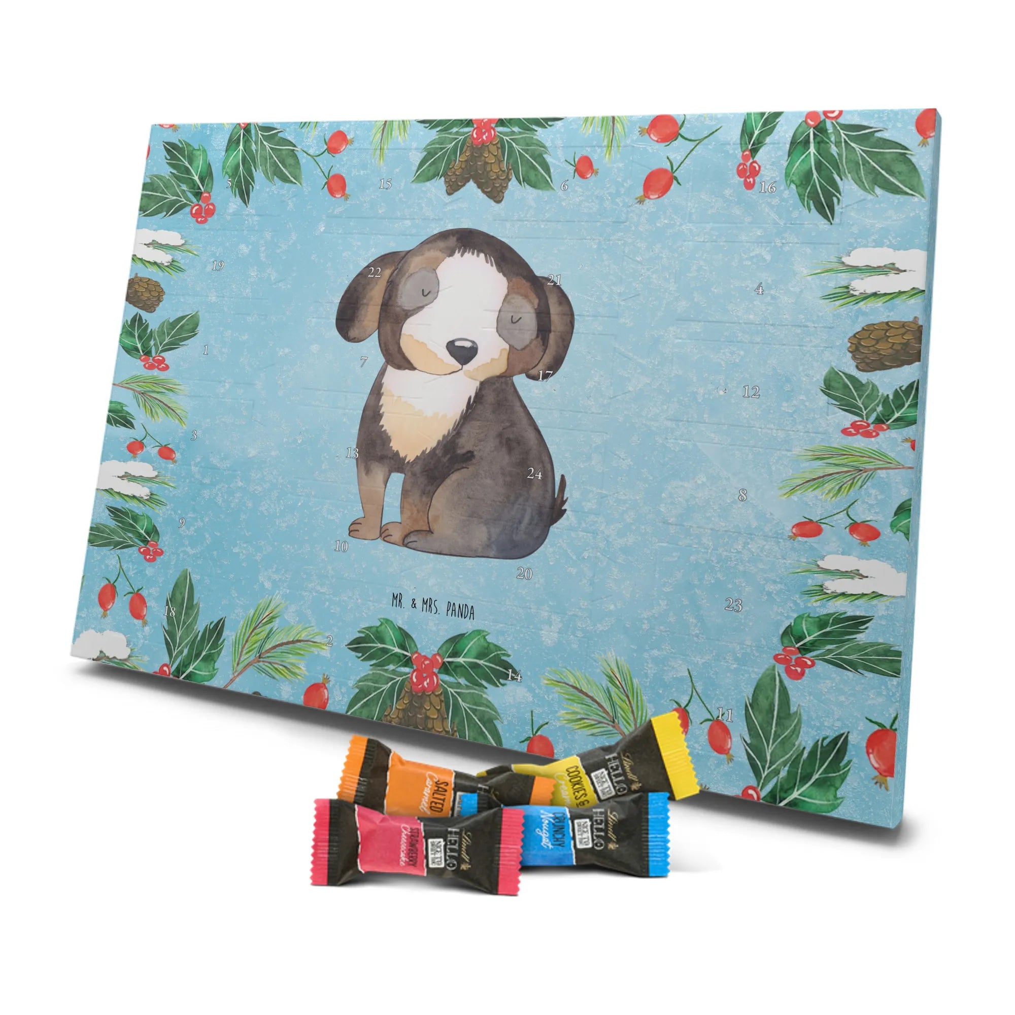 Unser Adventskalender Schokolade von Mr. & Mrs. Panda bringt dir jeden Tag eine kleine Freude. Das Design ist liebevoll bedruckt mit unseren typischen Motiven und lustigen Sprüchen – ein echter Blickfang in deinem Zuhause. Der Kalender ist nicht personalisierbar, überzeugt aber durch brillante Druckqualität und seidenmatte Oberflächenveredelung. Zusätzlich sind die Seitenflächen bedruckt, sodass das Motiv rundum zur Geltung kommt. Maße: 325 mm x 225 mm x 27 mm. Dank seines cleveren Aufhängemechanismus kannst du ihn entweder an die Wand hängen oder frei aufstellen. Gefüllt mit Lindt Hello Schokolade: 24 einzeln verpackte Schokoladen Mini Sticks in den Sorten Karamell-Schokoladenkuchen, Kekse, Knuspriger Nougat und Erdbeer-Cheesecake. Zutatenliste enthält u. a. Zucker, Kakaomasse, Vollmilchpulver, Haselnüsse; Allergene: Milcheiweiß, Milchzucker, Soja, Weizen und Haselnüsse, kann Mandeln und andere Schalenfrüchte enthalten. Perfekt als Geschenk für Kinder, Freunde oder als kleines Mitbringsel in der Adventszeit.