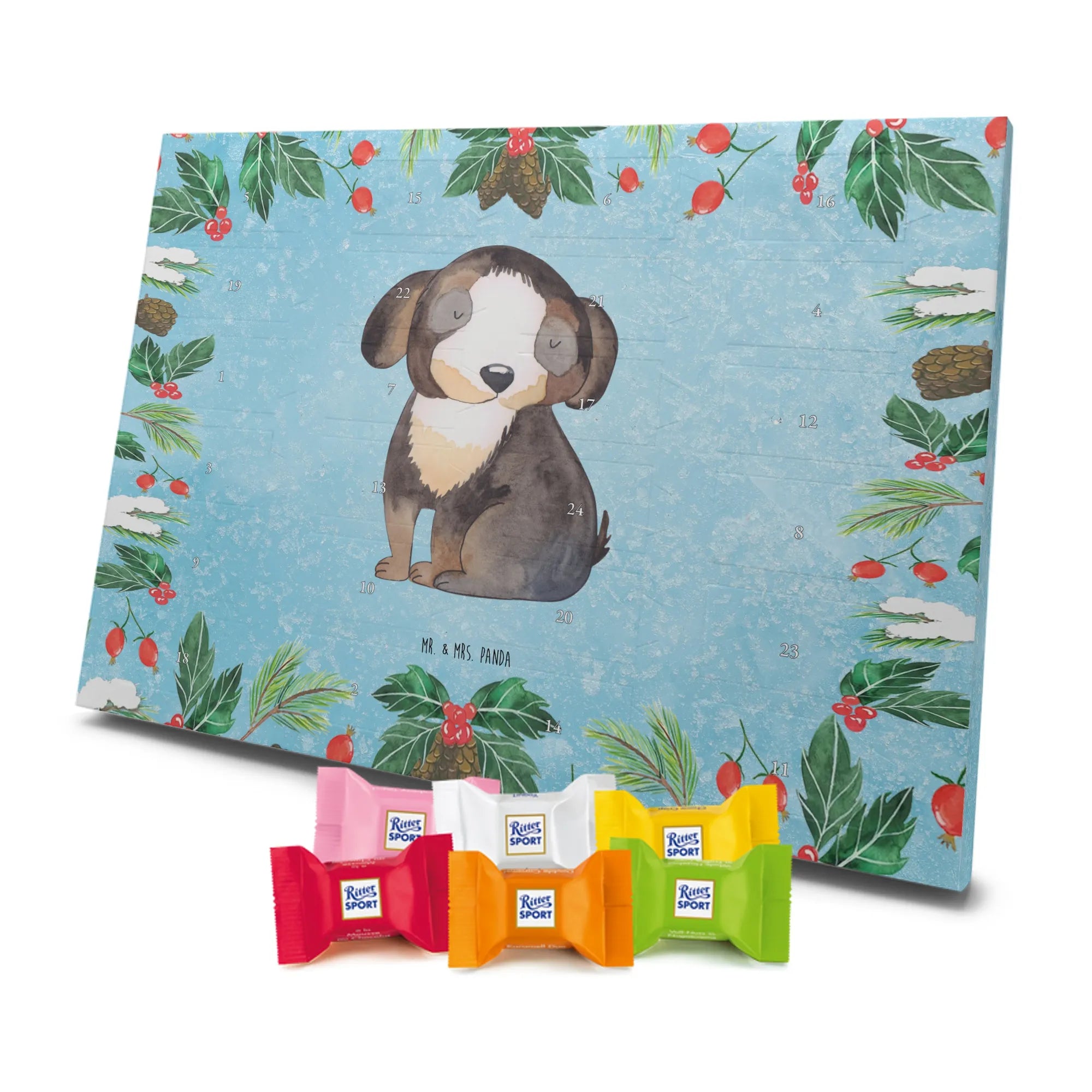 Adventskalender Schokolade von Mr. & Mrs. Panda – eine liebevolle Kombination aus hübschem Design und süßem Inhalt. Der Kalender ist bedruckt mit wunderschönen Motiven & Sprüchen von Mr. & Mrs. Panda und besticht durch brillante Druckqualität mit seidenmatter Oberflächenveredelung. Die Seitenflächen sind ebenfalls bedruckt, wodurch der Kalender rundum ein Hingucker ist. Er ist nicht personalisierbar. Maße: 325 mm x 225 mm x 27 mm. Besonders praktisch: Du kannst ihn sowohl aufgehängt als auch aufgestellt nutzen, je nachdem, wo er bei dir am schönsten wirkt. Gefüllt ist der Kalender mit Ritter Sport Schokowürfeln in verführerischen Sorten – Mousse au Chocolat, Schoko Crisp, Voll-Nuss in Nougatcreme, Karamell Duo, Joghurt und Erdbeer-Joghurt. Wichtiger Hinweis: Es handelt sich um einen Kalender gefüllt mit Ritter Sport Schokolade, nicht um einen Kalender der Marke Ritter Sport. Schenke deinen Liebsten oder dir selbst tägliche Schokoglücksmomente mit diesem charmanten Adventskalender.