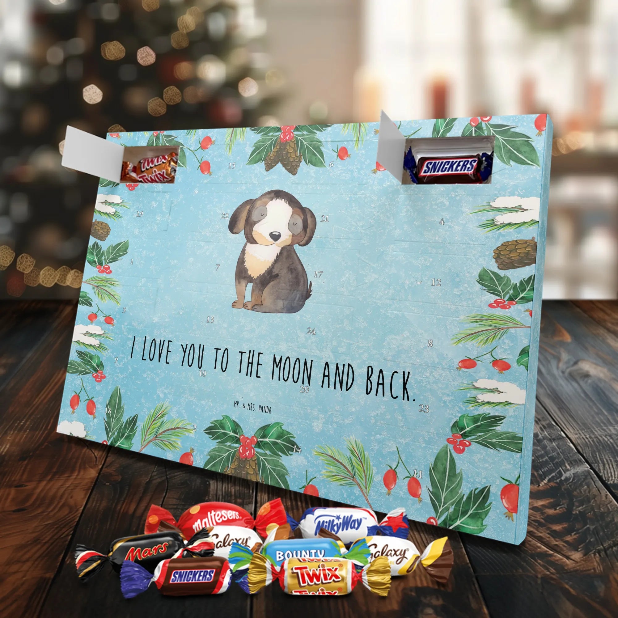 Unser Schoko Adventskalender von Mr. & Mrs. Panda bringt dir und deinen Lieben jede Menge Vorfreude und zauberhafte Momente in die Adventszeit. Der Kalender ist liebevoll bedruckt mit wunderschönen Motiven und frechen Sprüchen im typischen Mr. & Mrs. Panda Stil – ein echter Blickfang auf dem Tisch oder an der Wand. Die brillante Druckqualität kombiniert mit einer seidenmatten Oberflächenveredelung sorgt für edle Farben und ein angenehmes Gefühl beim Anfassen. Auch die Seitenflächen sind bedruckt, sodass der Kalender von allen Seiten hübsch aussieht. Er ist nicht personalisierbar, dafür aber in seiner Gestaltung rundum stimmig. Gefüllt ist der Adventskalender mit 24 hochwertigen Celebrations-Füllungen in acht verschiedenen Sorten: Maltesers, Mars, Snickers, Twix, Milky Way, Bounty, Galaxy und Galaxy Caramel — so ist für jede Naschkatze etwas dabei. Die Besonderheit: Du kannst den Kalender entweder aufstellen oder dank rückseitiger Aufhängung an die Wand hängen. Maße: 325 mm x 225 mm x 27 mm. Ein liebevolles Geschenk für Familie, Freunde oder einfach für dich selbst, das kleine tägliche Glücksmomente schenkt und die Adventszeit versüßt.