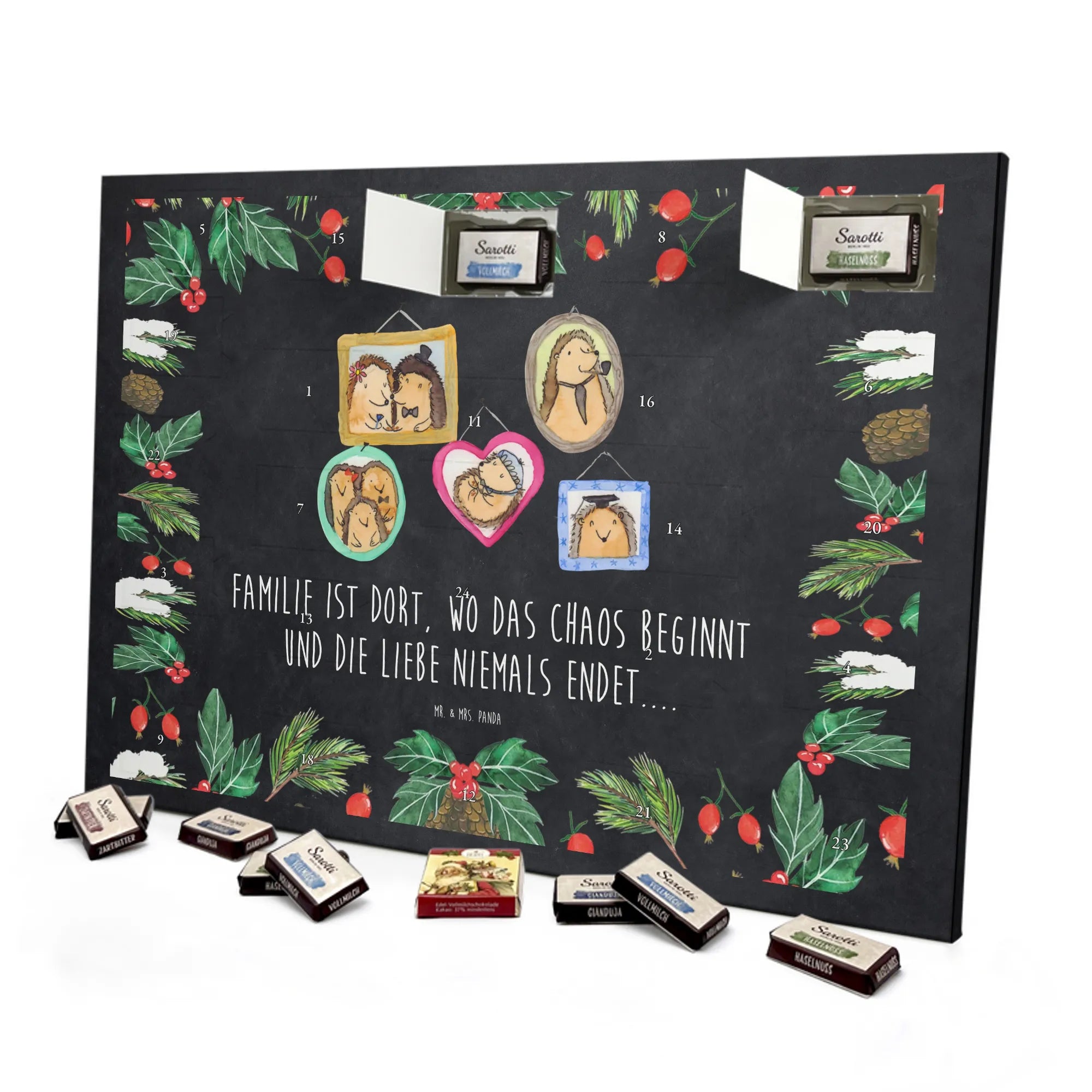 Mr. & Mrs. Panda Schoko Adventskalender „Igel Familie“ 🎄🍫 – ein zauberhafter Schokoladen Adventskalender, der Familie, Liebe und Zusammenhalt in den Mittelpunkt stellt. Das Motiv zeigt eine liebevoll gezeichnete Igelfamilie in fünf Rahmen: Hochzeit, Kuscheln, Einzelporträt mit Pfeife, Herz-Rahmen und Abschlussfeier. Der fröhliche Spruch „Familie ist dort, wo das Chaos beginnt und die Liebe niemals endet....“ macht den Kalender besonders emotional und herzlich.