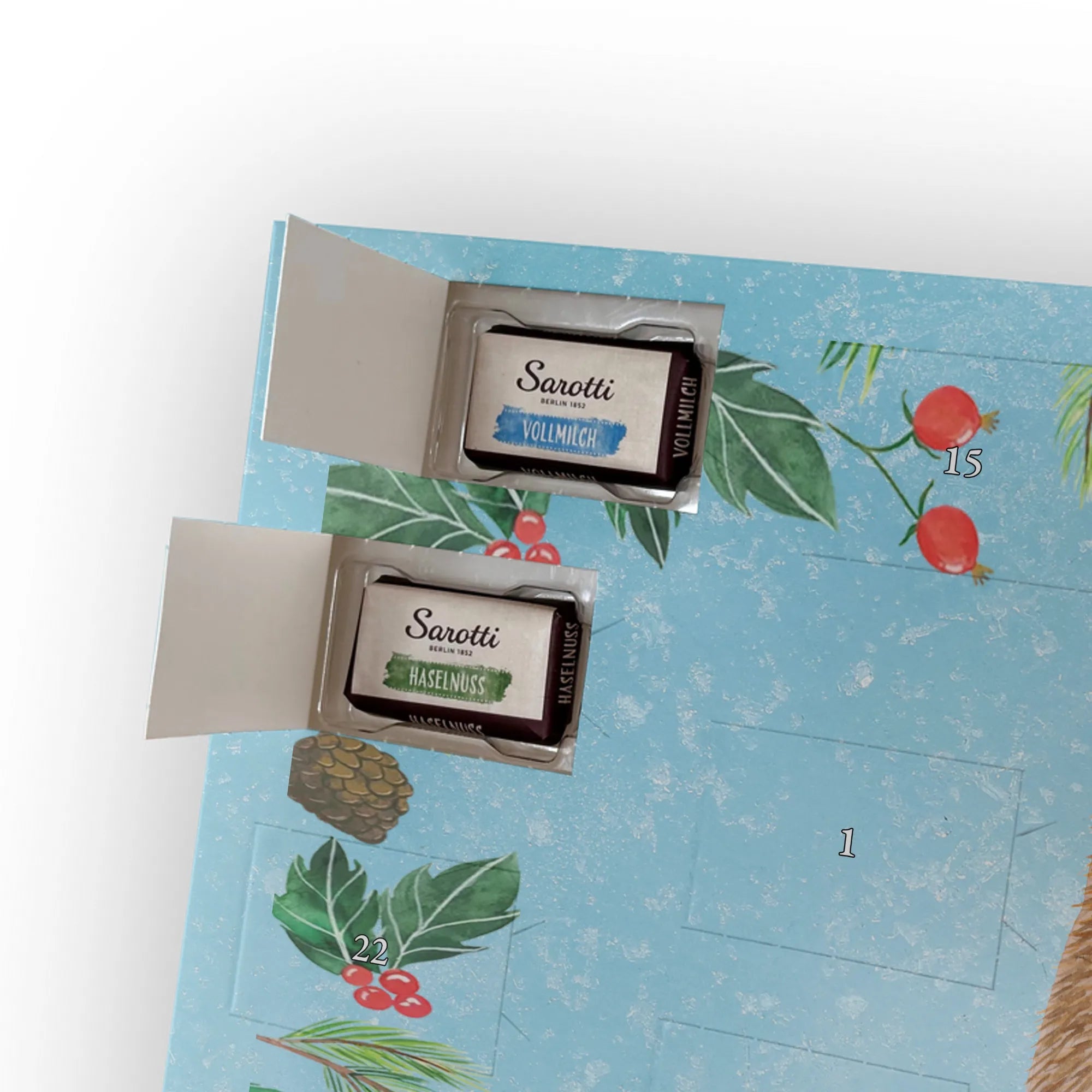 🐼 SCHOKOLADEN-ADVENTSKALENDER: Edler, seidenmatter Druck mit liebevollen Illustrationen.