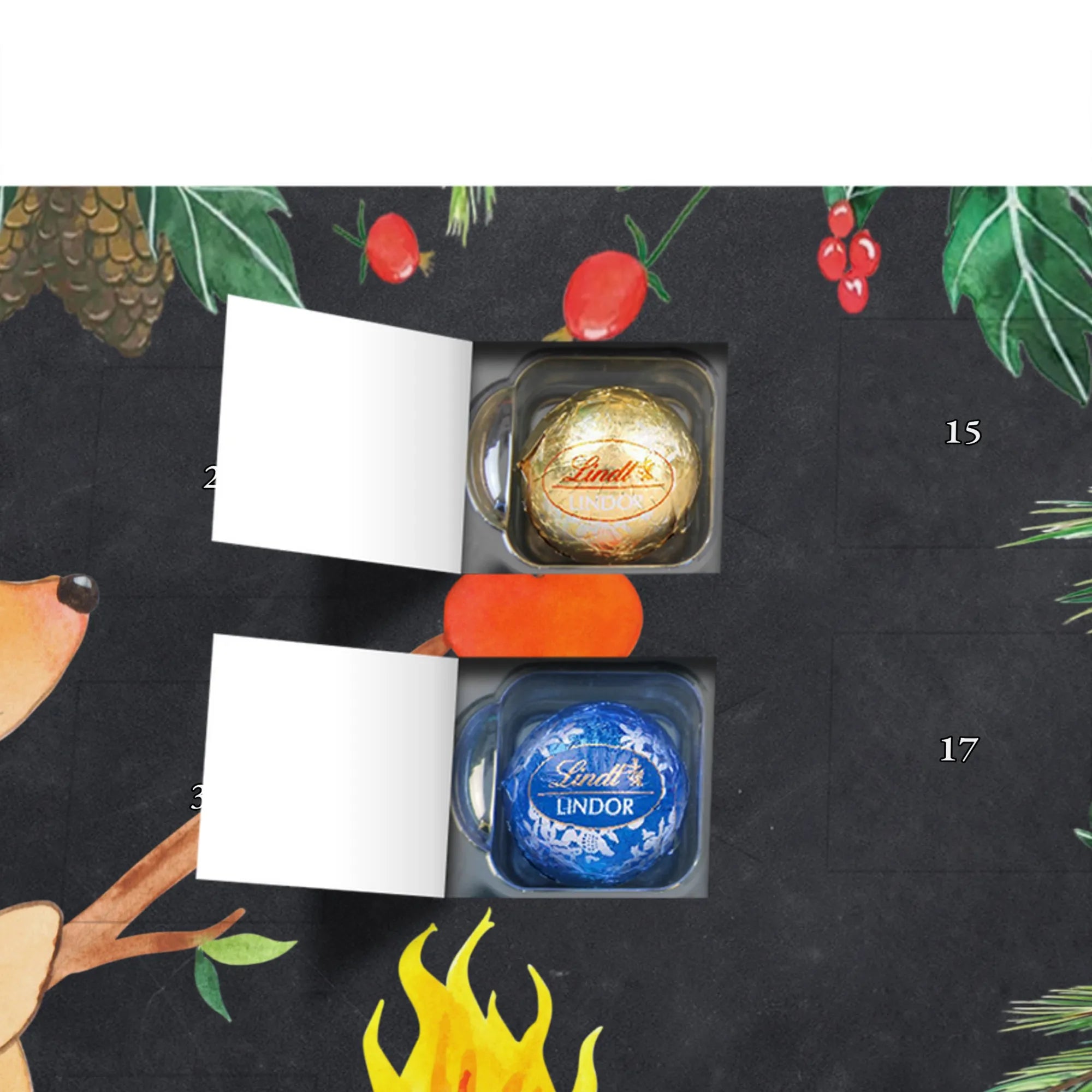 Unser zauberhafter Schoko Adventskalender von Mr. & Mrs. Panda bringt dir die süßeste Vorfreude auf Weihnachten! Dieser liebevoll gestaltete Adventskalender ist bedruckt mit wunderschönen Motiven & Sprüchen von Mr. & Mrs. Panda und ist nicht personalisierbar – dafür aber ein perfektes Geschenk für Freunde und Familie. Brillante Druckqualität mit seidenmatter Oberflächenveredelung sorgt für ein edles Finish, und die bedruckten Seitenflächen machen den Kalender von allen Seiten zu einem Hingucker. Maße: 233 mm x 178 mm x 24 mm. Besonderheit: kann aufgehängt oder aufgestellt werden, je nachdem, wie du ihn präsentieren möchtest. Gefüllt mit Lindt Lindor: 24 einzeln verpackte Markenschokoladen Kugeln in drei verschiedenen Sorten – Vollmilch, Feinherb und Weiße Schokolade – sorgen für abwechslungsreichen Genuss in der Adventszeit. Zutaten: Zucker, pflanzliches Fett (Kokosnuss, Palmkern), Kakaobutter, Vollmilchpulver, Kakaomasse, Milchzucker, Magermilchpulver, Butterreinfett, Emulgator (Sojalecithin), Gerstenmalzextrakt, Aromen. Besondere Hinweise: Kann Haselnüsse und Mandeln enthalten. Unser Schoko Adventskalender verbindet niedliches Design mit hochwertiger Füllung – ideal zum Verschenken oder selbst Naschen. Mr. & Mrs. Panda wünschen dir eine fröhliche und leckere Adventszeit!