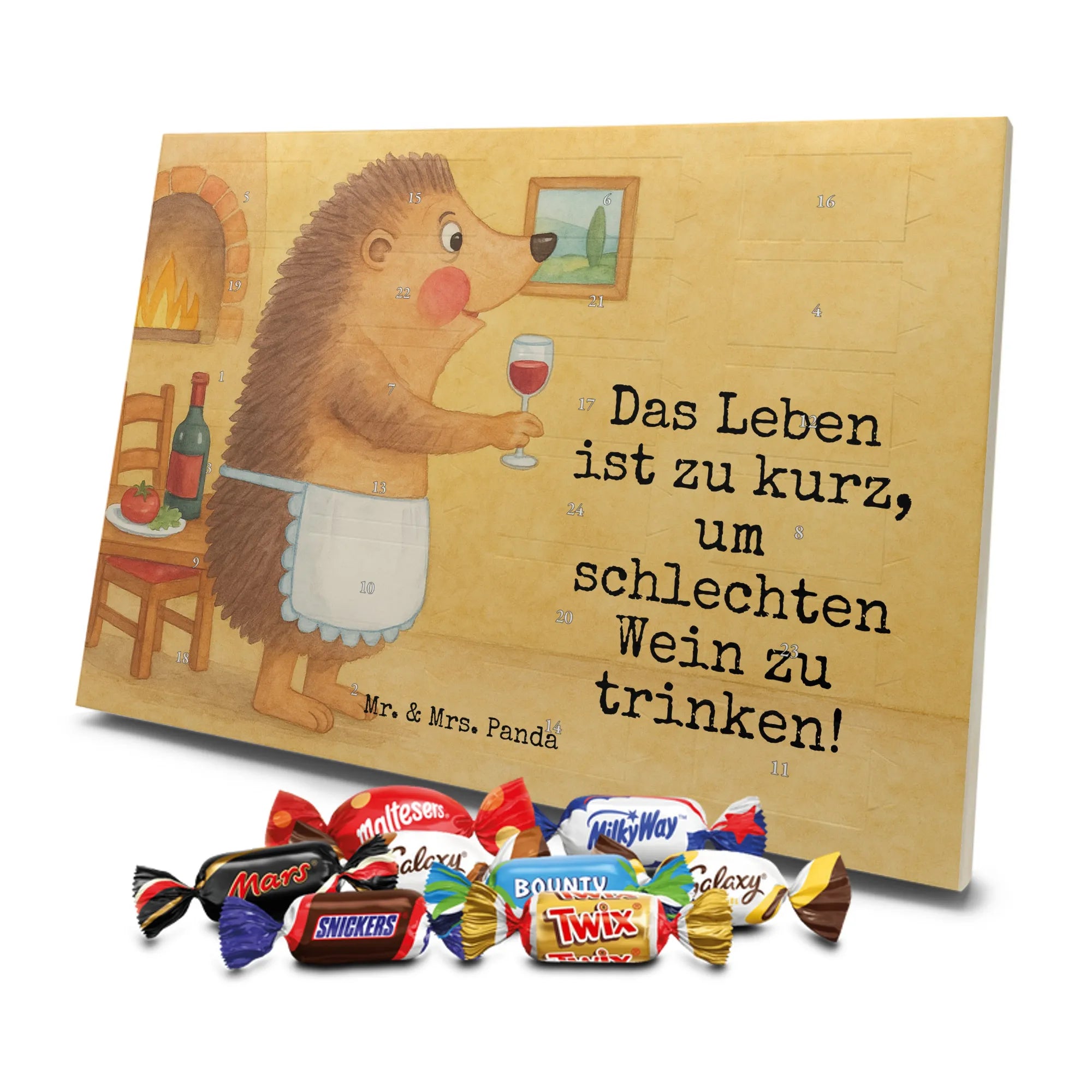 Unser entzückender Schokoladen Adventskalender von Mr. & Mrs. Panda ist das perfekte Highlight für die Adventszeit. Bedruckt mit wunderschönen Motiven & Sprüchen von Mr. & Mrs. Panda zaubert er dir ein Lächeln an jedem Tag im Dezember. Der Kalender ist nicht personalisierbar, überzeugt aber durch brillante Druckqualität mit seidenmatter Oberflächenveredelung und sorgsame bedruckte Seitenflächen. Die stabile Verarbeitung macht ihn zu einem dekorativen Hingucker. Maße: 325 mm x 225 mm x 27 mm. Besonders praktisch: Er kann aufgehängt oder aufgestellt werden, ganz nach deinem Geschmack und Platzangebot. Gefüllt ist der Adventskalender mit Ritter Sport Schokowürfeln – in verführerischen Sorten wie Mousse au Chocolat, Schoko Crisp, Voll-Nuss in Nougatcreme, Karamell Duo, Joghurt und Erdbeer-Joghurt. Wichtiger Hinweis: Es handelt sich um einen Kalender gefüllt mit Ritter Sport Schokolade, nicht um einen Kalender der Marke Ritter Sport. Schenk ihn Freunden, der Familie oder gönn dir selbst eine süße Vorfreude: kleine Schokoladenmomente, liebevoll verpackt von Mr. & Mrs. Panda.