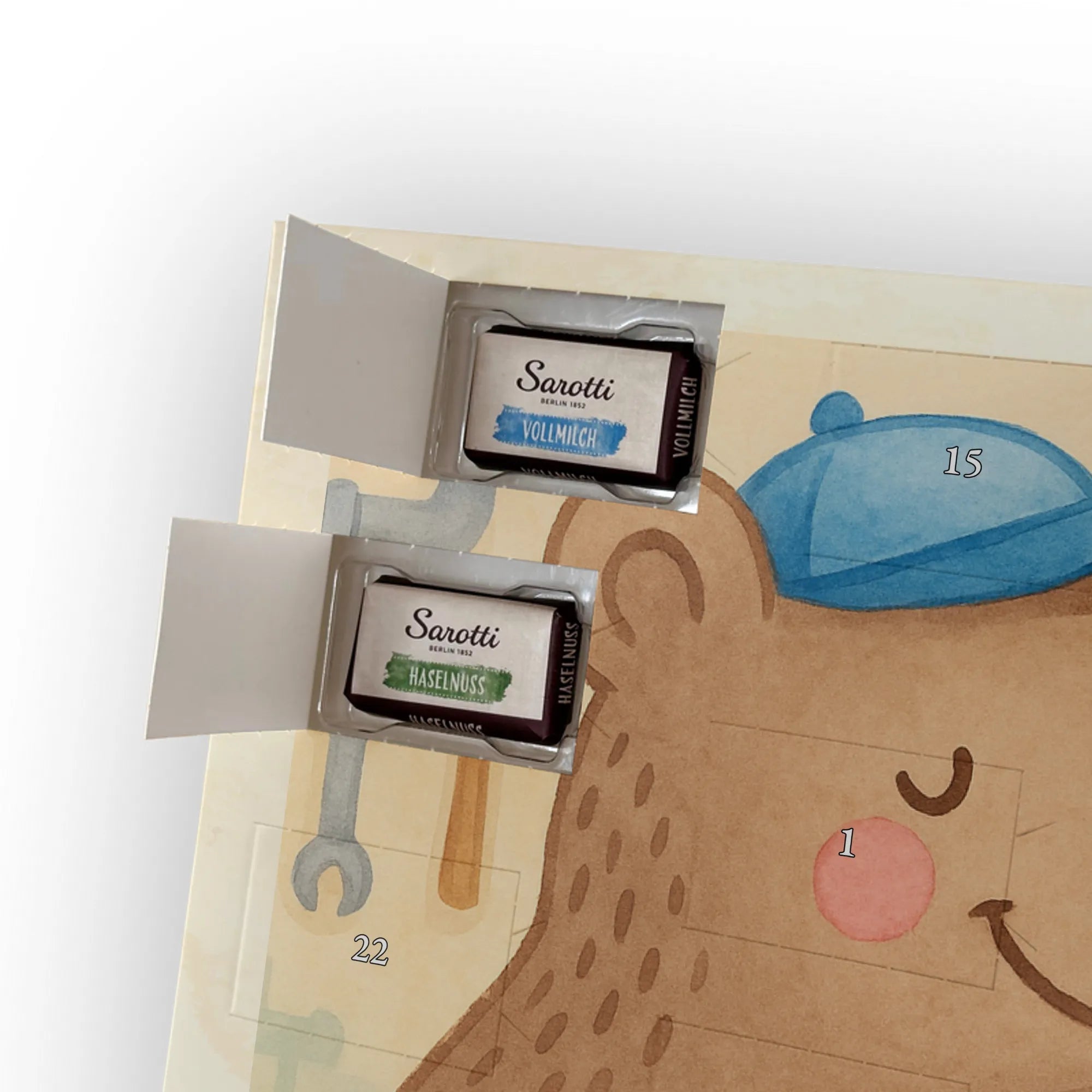 🐼 Schoko-Adventskalender: Liebevolles Design, seidenmatt, brillanter Druck – ein Hingucker.