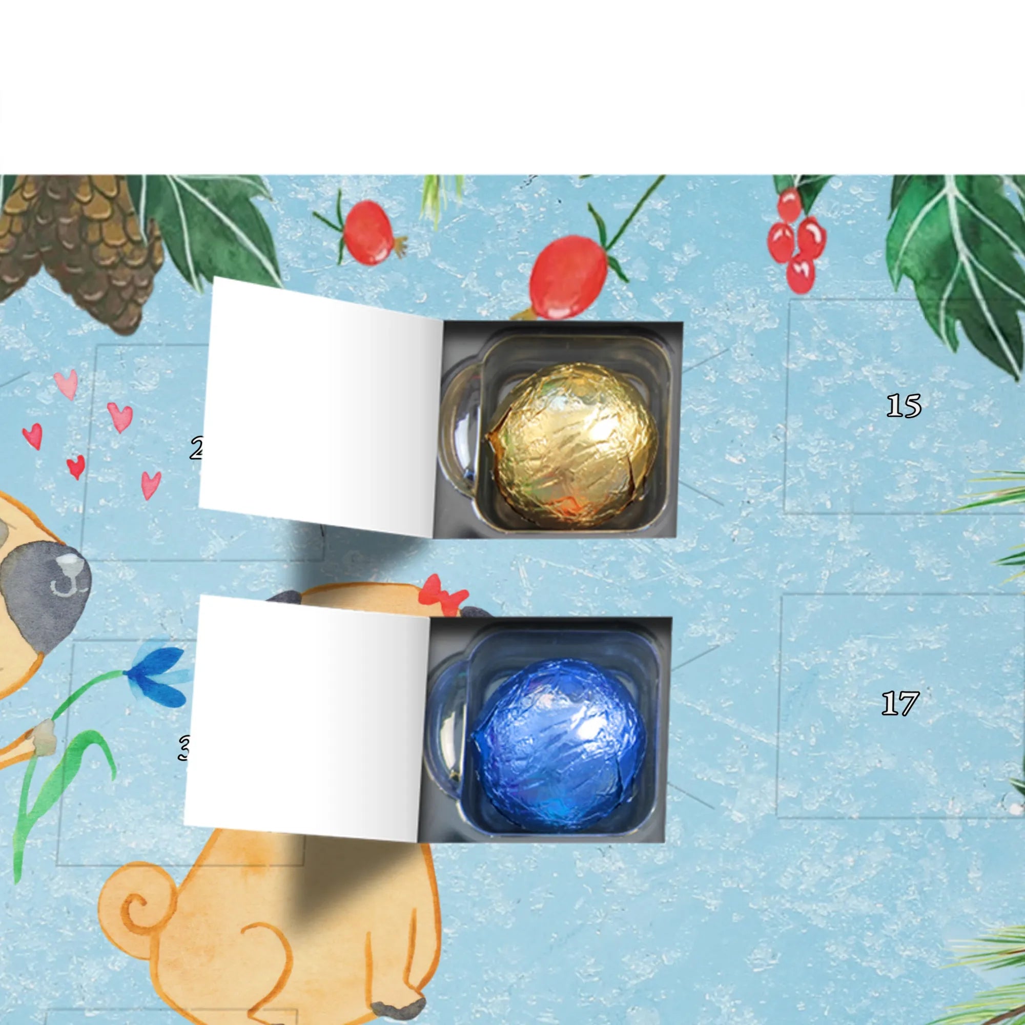 Wunderschöner Schokoladen-Adventskalender von Mr. & Mrs. Panda – süßes Design trifft hochwertige Verarbeitung. Unser Schokoladen-Adventskalender ist bedruckt mit wunderschönen Motiven & Sprüchen von Mr. & Mrs. Panda und nicht personalisierbar, dafür aber mit liebevollen Details gestaltet. Die brillante Druckqualität mit seidenmatter Oberflächenveredelung verleiht dem Kalender ein edles Finish, und auch die Seitenflächen sind bedruckt für einen rundum stimmigen Look. Maße: 233 mm x 178 mm x 24 mm. Die Konstruktion erlaubt sowohl das Aufstellen als auch das Aufhängen – Besonderheit: kann aufgehängt oder aufgestellt werden. Gefüllt mit MARKENNAMEN Schokolade und mit leckeren Schokoladenkugeln bestückt, ist jeder Dezembertag eine kleine Belohnung. Bitte lies die besonderen Hinweise: (Kann Spuren von Haselnüssen, Mandeln, Gluten und Soja enthalten!), kühl und trocken lagern. Ideal als Geschenk, Adventsdekoration oder süße Überraschung für Freunde und Familie. Mr. & Mrs. Panda wünscht dir eine gemütliche und genussvolle Adventszeit!