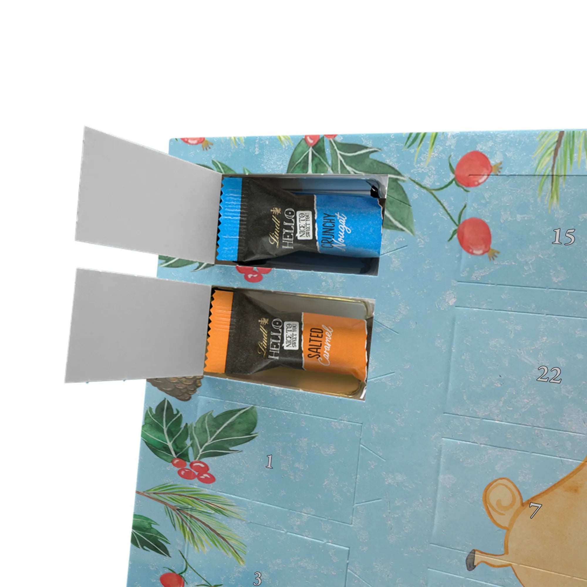 Unser Adventskalender mit Schokolade von Mr. & Mrs. Panda ist die perfekte Mischung aus süßem Genuss und hübschem Design. Bedruckt mit liebevollen Motiven und kurzen Sprüchen, bringt dieser Adventskalender Freude in jeden Raum. Er ist nicht personalisierbar, überzeugt jedoch durch eine brillante Druckqualität und eine seidenmatte Oberflächenveredelung. Die Seitenflächen sind ebenfalls bedruckt, was dem Kalender ein rundes, hochwertiges Erscheinungsbild verleiht. Maße: 325 mm x 225 mm x 27 mm. Die Besonderheit: Du kannst ihn sowohl aufhängen als auch aufstellen – flexibel je nach Platz und Stimmung. Gefüllt mit Lindt Hello Schokolade: 24 einzeln verpackte Mini Sticks in vier verführerischen Sorten – Karamell-Schokoladenkuchen, Kekse, Knuspriger Nougat und Erdbeer-Cheesecake. Zutaten umfassen u. a. Zucker, Kakaomasse, Vollmilchpulver, Palmöl und Haselnüsse; Allergene: Milcheiweiß, Milchzucker, Soja, Weizen, Haselnüsse; kann Mandeln und andere Schalenfrüchte enthalten. Ideal zum Verschenken oder selbst Genießen – jeden Tag ein kleines Highlight in der Vorweihnachtszeit.