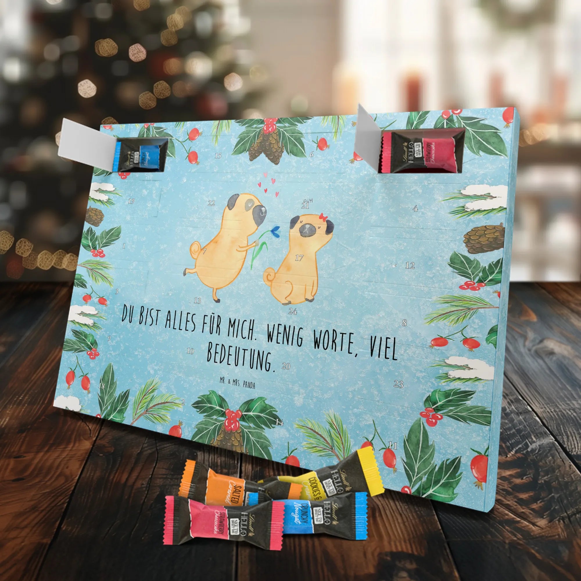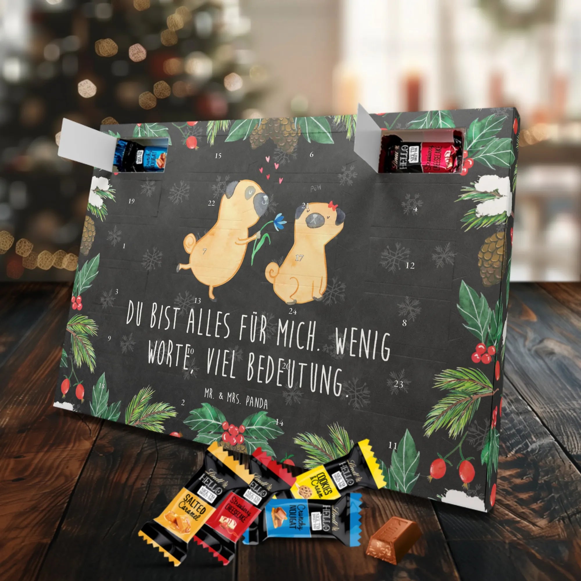 Wunderschöner Schoko Adventskalender von Mr. & Mrs. Panda – perfekt, wenn du dir oder deinen Liebsten die Adventszeit mit süßen Überraschungen versüßen willst. Unser liebevoll gestalteter Schokoladen Adventskalender ist bedruckt mit bezaubernden Motiven und frechen Sprüchen von Mr. & Mrs. Panda und sorgt jeden Tag für ein Lächeln. Der Kalender ist nicht personalisierbar, dafür aber in brillanter Druckqualität mit seidenmatter Oberflächenveredelung gefertigt. Auch die Seitenflächen sind vollständig bedruckt, was dem Design noch mehr Tiefe verleiht. Maße: 325 mm x 225 mm x 27 mm. Besonders praktisch: Der Kalender kann aufgehängt oder aufgestellt werden – so findest du immer den idealen Platz bei dir zu Hause. Gefüllt mit Lindt Hello Schokolade: 24 einzeln verpackte Schokoladen Mini Sticks in vier verschiedenen Sorten – Karamell-Schokoladenkuchen, Kekse, Knuspriger Nougat und Erdbeer-Cheesecake. Zutaten und Allergene findest du auf der Verpackung; wichtige Hinweise: enthält Milcheiweiß, Milchzucker, Soja, Weizen und Haselnüsse, kann Mandeln und andere Schalenfrüchte enthalten. Dieser Adventskalender ist eine liebevolle Geschenkidee für Freunde, Familie und alle Schoko-Fans, die jeden Tag bis Weihnachten mit feinem Schoko-Genuss feiern möchten.