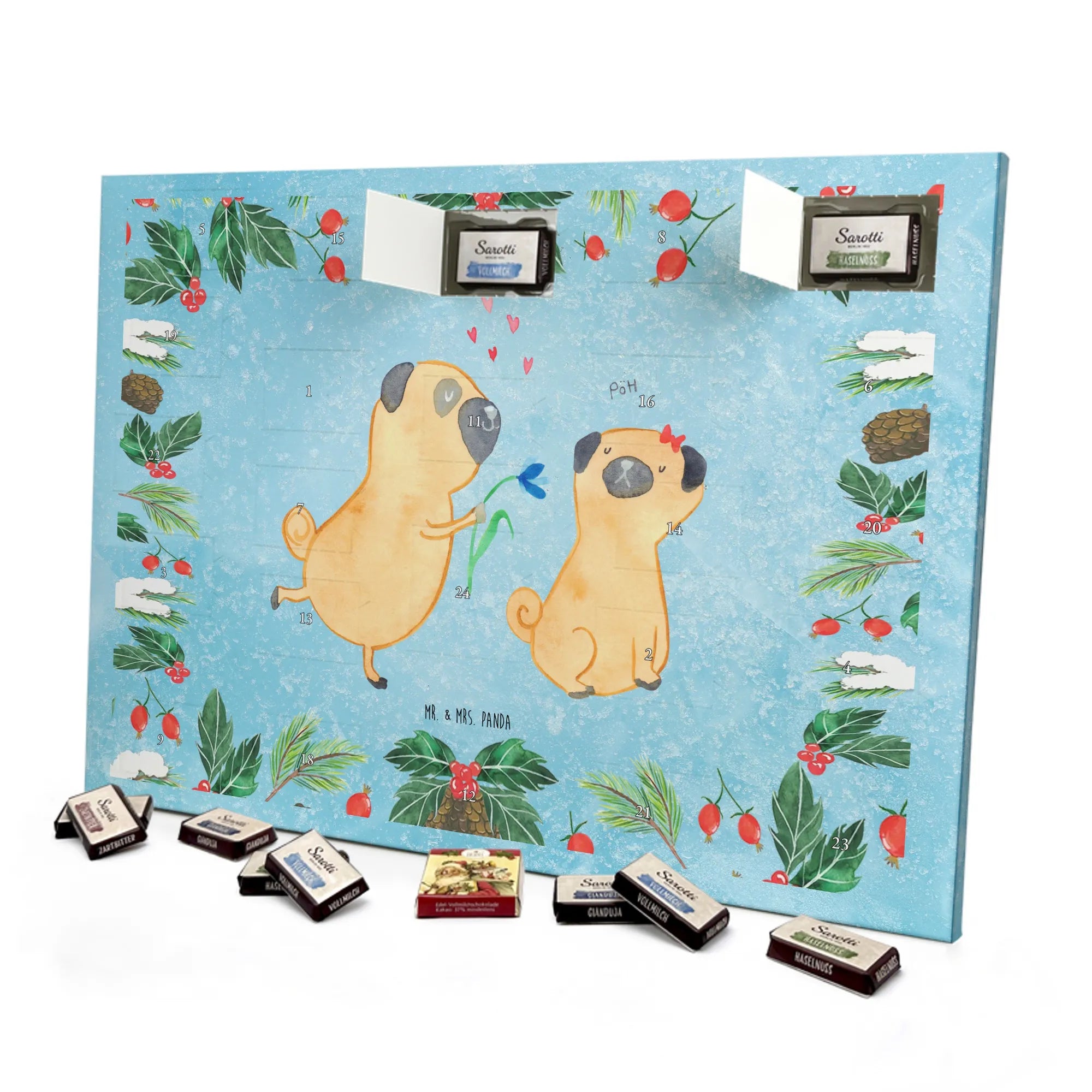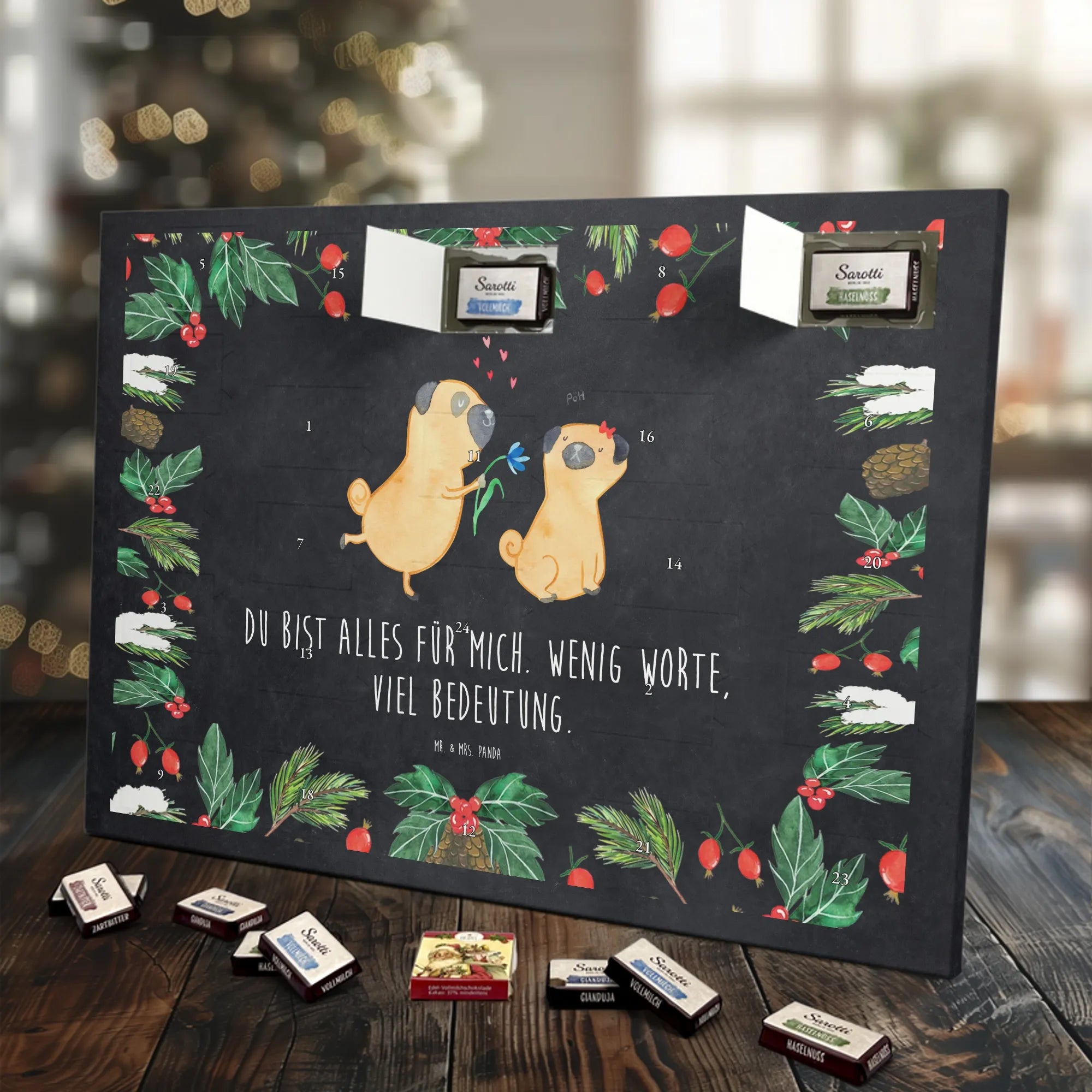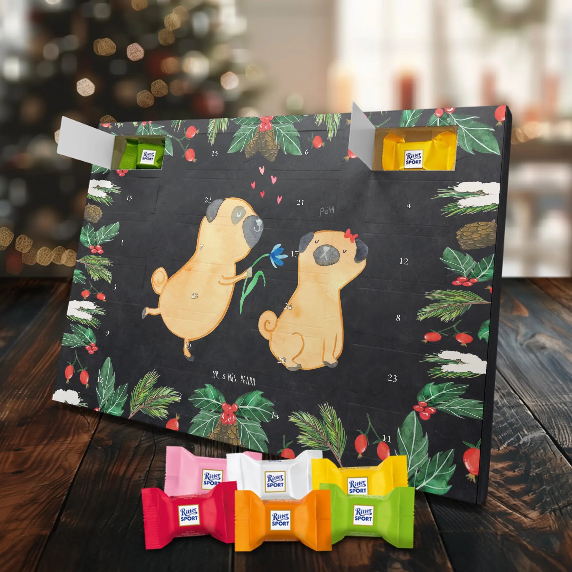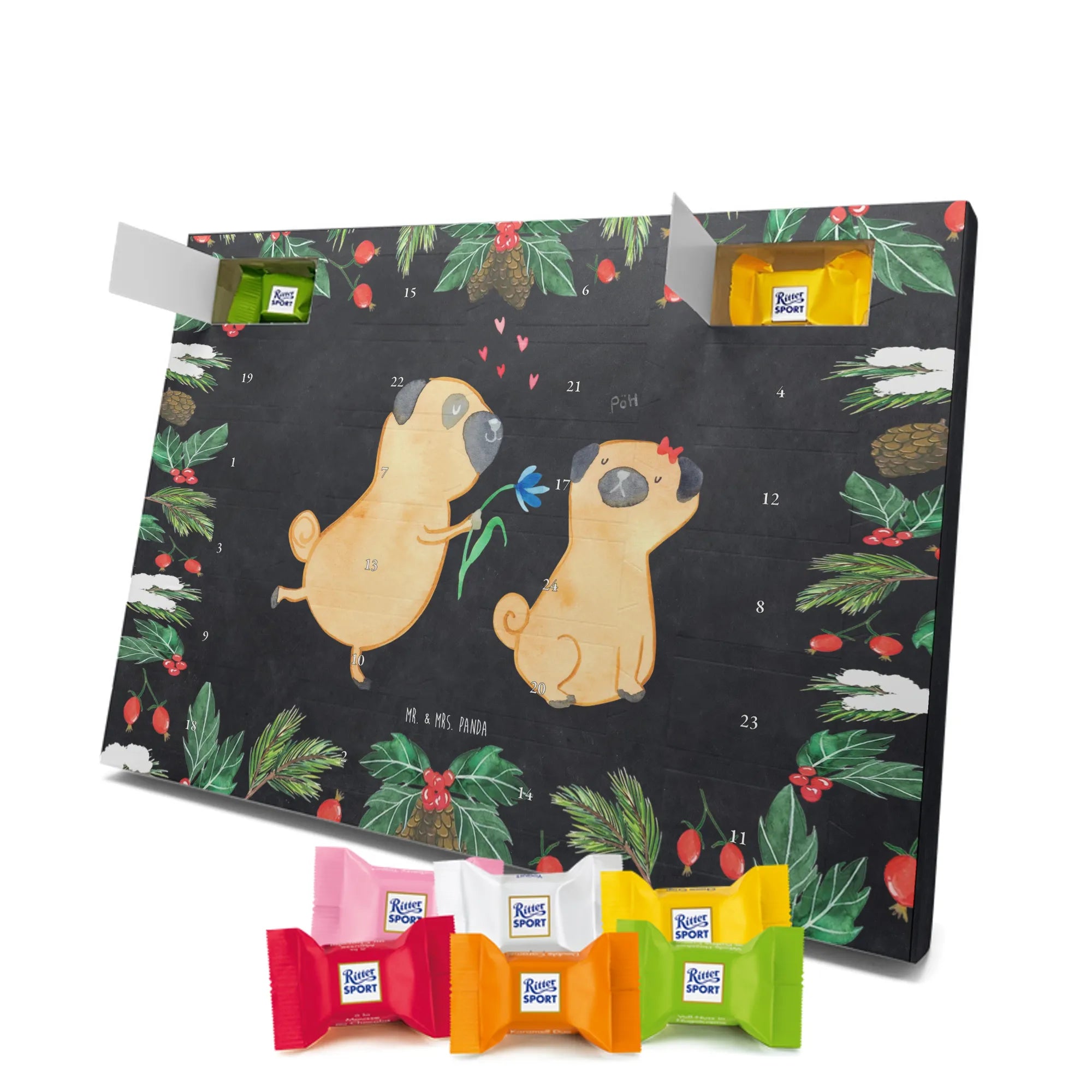 Adventskalender mit Schokolade – so schmeckt Vorfreude! Unser Mr. & Mrs. Panda Adventskalender ist liebevoll gestaltet und bedruckt mit wunderschönen Motiven & Sprüchen, die jeden Tag versüßen. Die brillante Druckqualität mit seidenmatter Oberflächenveredelung sorgt für ein edles Finish, und auch die Seitenflächen sind hübsch bedruckt. Der Kalender ist nicht personalisierbar, dafür aber vielseitig einsetzbar: Maße: 325 mm x 225 mm x 27 mm und die besondere Eigenschaft, dass du ihn aufgehängt oder aufgestellt verwenden kannst, geben dir Flexibilität bei der Dekoration. Gefüllt ist der Kalender mit Ritter Sport Schokowürfeln in beliebten Geschmacksrichtungen wie Mousse au Chocolat, Schoko Crisp, Voll-Nuss in Nougatcreme, Karamell Duo, Joghurt und Erdbeer-Joghurt. Wichtig: Es handelt sich um einen Kalender gefüllt mit Ritter Sport Schokolade, nicht um einen Kalender der Marke Ritter Sport. Ideal als Geschenk oder als Adventsdeko für dein Zuhause – kleine Schokofreuden warten hinter jedem Türchen.