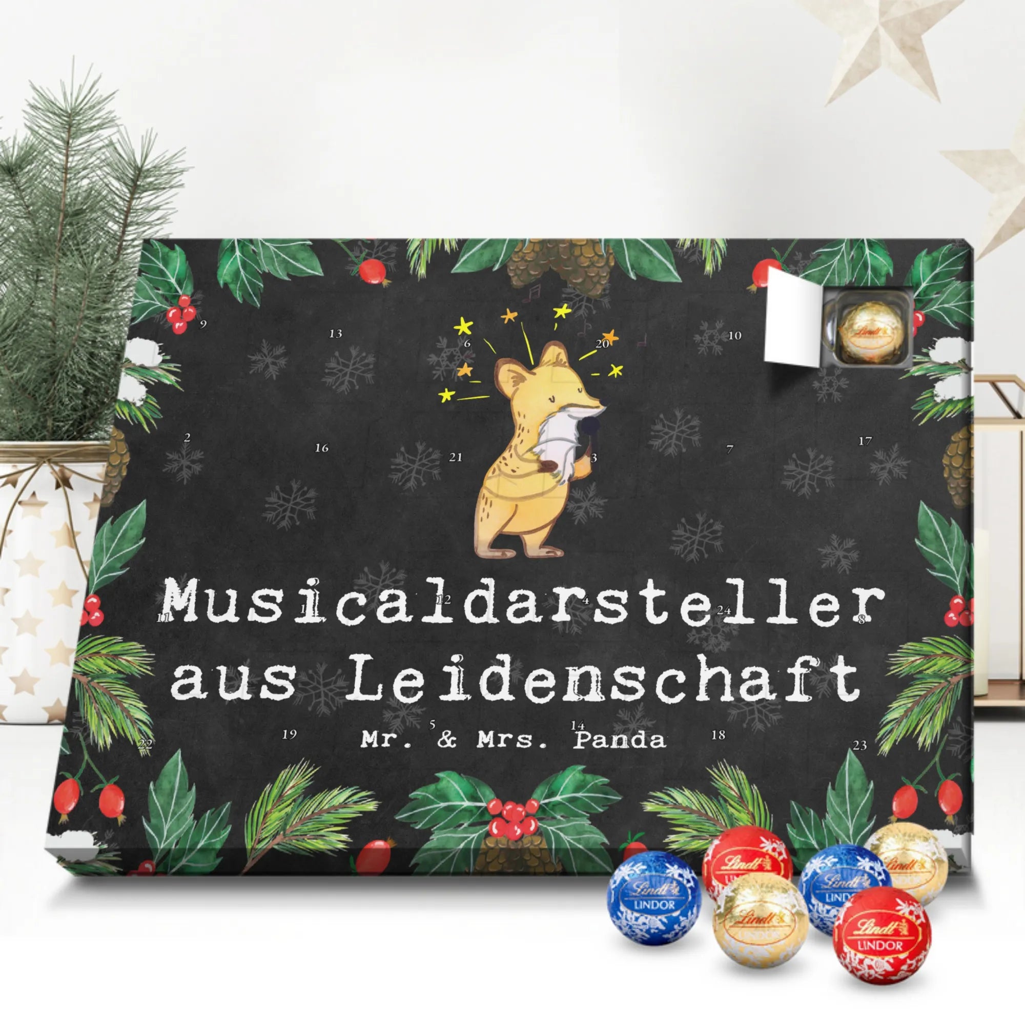 Wunderschöner Schokoladen-Adventskalender von Mr. & Mrs. Panda – süßes Design trifft hochwertige Verarbeitung. Unser Schokoladen-Adventskalender ist bedruckt mit wunderschönen Motiven & Sprüchen von Mr. & Mrs. Panda und nicht personalisierbar, dafür aber mit liebevollen Details gestaltet. Die brillante Druckqualität mit seidenmatter Oberflächenveredelung verleiht dem Kalender ein edles Finish, und auch die Seitenflächen sind bedruckt für einen rundum stimmigen Look. Maße: 233 mm x 178 mm x 24 mm. Die Konstruktion erlaubt sowohl das Aufstellen als auch das Aufhängen – Besonderheit: kann aufgehängt oder aufgestellt werden. Gefüllt mit MARKENNAMEN Schokolade und mit leckeren Schokoladenkugeln bestückt, ist jeder Dezembertag eine kleine Belohnung. Bitte lies die besonderen Hinweise: (Kann Spuren von Haselnüssen, Mandeln, Gluten und Soja enthalten!), kühl und trocken lagern. Ideal als Geschenk, Adventsdekoration oder süße Überraschung für Freunde und Familie. Mr. & Mrs. Panda wünscht dir eine gemütliche und genussvolle Adventszeit!