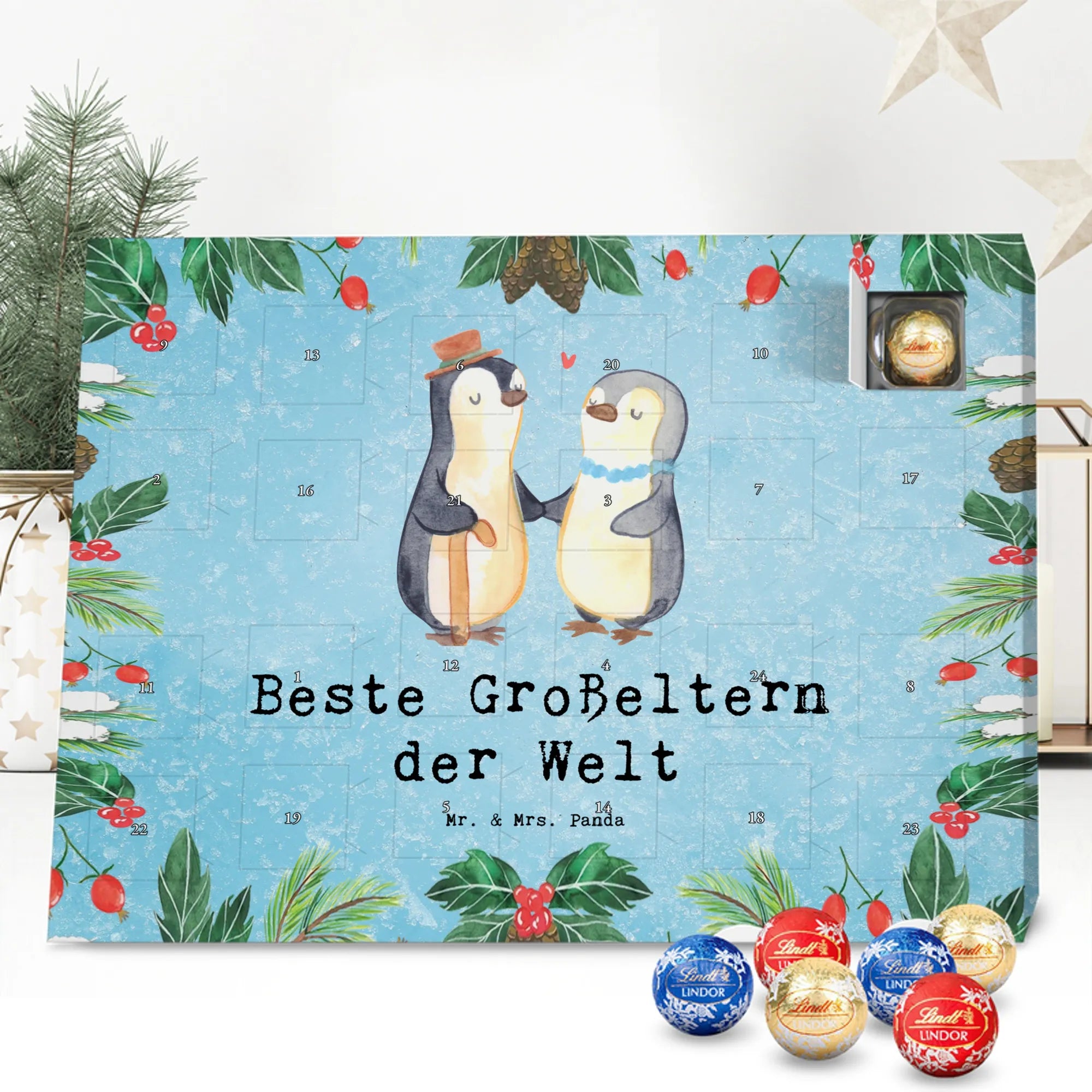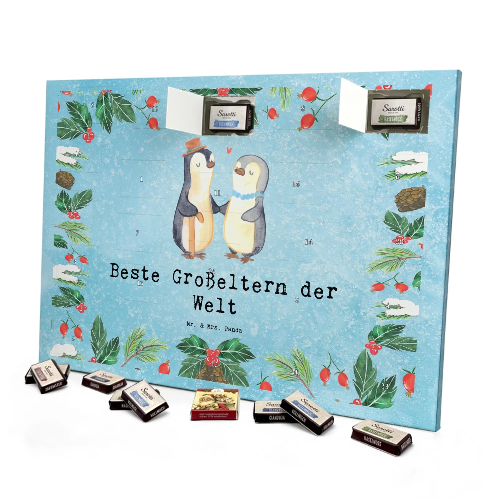 Verschenke jeden Dezember ein Lächeln – mit dem Schoko Adventskalender „Pinguin – Beste Großeltern der Welt“ von Mr. & Mrs. Panda. Dieses liebevoll illustrierte Motiv zeigt zwei herzige, ältere Pinguine, von denen einer einen Gehstock trägt. Der Spruch „Beste Großeltern der Welt“ macht den Kalender zur perfekten Geschenkidee für Oma und Opa, Omi und Opi oder als Mitbringsel von Enkelkindern. 🎁