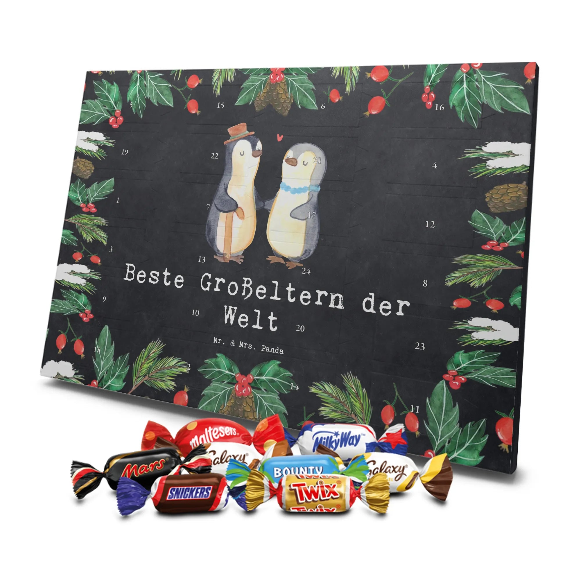 Unser Schoko Adventskalender von Mr. & Mrs. Panda bringt dir und deinen Lieben jede Menge Vorfreude und zauberhafte Momente in die Adventszeit. Der Kalender ist liebevoll bedruckt mit wunderschönen Motiven und frechen Sprüchen im typischen Mr. & Mrs. Panda Stil – ein echter Blickfang auf dem Tisch oder an der Wand. Die brillante Druckqualität kombiniert mit einer seidenmatten Oberflächenveredelung sorgt für edle Farben und ein angenehmes Gefühl beim Anfassen. Auch die Seitenflächen sind bedruckt, sodass der Kalender von allen Seiten hübsch aussieht. Er ist nicht personalisierbar, dafür aber in seiner Gestaltung rundum stimmig. Gefüllt ist der Adventskalender mit 24 hochwertigen Celebrations-Füllungen in acht verschiedenen Sorten: Maltesers, Mars, Snickers, Twix, Milky Way, Bounty, Galaxy und Galaxy Caramel — so ist für jede Naschkatze etwas dabei. Die Besonderheit: Du kannst den Kalender entweder aufstellen oder dank rückseitiger Aufhängung an die Wand hängen. Maße: 325 mm x 225 mm x 27 mm. Ein liebevolles Geschenk für Familie, Freunde oder einfach für dich selbst, das kleine tägliche Glücksmomente schenkt und die Adventszeit versüßt.
