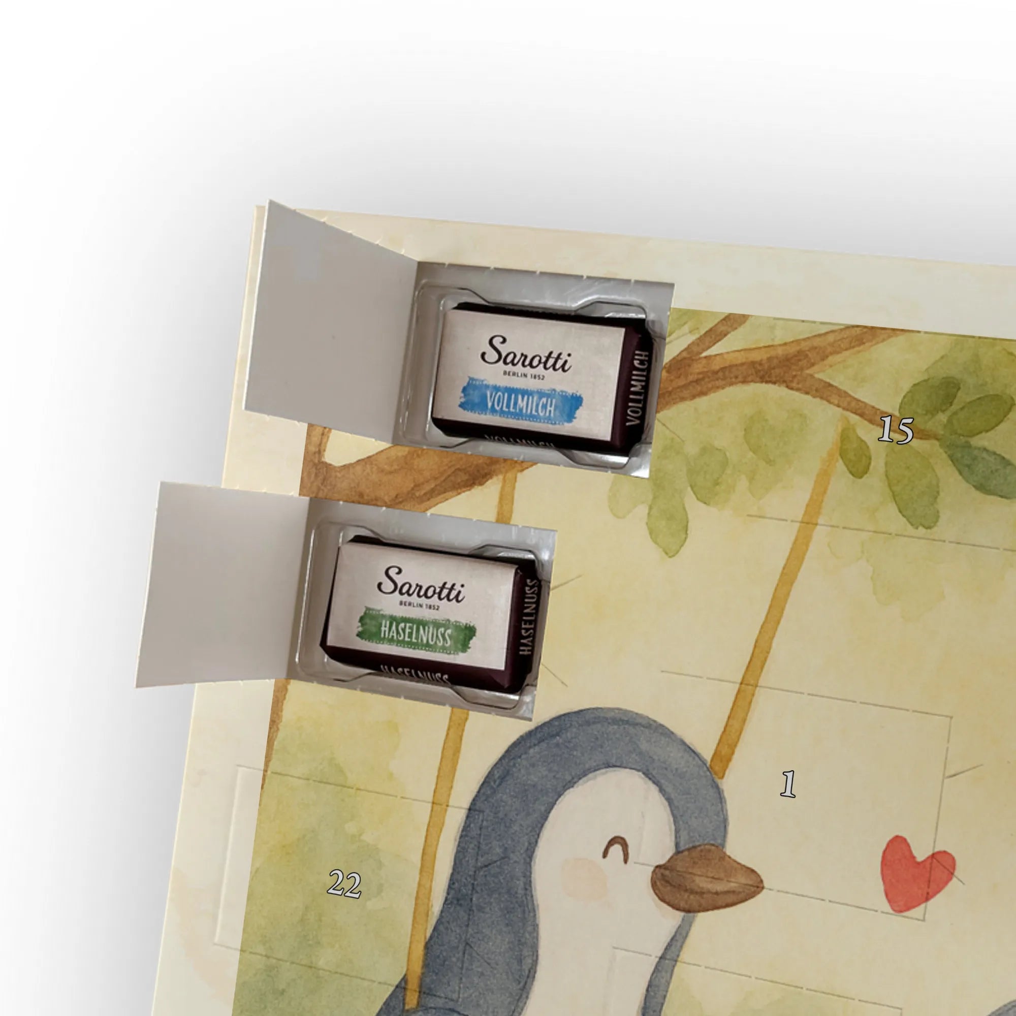 Mach die Vorweihnachtszeit besonders süß mit unserem Schoko-Adventskalender von Mr. & Mrs. Panda. Fröhliche Illustrationen und liebe Sprüche schmücken Vorder- und Seitenflächen, gedruckt in brillanter Qualität und veredelt mit einer seidenmatten Oberfläche für ein warmes, elegantes Finish. Der Kalender ist nicht personalisierbar, überzeugt dafür durch praktische Nutzung: zum Aufhängen oder Aufstellen geeignet. Hinter den 24 Türchen verbergen sich einzeln verpackte Schokoladentäfelchen in vier köstlichen Geschmacksrichtungen – Vollmilch, Nougat, Zartbitter und Haselnuss – von Sarotti® und Confiserie Heidel®. Insgesamt liefert der Kalender 107 g Markenschokolade. Maße: 355 mm x 245 mm x 11 mm – ideal, um Adventsfreude dekorativ zu präsentieren. Verschenke Liebe und Genuss in einem schönen Design, das sich wunderbar in jede Weihnachtsecke einfügt. Mr. & Mrs. Panda wünscht dir eine gemütliche Adventszeit voller kleiner, süßer Überraschungen.