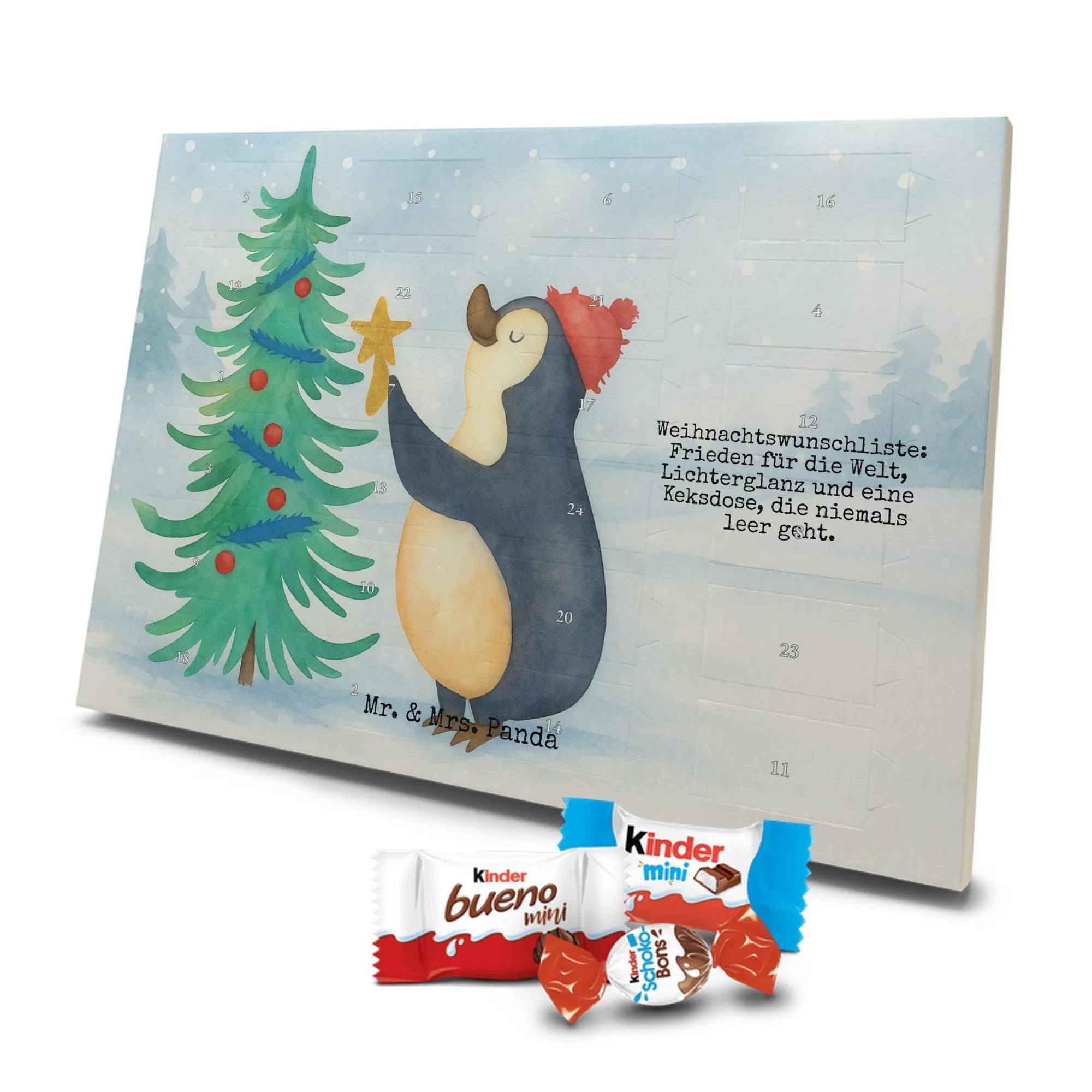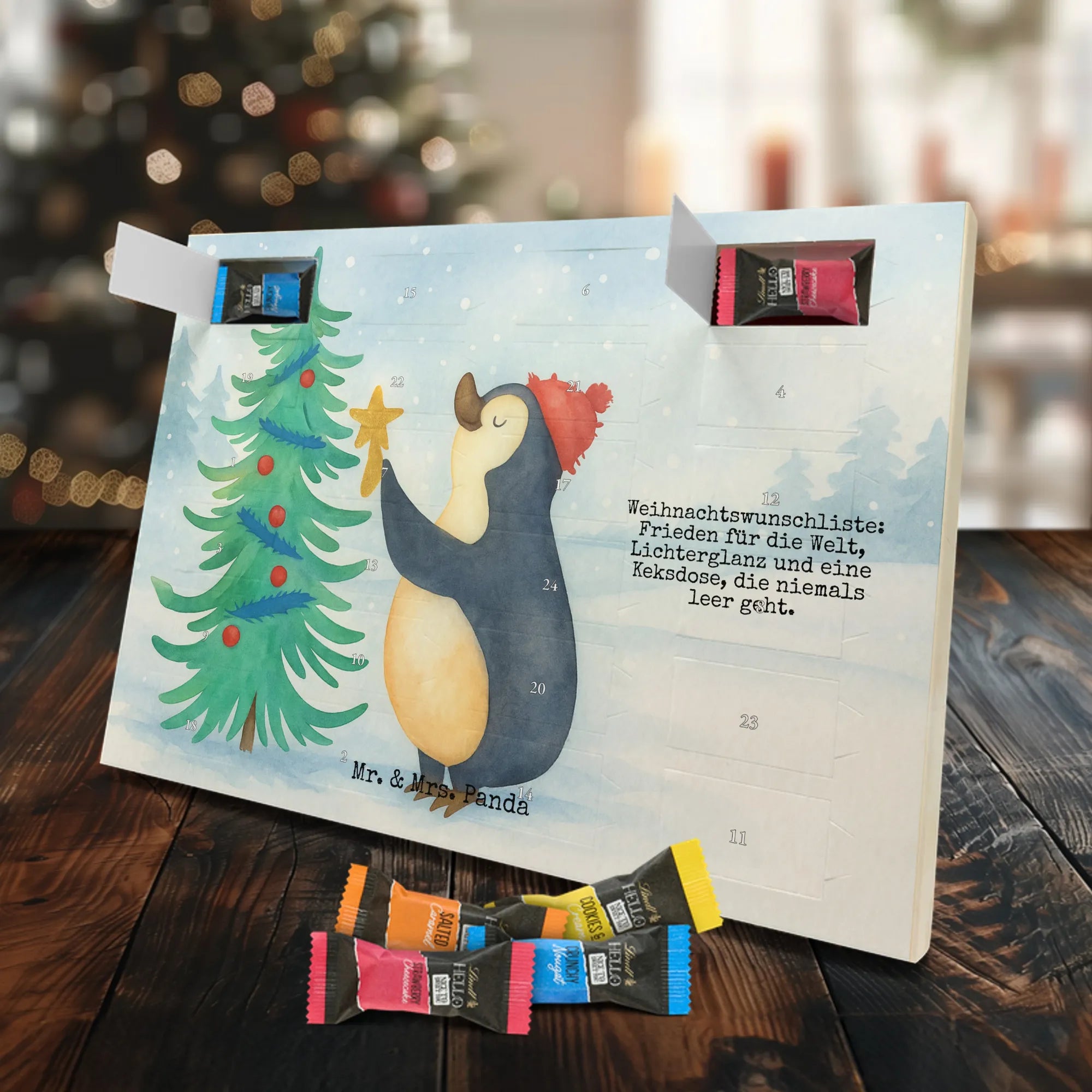 Dieser wunderschöne Schokoladen Adventskalender ist mit dem niedlichen Motiv 'Pinguin Weihnachtsbaum' aus unserer Winter Kollektion bedruckt. Ein kleiner Pinguin, der voller Eifer seinen Baum schmückt – man kann gar nicht anders, als zu lächeln! Das Motiv wurde, wie alle unsere Designs, von Mrs. Panda mit viel Liebe zum Detail handgezeichnet. Der begleitende Spruch 'Weihnachtswunschliste: Frieden für die Welt, Lichterglanz und eine Keksdose, die niemals leer geht.' macht diesen Weihnachtskalender Schoko zu einem ganz besonderen Herzensstück. ❤️