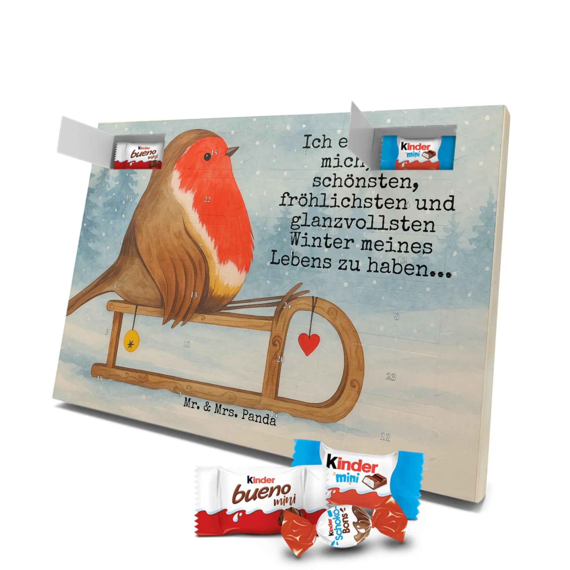 Unser Schokoladen Adventskalender von Mr. & Mrs. Panda bringt Charme und süße Überraschungen in deine Adventszeit. Liebevoll bedruckt mit wunderschönen Motiven & Sprüchen von Mr. & Mrs. Panda, ist dieser Kalender nicht personalisierbar, dafür aber mit hochwertiger Verarbeitung und stimmigem Design. Die brillante Druckqualität mit seidenmatter Oberflächenveredelung verleiht jedem Motiv eine edle Optik, und die bedruckten Seitenflächen runden das Gesamtbild ab. Maße: 355 mm x 245 mm x 11 mm. Eine praktische Besonderheit: kann aufgehängt oder aufgestellt werden – so passt er perfekt in jede Deko. Gefüllt mit Markenname Schokolade: Adventskalender gefüllt mit kinder® Schokolade. Inhalt: kinder® Schoko-Bons, kinder® Bueno mini und kinder® Schokolade mini. Mit 24 kleinen Leckereien hinter den Türchen ist dieser Kalender ideal für Kinder und alle Naschkatzen. Er eignet sich wunderbar als Adventsgeschenk oder als liebevolle Aufmerksamkeit für Kollegen und Freunde. Gönn dir oder anderen eine süße Adventszeit mit diesem bezaubernden Schokoladen Adventskalender!