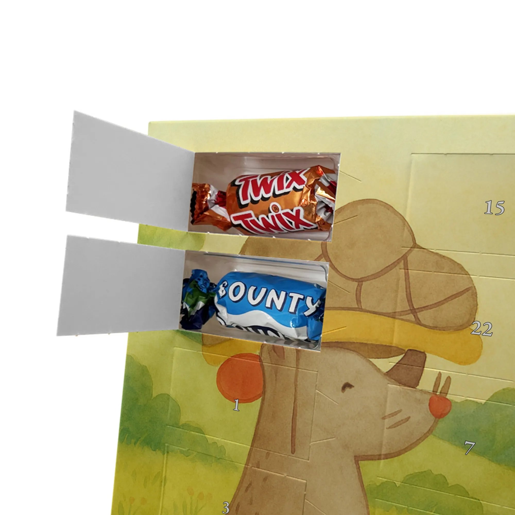 Unser Adventskalender mit Schokolade von Mr. & Mrs. Panda ist ein liebevoll gestaltetes Highlight für die Adventszeit. Die süßen Illustrationen und charmanten Sprüche sorgen für gute Stimmung bei Groß und Klein. Gedruckt in brillanter Qualität mit seidenmatter Oberflächenveredelung, wirken die Farben kräftig und edel; auch die Seitenflächen sind dekorativ bedruckt. Bitte beachten: Der Kalender ist nicht personalisierbar. Gefüllt ist er mit 24 Celebrations-Überraschungen in acht verschiedenen Sorten: Maltesers, Mars, Snickers, Twix, Milky Way, Bounty, Galaxy und Galaxy Caramel — perfekte Abwechslung für jeden Tag. Besonderheit: Du kannst den Kalender sowohl aufstellen als auch aufhängen. Maße: 325 mm x 225 mm x 27 mm. Schenke Vorfreude und kleine Genussmomente – ideal als Geschenk oder für deine eigene Adventszeit.