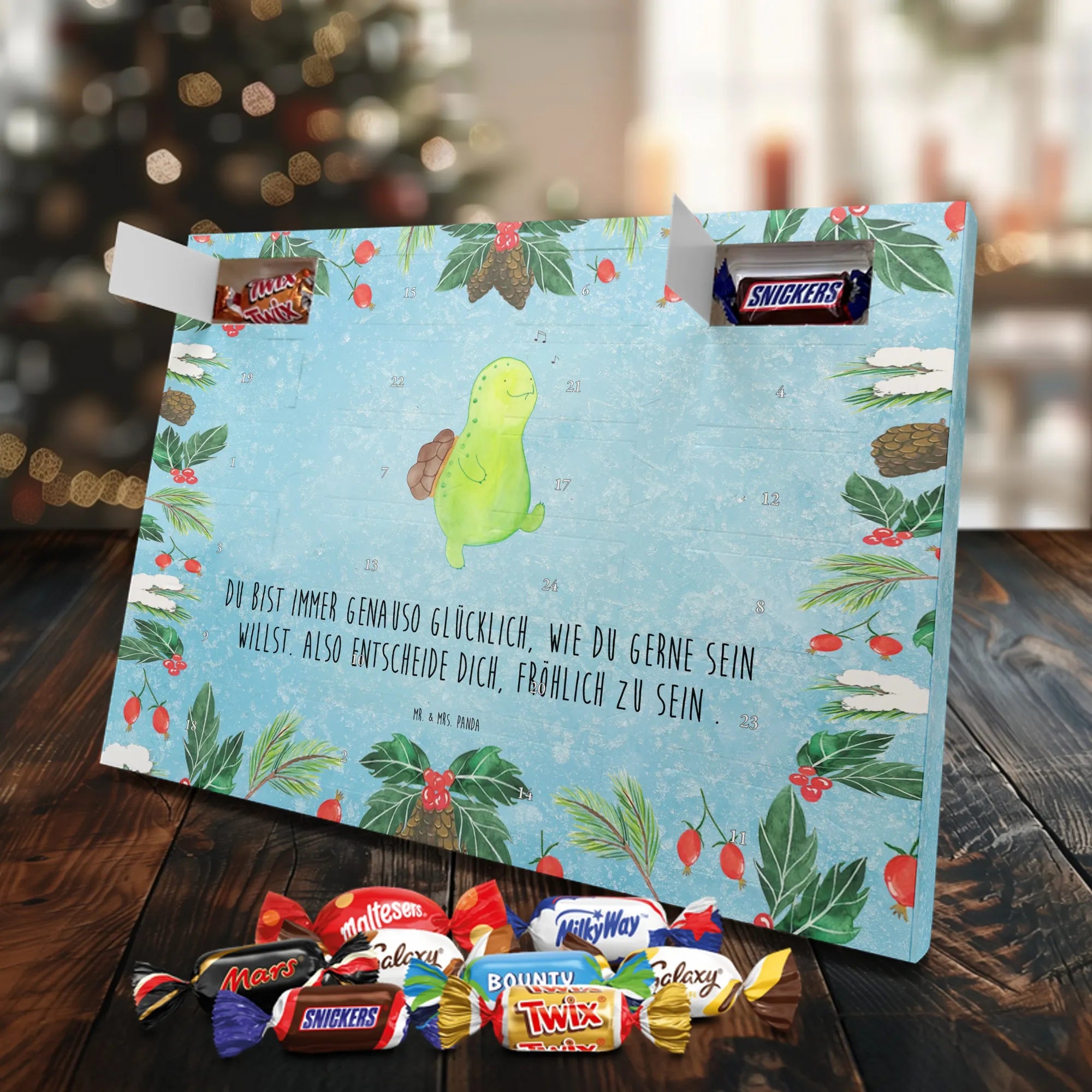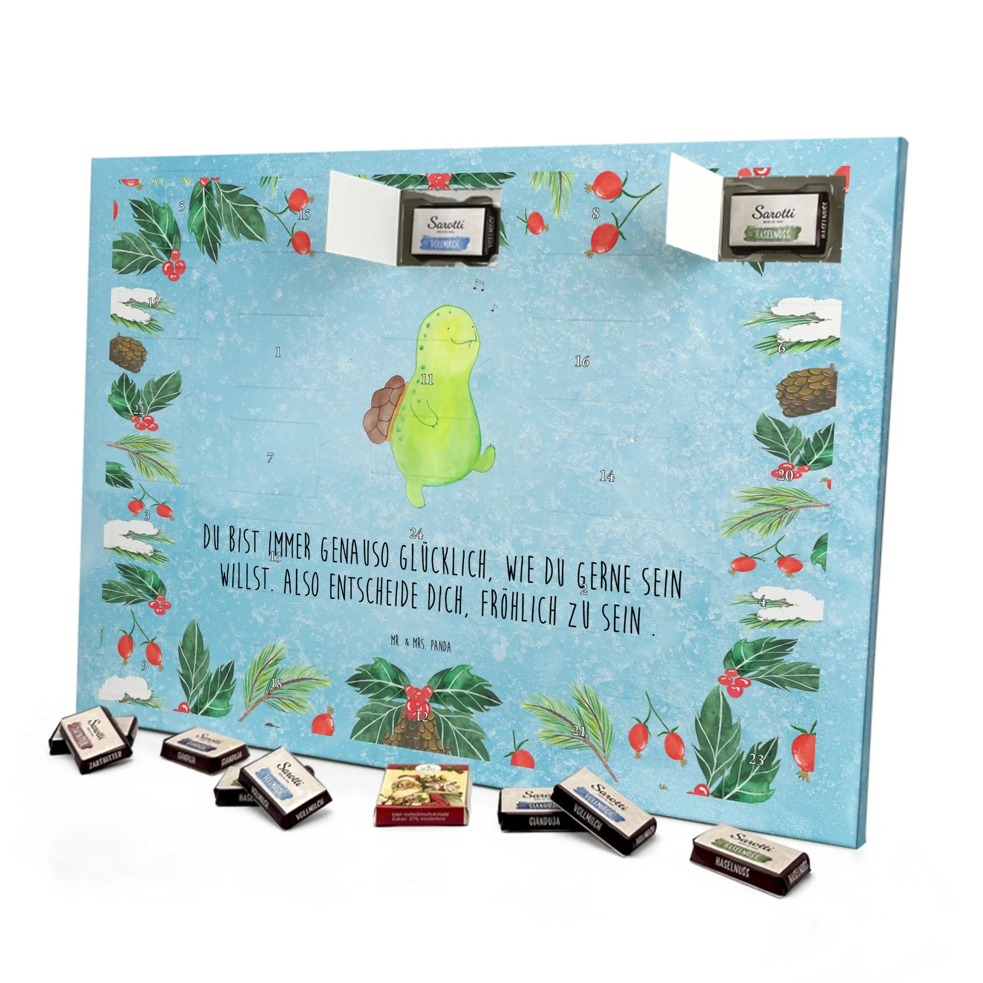Unsere kleine, fröhlich pfeifende Schildkröte wurde liebevoll von Mrs. Panda handgezeichnet und bringt mit ihrem Optimismus Licht in graue Tage. Auf dem Kalender prangt der inspirierende Spruch: Du bist immer genauso glücklich, wie du gerne sein willst. Also entscheide dich, fröhlich zu sein. Ein Motto, das Mut macht und gut durch den Advent begleitet.
