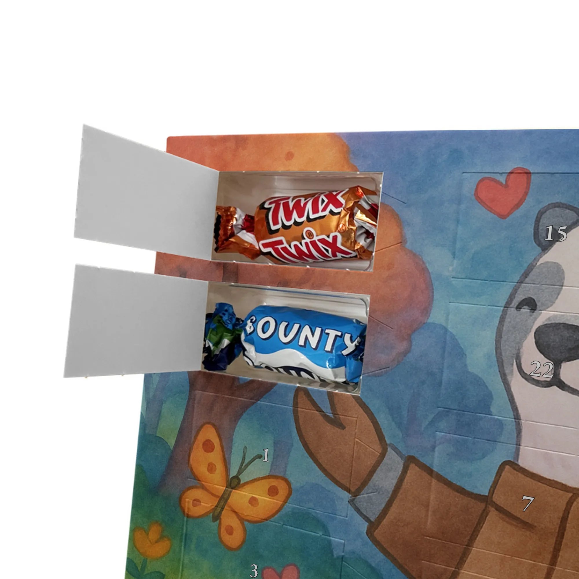 🐼 SCHOKOLADEN ADVENTSKALENDER: Liebevoll illustrierter Kalender, nicht personalisierbar, gefüllt mit Markennamen Schokolade.