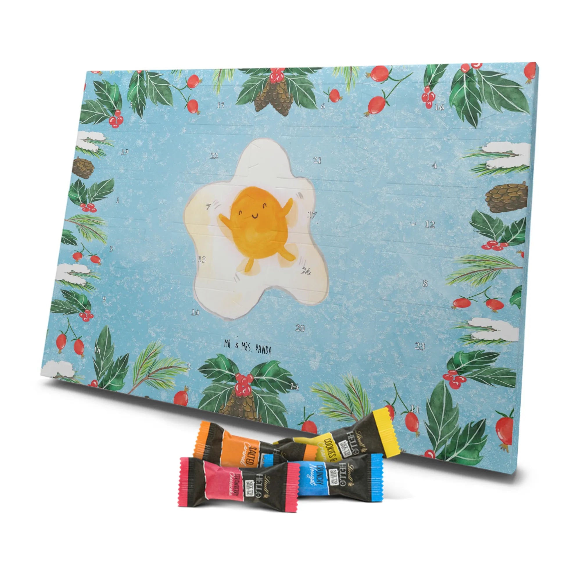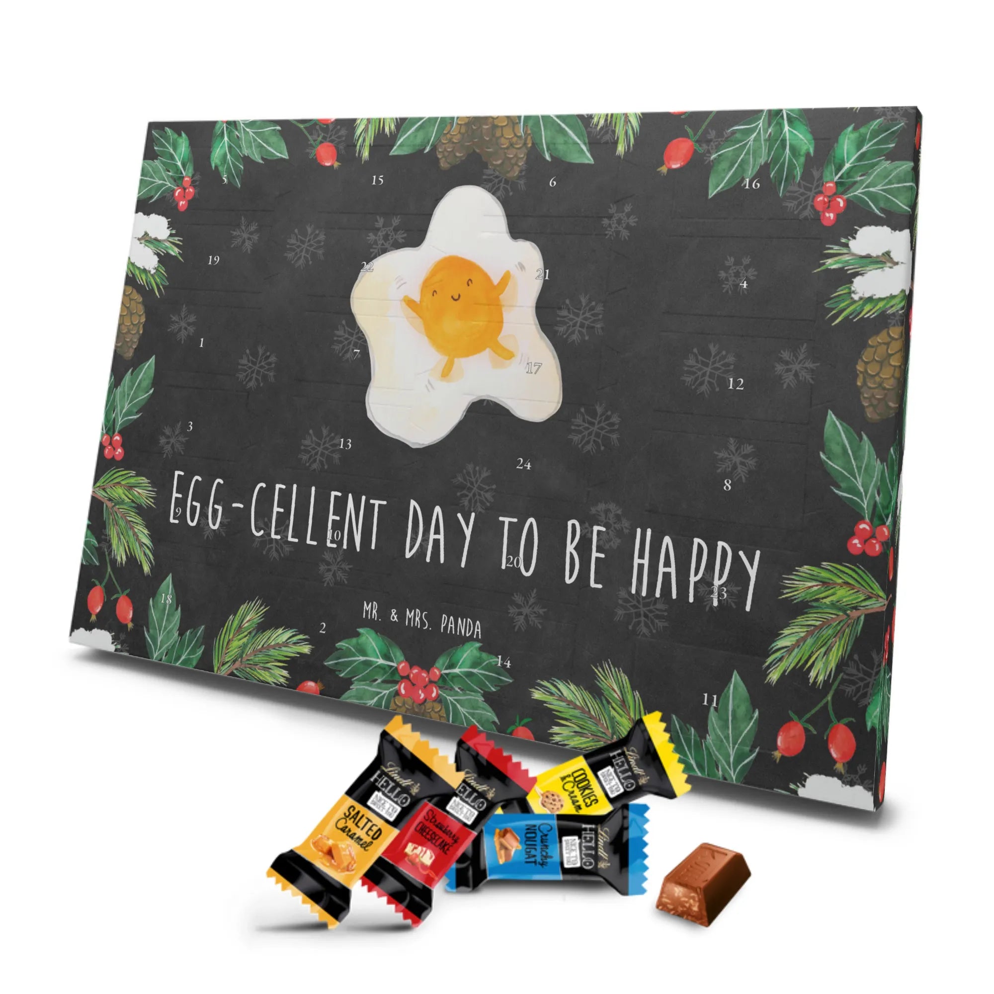 Entdecke den charmanten Schokoladen Adventskalender von Mr. & Mrs. Panda – ein kleines Kunstwerk für alle Schoko-Liebhaber. Der Schoko-Adventskalender ist mit liebevollen Illustrationen und kurzen Sprüchen bedruckt und verbreitet gemütliche Vorfreude auf Weihnachten. Er ist nicht personalisierbar, aber durch die brillante Druckqualität und die seidenmatte Oberflächenveredelung ein echtes Hingucker-Produkt. Auch die Seitenflächen sind bedruckt, was dem Kalender ein rundum schönes Erscheinungsbild verleiht. Maße: 325 mm x 225 mm x 27 mm. Das praktische Design erlaubt es, den Kalender aufzuhängen oder aufzustellen. Gefüllt mit Lindt Hello Schokolade: 24 einzeln verpackte Mini Sticks in vier leckeren Sorten – Karamell-Schokoladenkuchen, Kekse, Knuspriger Nougat und Erdbeer-Cheesecake. Zutaten sind u. a. Zucker, Kakaobutter, Vollmilchpulver, Haselnüsse und weitere Zutaten; Allergene: Milcheiweiß, Milchzucker, Soja, Weizen, Haselnüsse; kann Spuren von Mandeln und anderen Schalenfrüchten enthalten. Ideal als Geschenk oder zum Selbernaschen – einfach jeden Tag ein Türchen öffnen und genießen.
