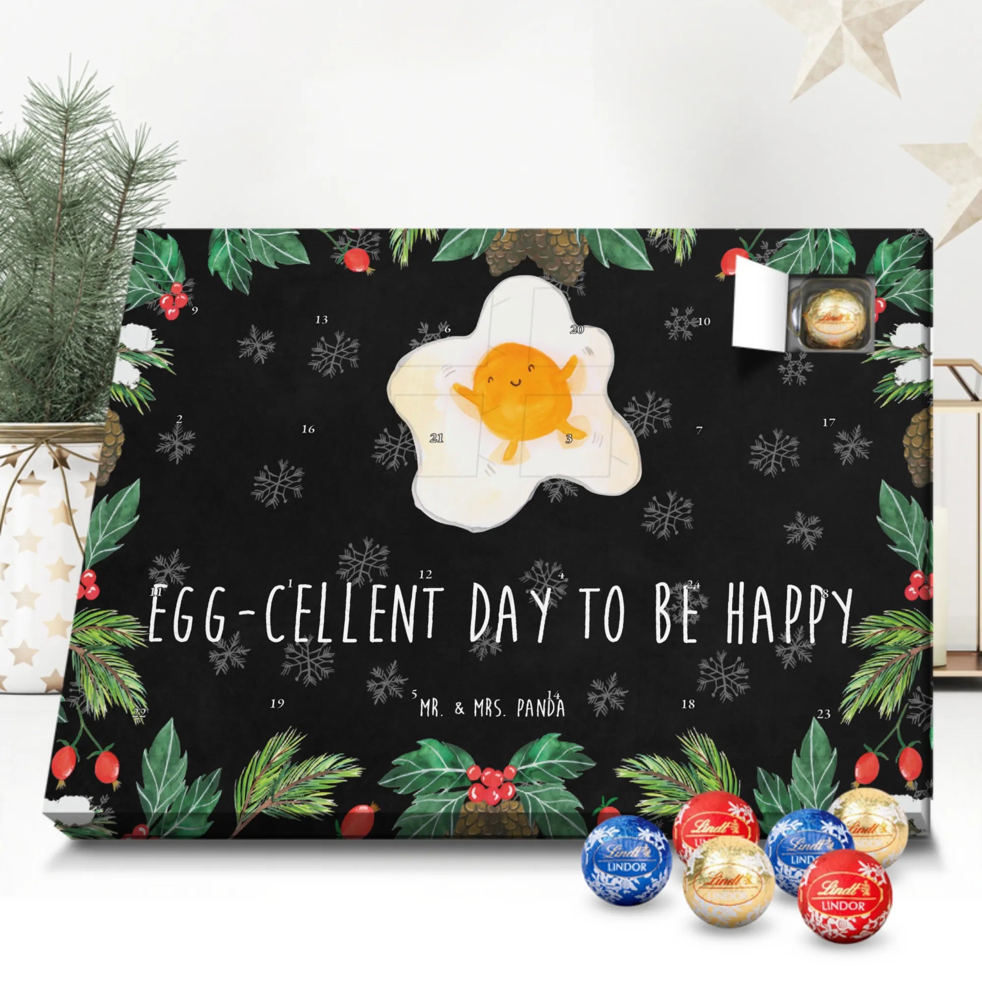 Der Schokolade Adventskalender von Mr. & Mrs. Panda ist ein liebevoll gestaltetes Highlight für deine Adventsdeko. Bedruckt mit wunderschönen Motiven & Sprüchen, nicht personalisierbar, bietet er eine charmante Optik für jeden Haushalt. Die brillante Druckqualität mit seidenmatter Oberflächenveredelung sorgt für edle Akzente, und die bedruckten Seitenflächen machen den Kalender rundum schön. Maße: 233 mm x 178 mm x 24 mm. Besonderheit: kann aufgehängt oder aufgestellt werden – richtig praktisch! Gefüllt mit Lindt Lindor: 24 einzeln verpackte Markenschokoladen Kugeln in drei köstlichen Varianten – Vollmilch, Feinherb und Weiße Schokolade – sorgen für tägliche Freuden. Zutaten: Zucker, pflanzliches Fett (Kokosnuss, Palmkern), Kakaobutter, Vollmilchpulver, Kakaomasse, Milchzucker, Magermilchpulver, Butterreinfett, Emulgator (Sojalecithin), Gerstenmalzextrakt, Aromen. Besondere Hinweise: Kann Haselnüsse und Mandeln enthalten. Ob als Geschenk oder für dich selbst – dieser Kalender ist eine wunderbare Mischung aus Design und feiner Markenschokolade.
