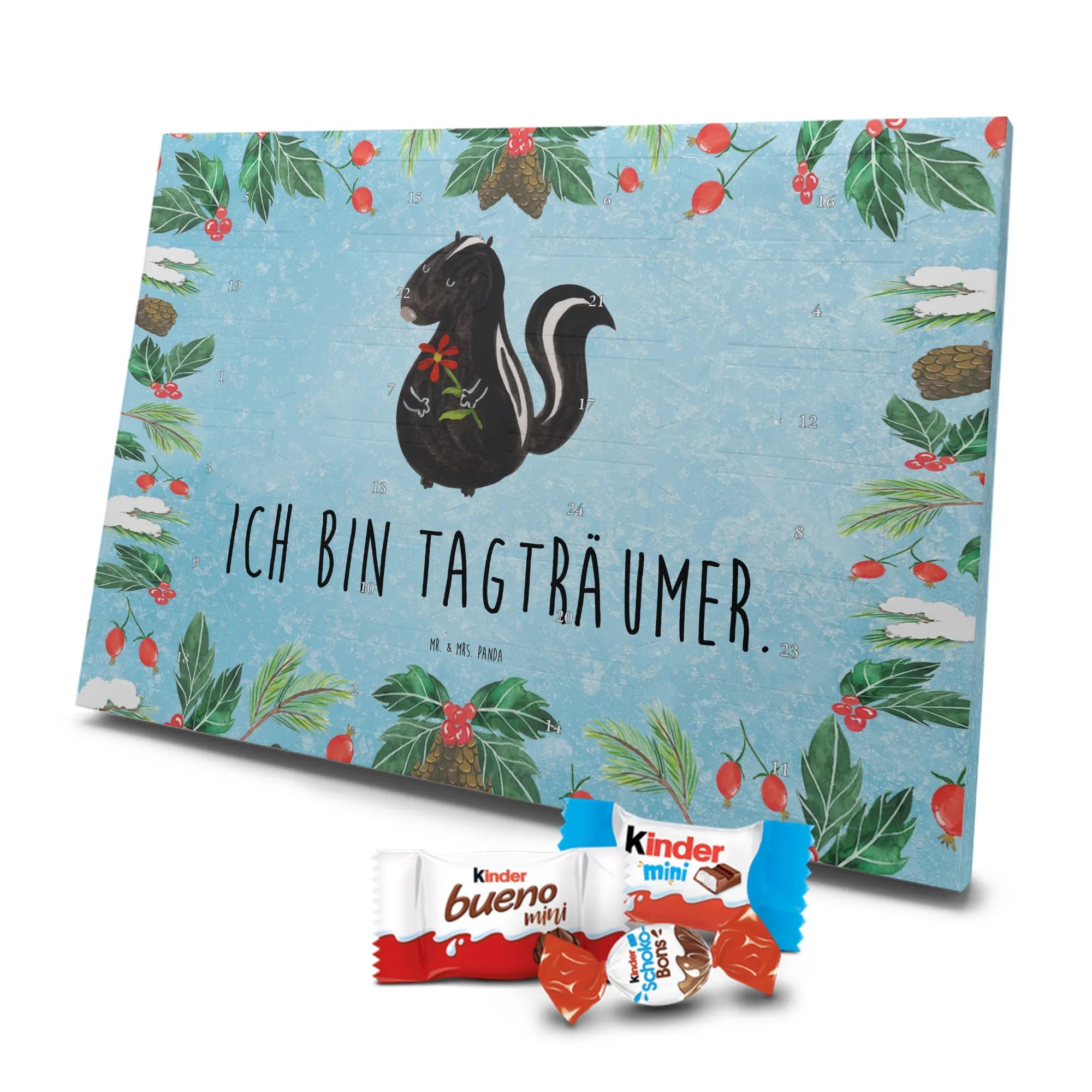 Adventskalender mit Schokolade – liebevoll gestaltet von Mr. & Mrs. Panda. Dieser niedliche Kalender ist bedruckt mit wunderschönen Motiven & Sprüchen von Mr. & Mrs. Panda und trotzdem nicht personalisierbar. Du bekommst brillante Druckqualität mit seidenmatter Oberflächenveredelung sowie bedruckte Seitenflächen, die dem Kalender ein hochwertiges Finish verleihen. Maße: 355 mm x 245 mm x 11 mm. Ein tolles Extra: kann aufgehängt oder aufgestellt werden, sodass du ihn flexibel platzieren kannst. Gefüllt mit Markenname Schokolade: Adventskalender gefüllt mit kinder® Schokolade. Inhalt: kinder® Schoko-Bons, kinder® Bueno mini und kinder® Schokolade mini. Die 24 Türchen sind liebevoll befüllt und sorgen jeden Tag für ein Lächeln – ideal für Kinder, Paare oder als kleines Geschenk für Freunde. Robust und dekorativ zugleich, bringt dieser Adventskalender süße Vorfreude in dein Zuhause. Verschenke oder genieße eine adventliche Zeit voller kleiner, schokoladiger Überraschungen!