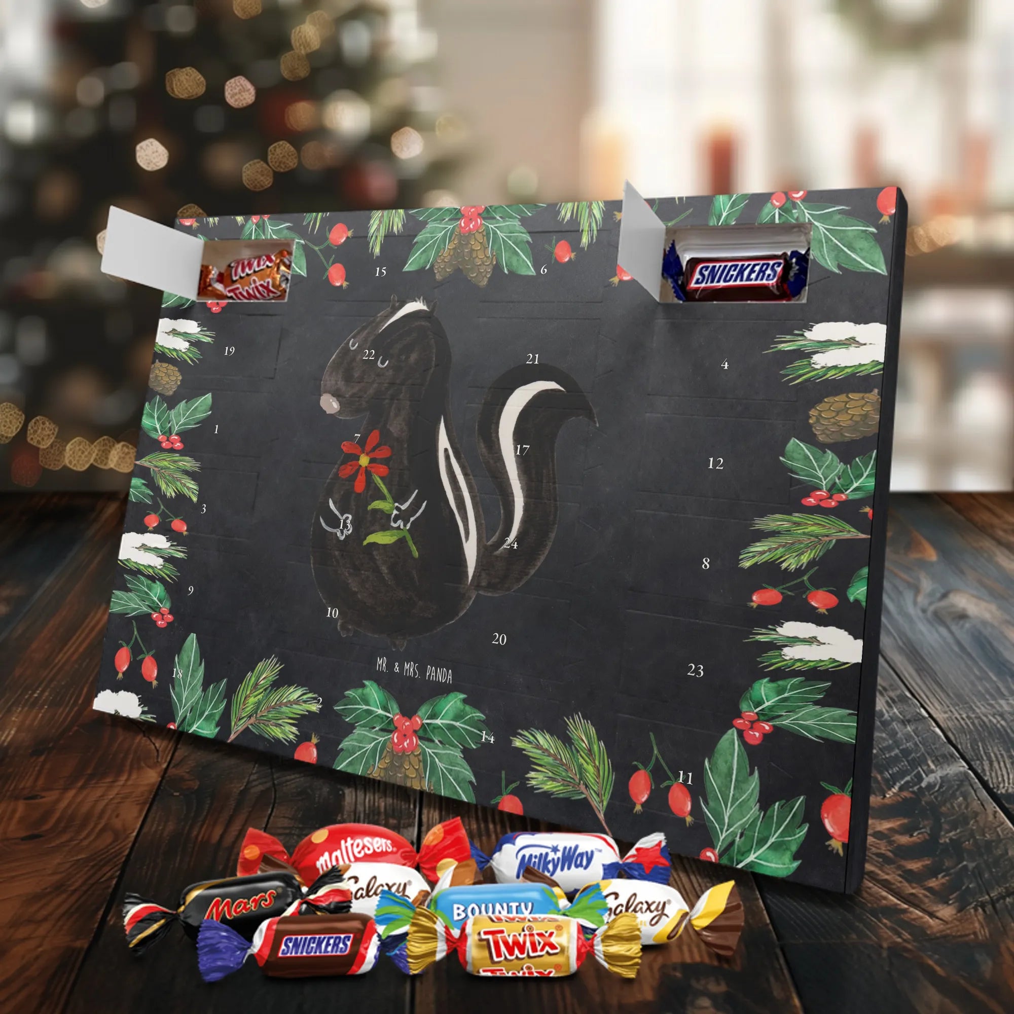Unser Schoko Adventskalender von Mr. & Mrs. Panda bringt dir und deinen Lieben jede Menge Vorfreude und zauberhafte Momente in die Adventszeit. Der Kalender ist liebevoll bedruckt mit wunderschönen Motiven und frechen Sprüchen im typischen Mr. & Mrs. Panda Stil – ein echter Blickfang auf dem Tisch oder an der Wand. Die brillante Druckqualität kombiniert mit einer seidenmatten Oberflächenveredelung sorgt für edle Farben und ein angenehmes Gefühl beim Anfassen. Auch die Seitenflächen sind bedruckt, sodass der Kalender von allen Seiten hübsch aussieht. Er ist nicht personalisierbar, dafür aber in seiner Gestaltung rundum stimmig. Gefüllt ist der Adventskalender mit 24 hochwertigen Celebrations-Füllungen in acht verschiedenen Sorten: Maltesers, Mars, Snickers, Twix, Milky Way, Bounty, Galaxy und Galaxy Caramel — so ist für jede Naschkatze etwas dabei. Die Besonderheit: Du kannst den Kalender entweder aufstellen oder dank rückseitiger Aufhängung an die Wand hängen. Maße: 325 mm x 225 mm x 27 mm. Ein liebevolles Geschenk für Familie, Freunde oder einfach für dich selbst, das kleine tägliche Glücksmomente schenkt und die Adventszeit versüßt.