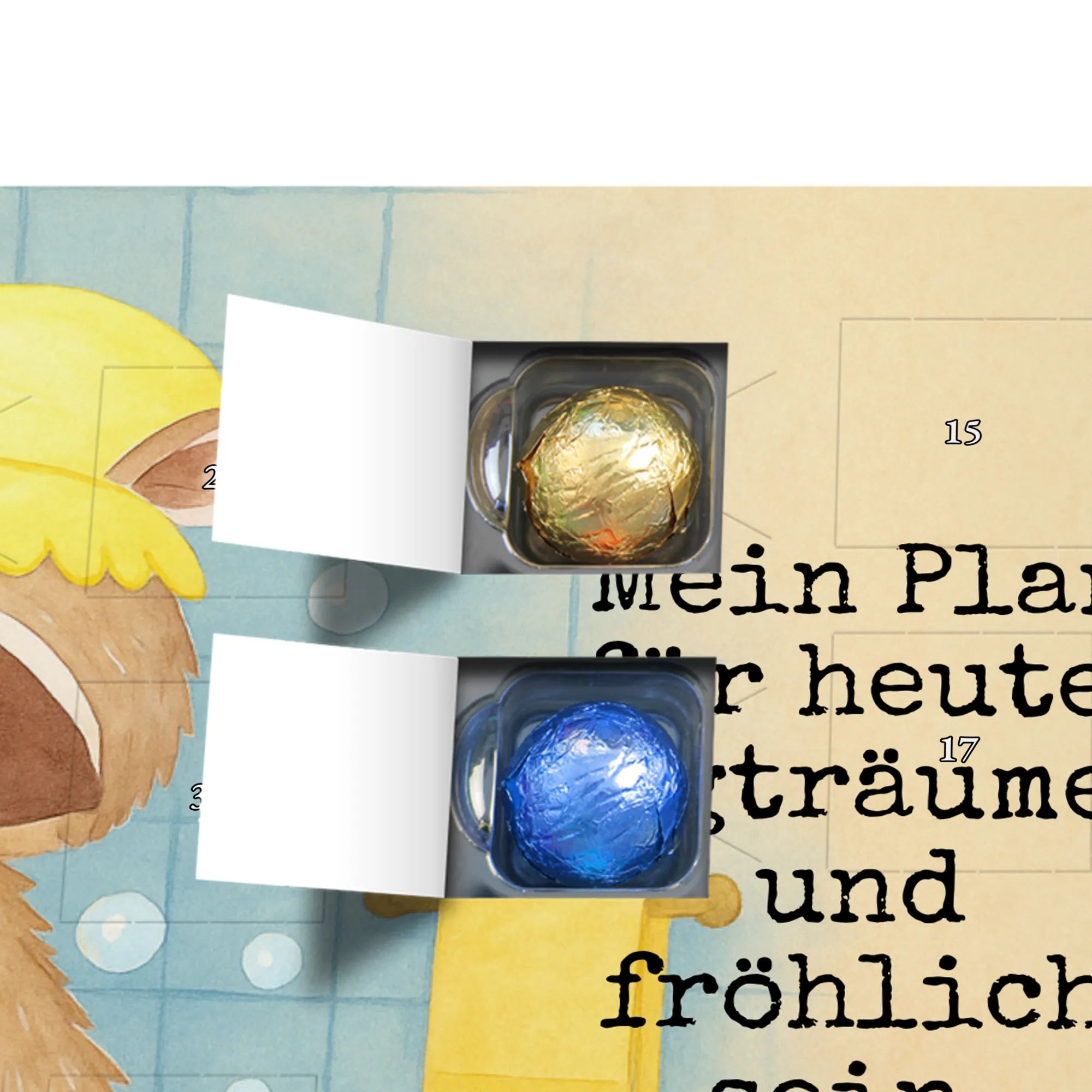 Unser Schokolade Adventskalender von Mr. & Mrs. Panda bringt dir jeden Tag im Dezember ein kleines Glücksgefühl. Die Außenseite ist liebevoll bedruckt mit niedlichen Illustrationen und herzlichen Sprüchen – in brillanter Druckqualität und mit seidenmatter Oberflächenveredelung für einen edlen Look. Die Seitenflächen sind ebenfalls bedruckt, sodass der Kalender von allen Seiten ein echter Hingucker ist. Du kannst ihn hinstellen oder an die Wand hängen, ganz wie es dir gefällt. Der Kalender ist nicht personalisierbar, dafür aber mit feiner Markenschokolade bestückt: 24 einzeln verpackte Schokoladentäfelchen in vier köstlichen Geschmacksrichtungen aus dem Hause Sarotti® und Confiserie Heidel® (Vollmilch, Nougat, Zartbitter, Haselnuss). Insgesamt sind 107 g Markenschokolade enthalten. Maße: 355 mm x 245 mm x 11 mm – ideal für Tisch, Regal oder Fensterbank. Verschenke warme Vorfreude, liebevolle Gestaltung und kleine Schoko-Überraschungen an deine Liebsten – im typischen, gemütlichen Stil von Mr. & Mrs. Panda.