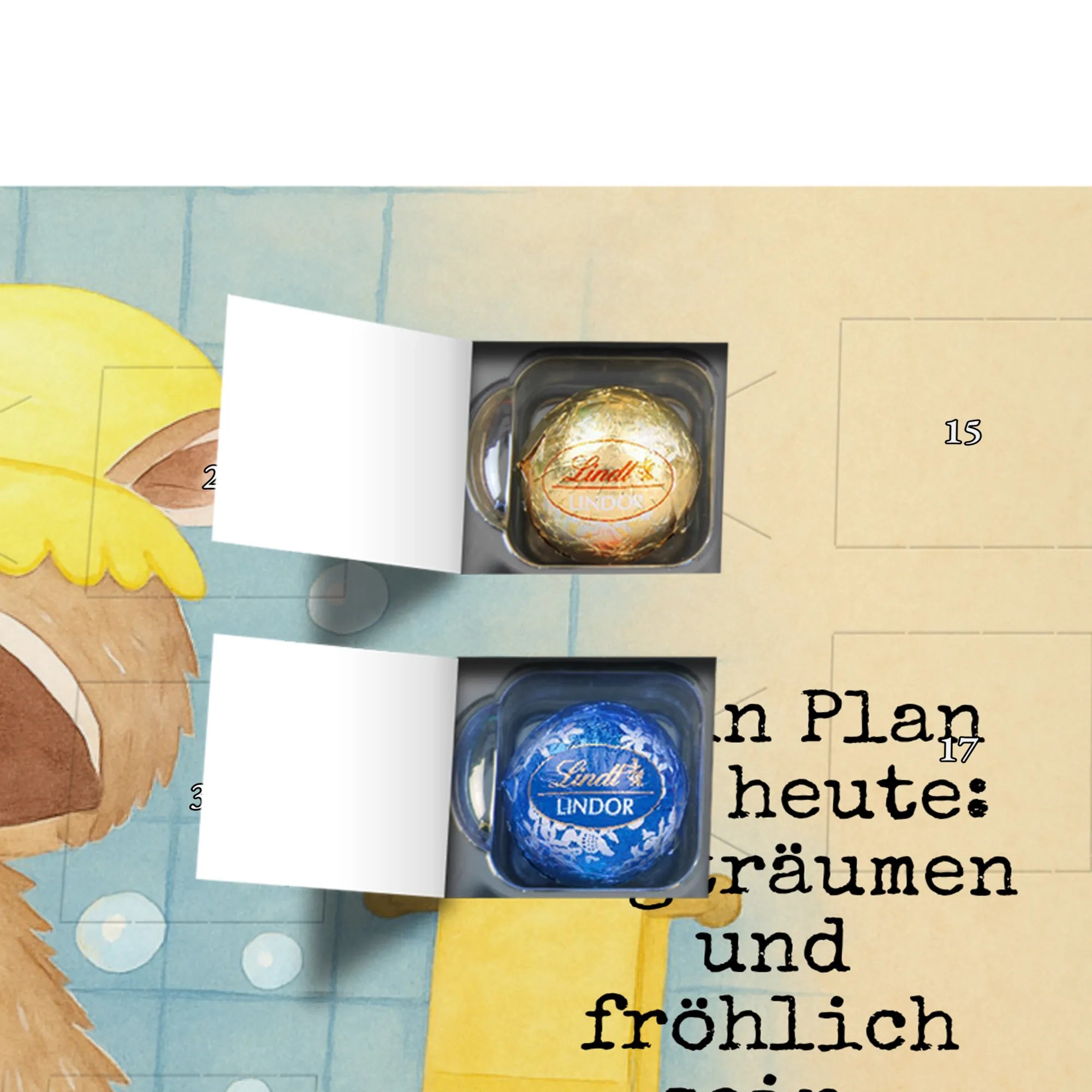 Unser zauberhafter Schoko Adventskalender von Mr. & Mrs. Panda bringt dir die süßeste Vorfreude auf Weihnachten! Dieser liebevoll gestaltete Adventskalender ist bedruckt mit wunderschönen Motiven & Sprüchen von Mr. & Mrs. Panda und ist nicht personalisierbar – dafür aber ein perfektes Geschenk für Freunde und Familie. Brillante Druckqualität mit seidenmatter Oberflächenveredelung sorgt für ein edles Finish, und die bedruckten Seitenflächen machen den Kalender von allen Seiten zu einem Hingucker. Maße: 233 mm x 178 mm x 24 mm. Besonderheit: kann aufgehängt oder aufgestellt werden, je nachdem, wie du ihn präsentieren möchtest. Gefüllt mit Lindt Lindor: 24 einzeln verpackte Markenschokoladen Kugeln in drei verschiedenen Sorten – Vollmilch, Feinherb und Weiße Schokolade – sorgen für abwechslungsreichen Genuss in der Adventszeit. Zutaten: Zucker, pflanzliches Fett (Kokosnuss, Palmkern), Kakaobutter, Vollmilchpulver, Kakaomasse, Milchzucker, Magermilchpulver, Butterreinfett, Emulgator (Sojalecithin), Gerstenmalzextrakt, Aromen. Besondere Hinweise: Kann Haselnüsse und Mandeln enthalten. Unser Schoko Adventskalender verbindet niedliches Design mit hochwertiger Füllung – ideal zum Verschenken oder selbst Naschen. Mr. & Mrs. Panda wünschen dir eine fröhliche und leckere Adventszeit!