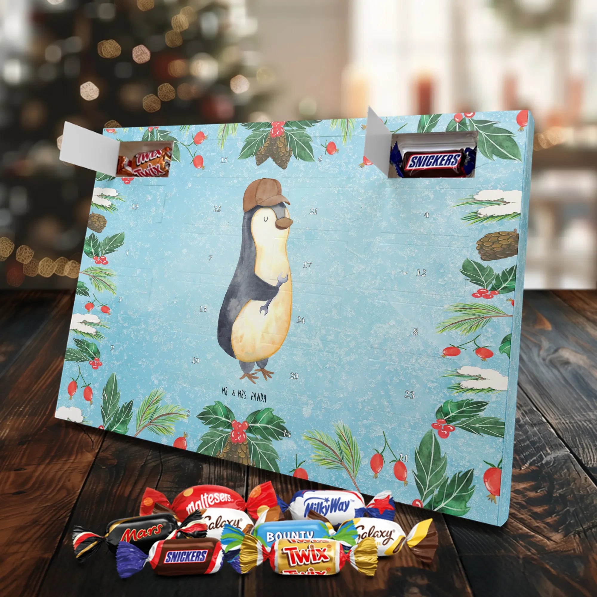 Unser Celebrations Adventskalender von Mr. & Mrs. Panda ist die süße Art, die Tage bis Weihnachten zu zählen. Liebevoll gestaltete Motive und herzliche Sprüche machen jeden Öffnungsmoment besonders. Die brillante Druckqualität zusammen mit einer seidenmatten Oberflächenveredelung sorgt für strahlende Farben und eine angenehme Haptik; auch die Seitenflächen sind bedruckt, damit alles rundum hübsch aussieht. Der Kalender ist nicht personalisierbar. Innen erwarten dich 24 hochwertige Celebrations-Füllungen in acht verschiedenen Sorten: Maltesers, Mars, Snickers, Twix, Milky Way, Bounty, Galaxy und Galaxy Caramel — abwechslungsreicher Genuss für jeden Tag. Als Extra kannst du den Kalender entweder einfach hinstellen oder an die Wand hängen. Maße: 325 mm x 225 mm x 27 mm. Ein ideales Geschenk für alle, die Freude an schönen Details und kleinen Süßigkeiten haben.