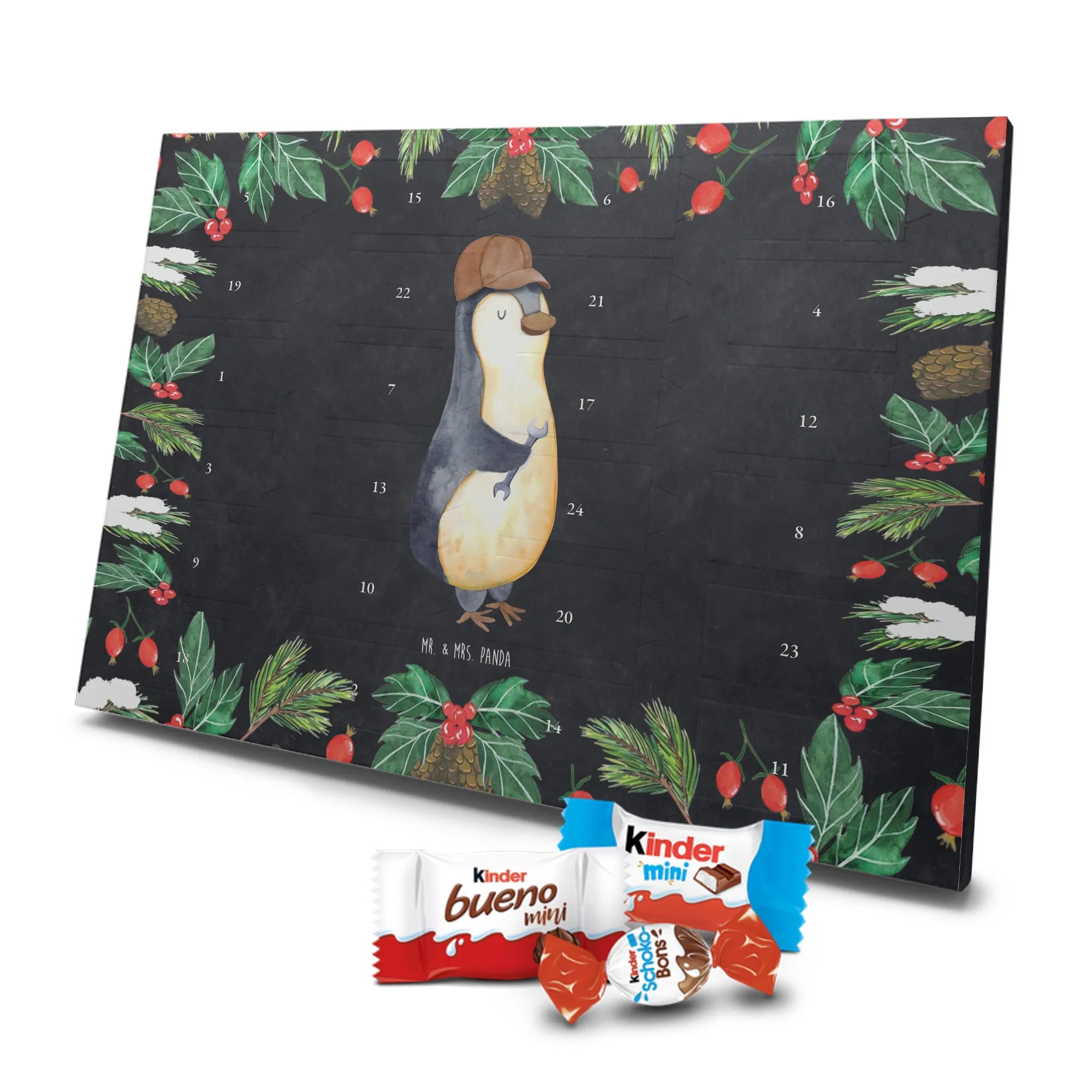 Wunderschöner Schoko Adventskalender von Mr. & Mrs. Panda – perfekt, wenn du die Vorweihnachtszeit mit einem liebevoll gestalteten Kalender versüßen möchtest. Unser Kalender ist bedruckt mit wunderschönen Motiven & Sprüchen von Mr. & Mrs. Panda und eignet sich hervorragend als Geschenk für Freunde, Familie oder einfach für dich selbst. Er ist nicht personalisierbar, dafür aber mit viel Liebe zum Detail gestaltet. Die brillante Druckqualität mit seidenmatter Oberflächenveredelung sorgt für edles Aussehen, und die bedruckten Seitenflächen geben dem Kalender einen wertigen Gesamteindruck. Maße: 355 mm x 245 mm x 11 mm. Besonderheit: kann aufgehängt oder aufgestellt werden – so findest du immer den perfekten Platz bei dir zuhause. Gefüllt mit Markenname Schokolade: Adventskalender gefüllt mit kinder® Schokolade. Inhalt: kinder® Schoko-Bons, kinder® Bueno mini und kinder® Schokolade mini. Der Kalender bietet 24 Türchen mit kleinen Überraschungen, die Kinderherzen höherschlagen lassen und Erwachsene schmunzeln. Er ist robust verarbeitet und ideal für den täglichen Genuss in der Adventszeit. Ob dekorativ auf der Kommode oder an der Wand aufgehängt – er bringt Freude und süße Momente in die Vorweihnachtszeit. Bestelle jetzt und mach dir oder deinen Lieben die Adventszeit ein bisschen süßer!