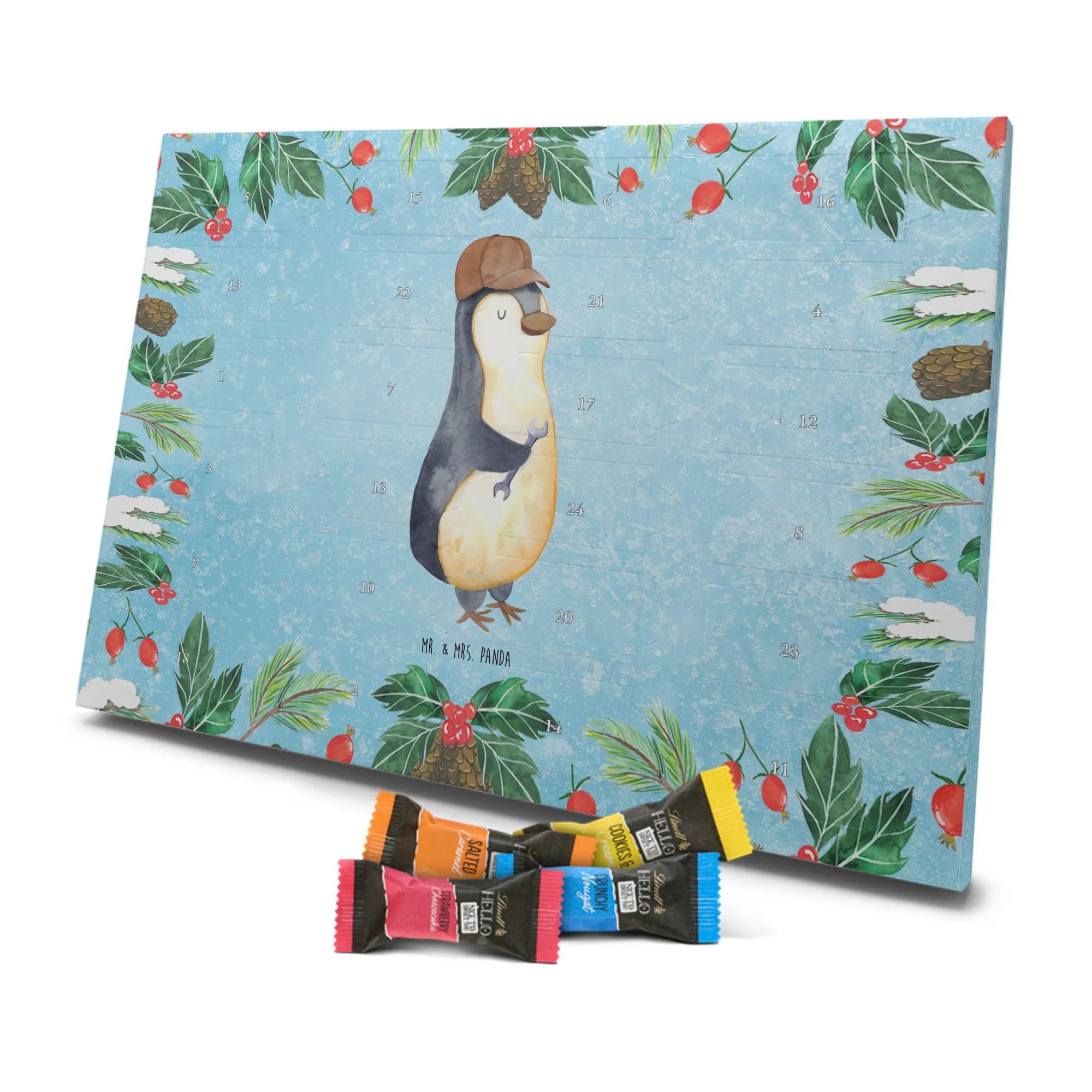 Feier die Adventszeit mit unserem liebevollen Schoko-Adventskalender von Mr. & Mrs. Panda. Jeder Kalender ist mit unseren typischen Motiven und heiteren Sprüchen bedruckt und bringt Vorfreude in dein Zuhause. Der Kalender ist nicht personalisierbar, punktet aber mit brillanter Druckqualität und einer seidenmatten Oberflächenveredelung. Auch die Seitenflächen sind gestaltet, damit das Motiv rundherum wirkt. Maße: 325 mm x 225 mm x 27 mm. Du kannst den Kalender problemlos aufhängen oder aufstellen – praktisch und dekorativ zugleich. Gefüllt mit Lindt Hello Schokolade: 24 einzeln verpackte Mini Sticks in vier beliebten Geschmacksrichtungen: Karamell-Schokoladenkuchen, Kekse, Knuspriger Nougat und Erdbeer-Cheesecake. Zutaten wie Zucker, Kakaobutter, Vollmilchpulver und Haselnüsse sind enthalten; Allergene: Milcheiweiß, Milchzucker, Soja, Weizen, Haselnüsse; kann Spuren anderer Schalenfrüchte, z. B. Mandeln, enthalten. Der Kalender ist eine tolle Geschenkidee für Erwachsene und Kinder – ein täglicher Schoko-Moment in der Adventszeit.