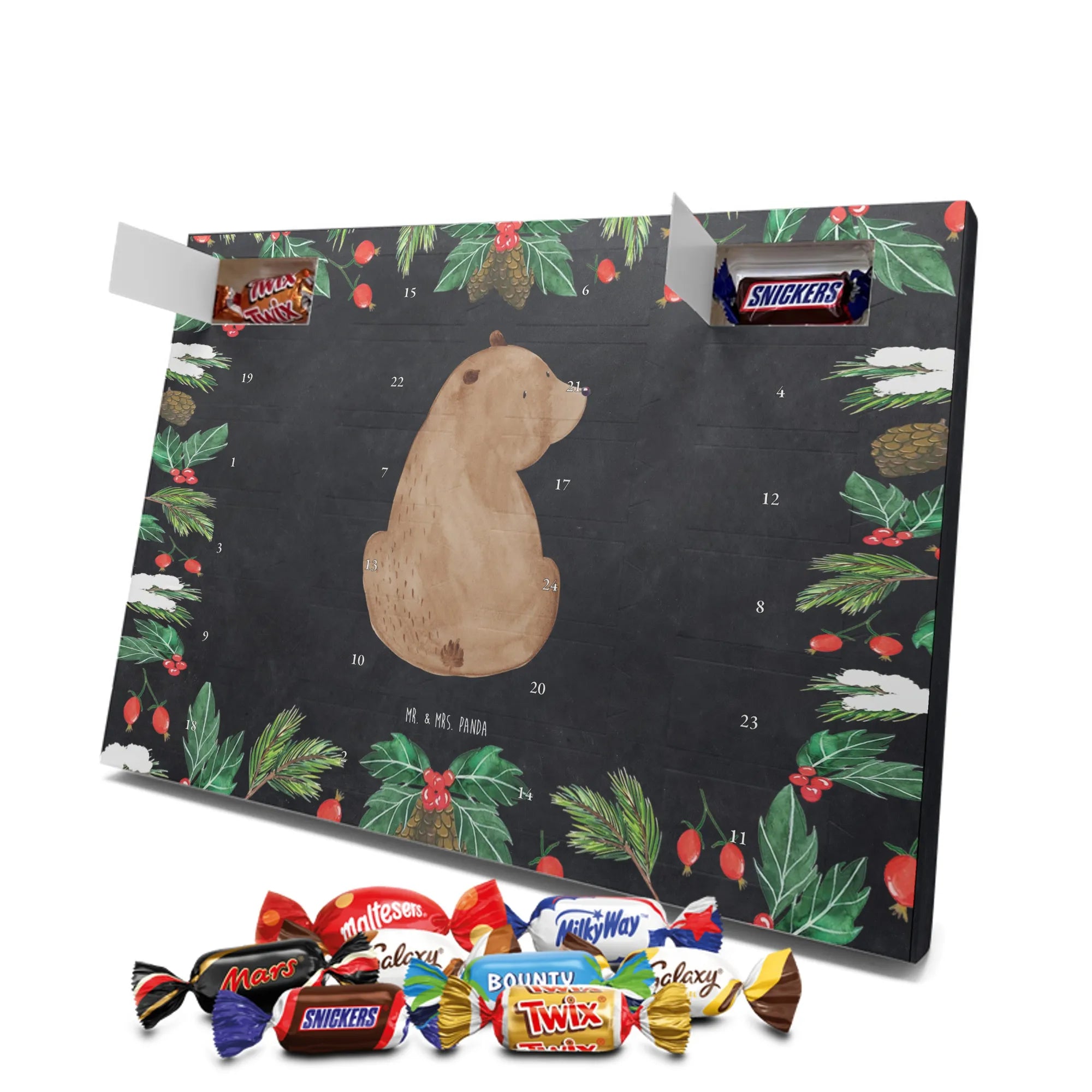 Unser Schoko Adventskalender von Mr. & Mrs. Panda bringt dir und deinen Lieben jede Menge Vorfreude und zauberhafte Momente in die Adventszeit. Der Kalender ist liebevoll bedruckt mit wunderschönen Motiven und frechen Sprüchen im typischen Mr. & Mrs. Panda Stil – ein echter Blickfang auf dem Tisch oder an der Wand. Die brillante Druckqualität kombiniert mit einer seidenmatten Oberflächenveredelung sorgt für edle Farben und ein angenehmes Gefühl beim Anfassen. Auch die Seitenflächen sind bedruckt, sodass der Kalender von allen Seiten hübsch aussieht. Er ist nicht personalisierbar, dafür aber in seiner Gestaltung rundum stimmig. Gefüllt ist der Adventskalender mit 24 hochwertigen Celebrations-Füllungen in acht verschiedenen Sorten: Maltesers, Mars, Snickers, Twix, Milky Way, Bounty, Galaxy und Galaxy Caramel — so ist für jede Naschkatze etwas dabei. Die Besonderheit: Du kannst den Kalender entweder aufstellen oder dank rückseitiger Aufhängung an die Wand hängen. Maße: 325 mm x 225 mm x 27 mm. Ein liebevolles Geschenk für Familie, Freunde oder einfach für dich selbst, das kleine tägliche Glücksmomente schenkt und die Adventszeit versüßt.