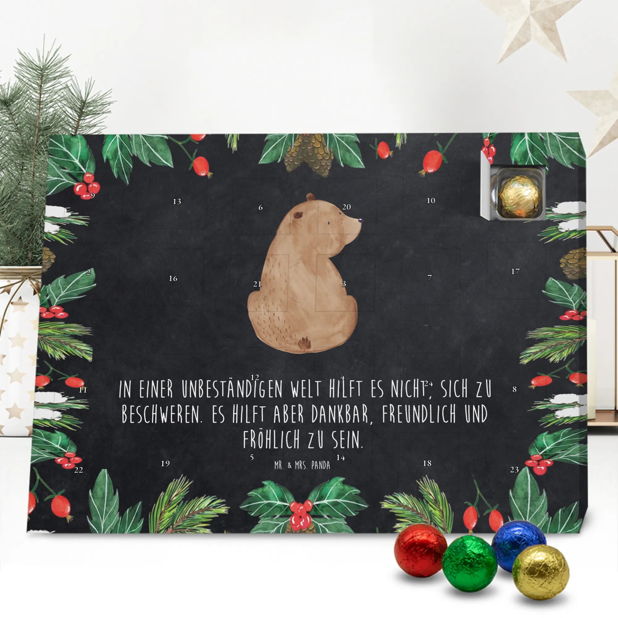 Wunderschöner Schokoladen Adventskalender von Mr. & Mrs. Panda – perfekt, um dir oder deinen Liebsten die Vorweihnachtszeit zu versüßen. Unser liebevoll gestalteter Schoko Adventskalender ist bedruckt mit wunderschönen Motiven & Sprüchen von Mr. & Mrs. Panda und bleibt ein fröhlicher Blickfang auf dem Tisch oder an der Wand. Er ist nicht personalisierbar, dafür aber mit viel Herz und Details gestaltet. Brillante Druckqualität mit seidenmatter Oberflächenveredelung sorgt dafür, dass die Farben strahlen und die Motive besonders edel wirken. Die Seitenflächen sind ebenfalls bedruckt, sodass der Kalender von allen Seiten hübsch aussieht. Maße: 233 mm x 178 mm x 24 mm und durch seine stabile Bauweise kannst du ihn sowohl aufstellen als auch an die Wand hängen – Besonderheit: kann aufgehängt oder aufgestellt werden. Gefüllt mit MARKENNAMEN Schokolade und leckeren Schokoladenkugeln, bietet jeder Tag eine kleine, köstliche Überraschung. Bitte beachte die besonderen Hinweise: (Kann Spuren von Haselnüssen, Mandeln, Gluten und Soja enthalten!), kühl und trocken lagern. Der Kalender eignet sich toll als Geschenk, als Adventsdekoration oder als liebevolle Aufmerksamkeit für Freunde und Familie. Mr. & Mrs. Panda wünscht dir eine süße und gemütliche Vorweihnachtszeit!