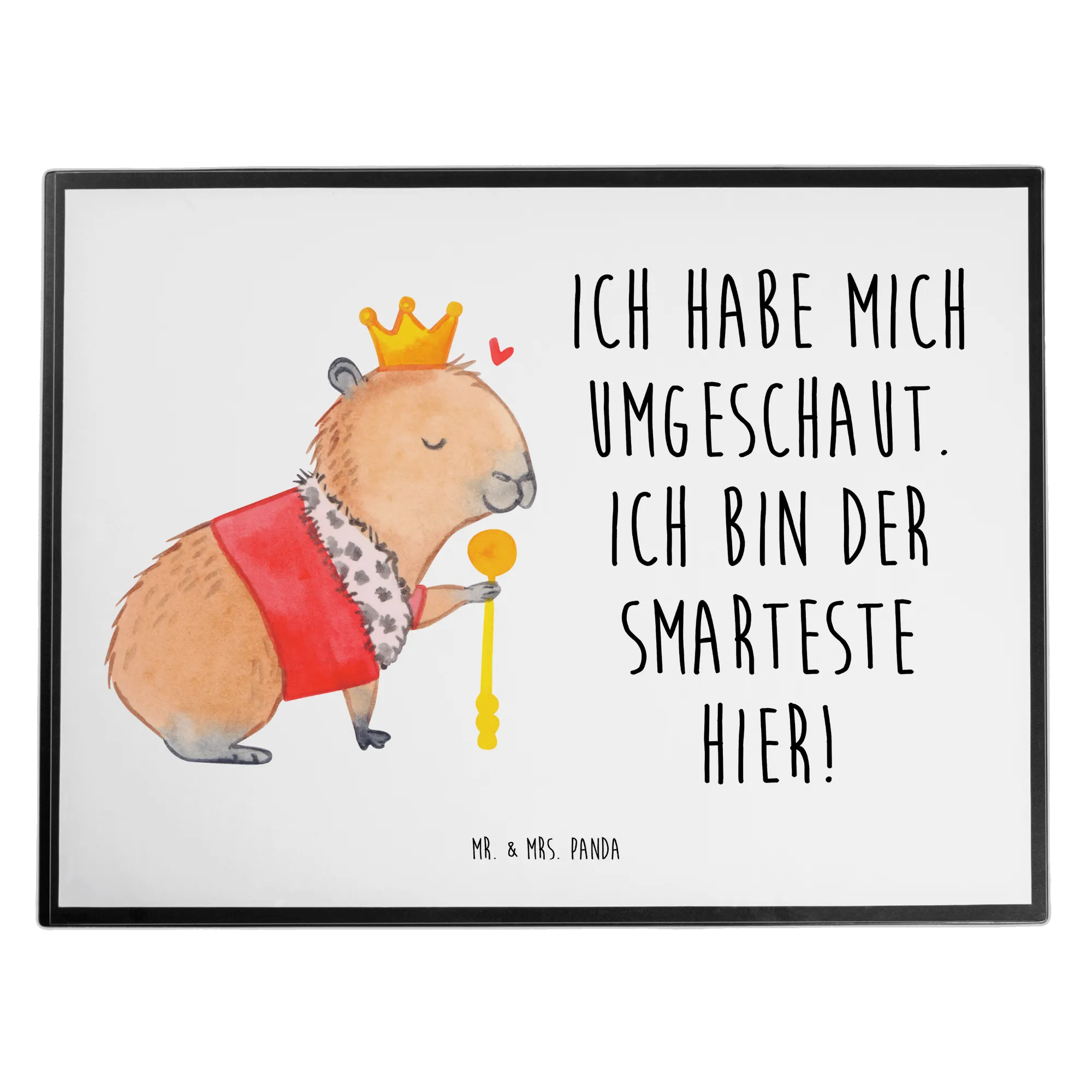Wenn du in die Welt von Mr. & Mrs. Panda eintauchst, entdeckst du das Capybara-Königreich, wo ein besonderes Capybara die Krone trägt. Mit einem purpurroten Mantel, der von einem weißen Fellkragen umrahmt wird, und einer glänzenden Krone auf dem Kopf, wird dieses Capybara zum Inbegriff des majestätischen Wohlgefühls. Ein goldener Zepter in der Pfote unterstreicht seine sanfte Herrschaft. Die Augen des Capybaras sind geschlossen, als ob es in einem Moment der absoluten Zufriedenheit ruht. Neben seinem Haupt schwebt ein kleines rotes Herz - eine sanfte Erinnerung daran, dass Liebe die wahre Königskraft ist. Dieses Motiv, begleitet vom Spruch 'Ich habe mich umgeschaut. Ich bin der Smarteste hier!', spricht zu uns mit einem Augenzwinkern über die Kunst, sich selbst anzunehmen und die eigenen Stärken mit Humor und Leichtigkeit zu präsentieren.