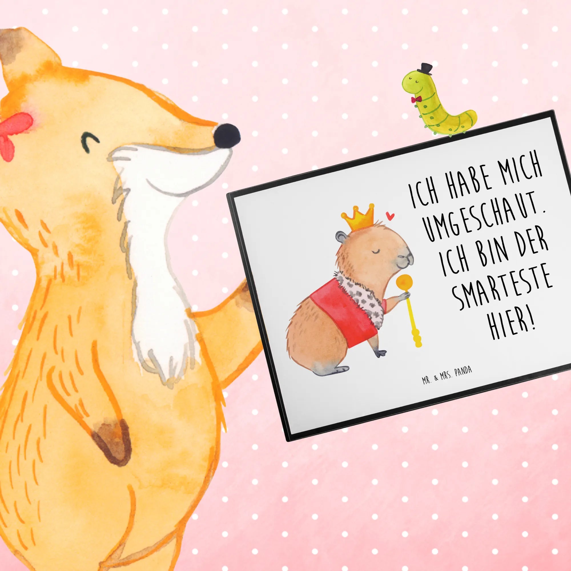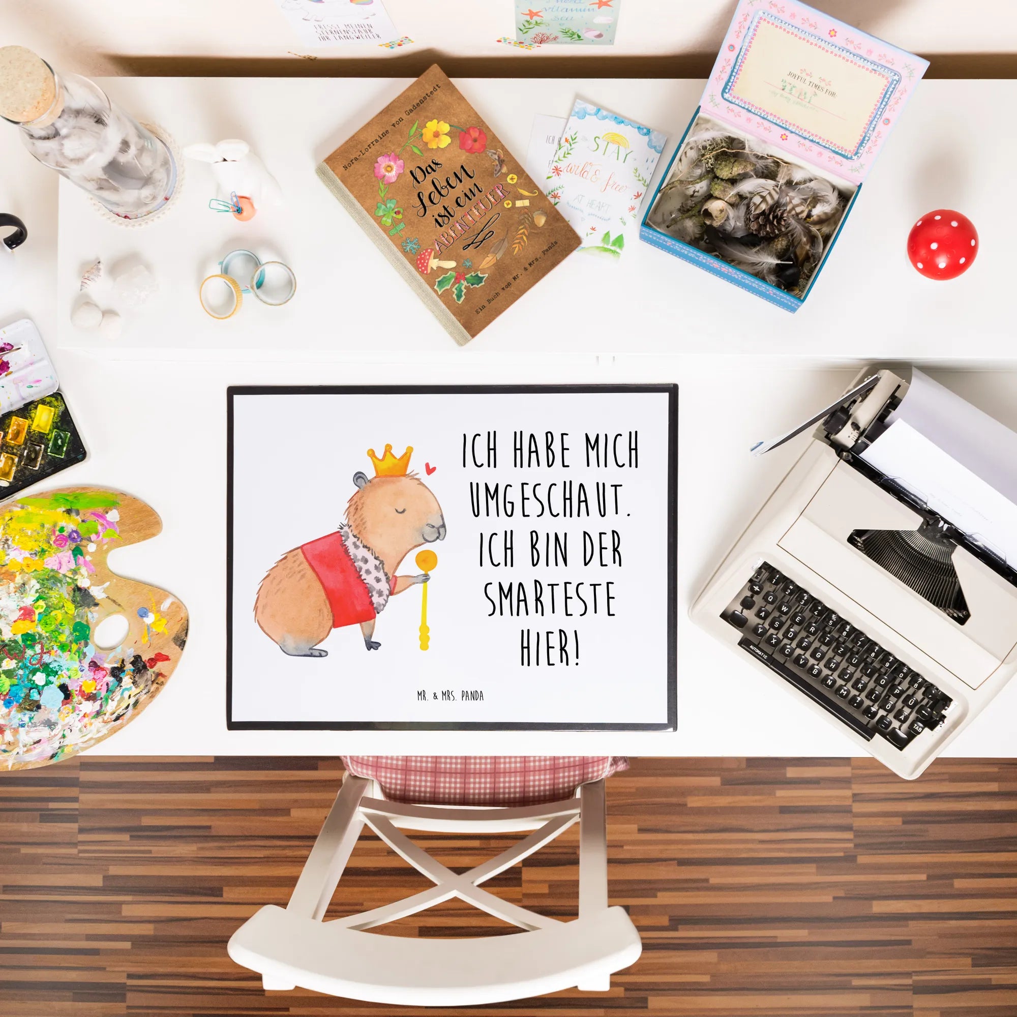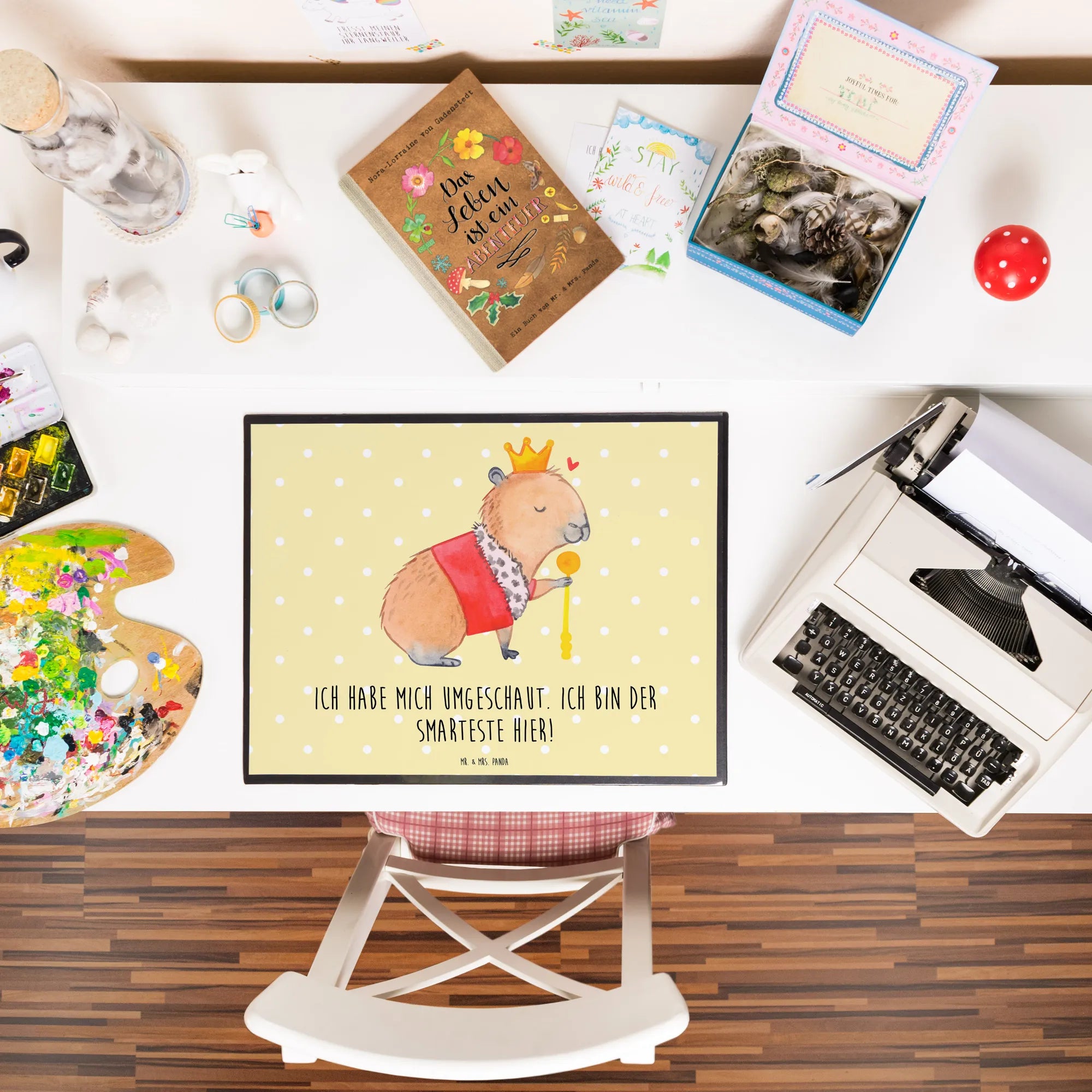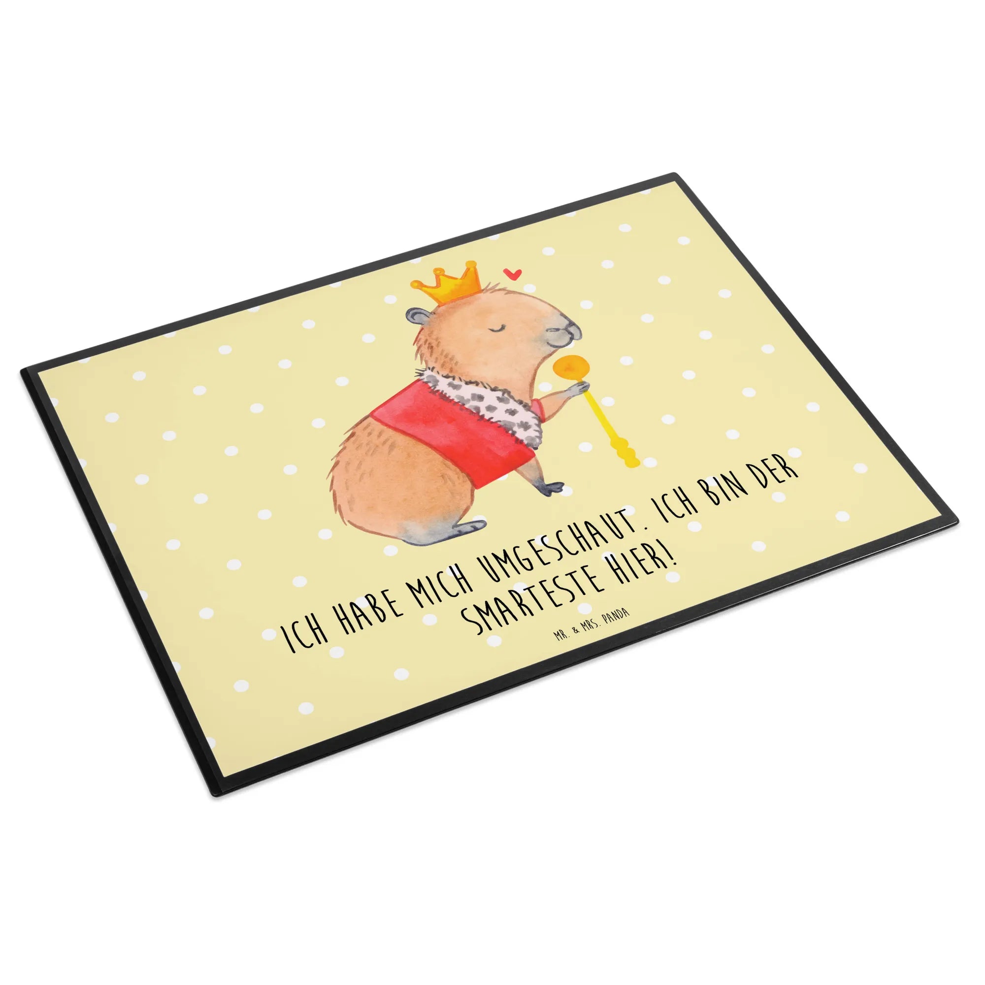 Die Schreibtischunterlage "Capybara König" aus der Small World Kollektion von Mr. & Mrs. Panda ist der perfekte Begleiter für jeden Schreibtisch! Wenn Du ein bisschen gute Laune in Deinen Alltag bringen möchtest, ist diese Unterlage genau das Richtige für Dich. Das süße, handgezeichnete Motiv zeigt ein charmantes Capybara mit einer glänzenden Krone und einem Zepter, das freundlich über sein kleines Königreich herrscht. Mit dem spritzigen Spruch "Ich habe mich umgeschaut. Ich bin der Smarteste hier!" zaubert sie jedem ein Lächeln ins Gesicht.