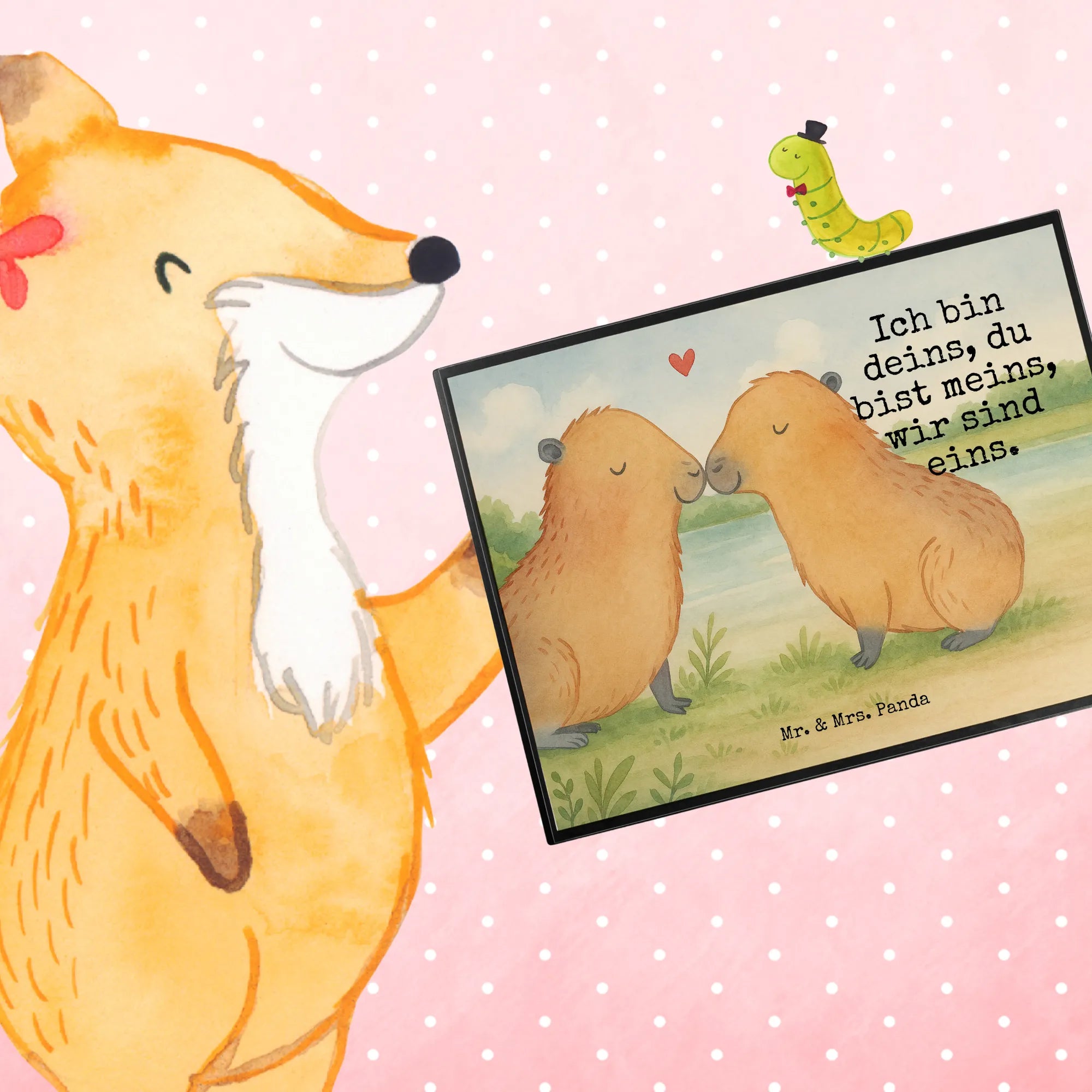 Die herzerwärmende Darstellung von zwei Capybaras auf diesem bezaubernden Motiv von Mr. & Mrs. Panda zeigt die Zuneigung auf wundervolle Weise. Sie berühren sich sanft an der Nase, sodass sich ihre Schnauzen zu einem herzförmigen Muster formen. Über ihnen schwebt ein kleines, rotes Herz, das ihre Liebe wunderschön symbolisiert. Die handgezeichneten pelzigen Gefährten sind in sanften Brauntönen gehalten und strahlen Gelassenheit und Freude aus. Mit dem berührenden Spruch 'Ich bin deins, du bist meins, wir sind eins.' vermittelt dieses Motiv eine tiefe Botschaft der Liebe und Einheit und ist daher die perfekte Geschenkidee für Verliebte und Romantiker, sei es zum Jahrestag, Valentinstag oder einfach als Liebesbeweis.