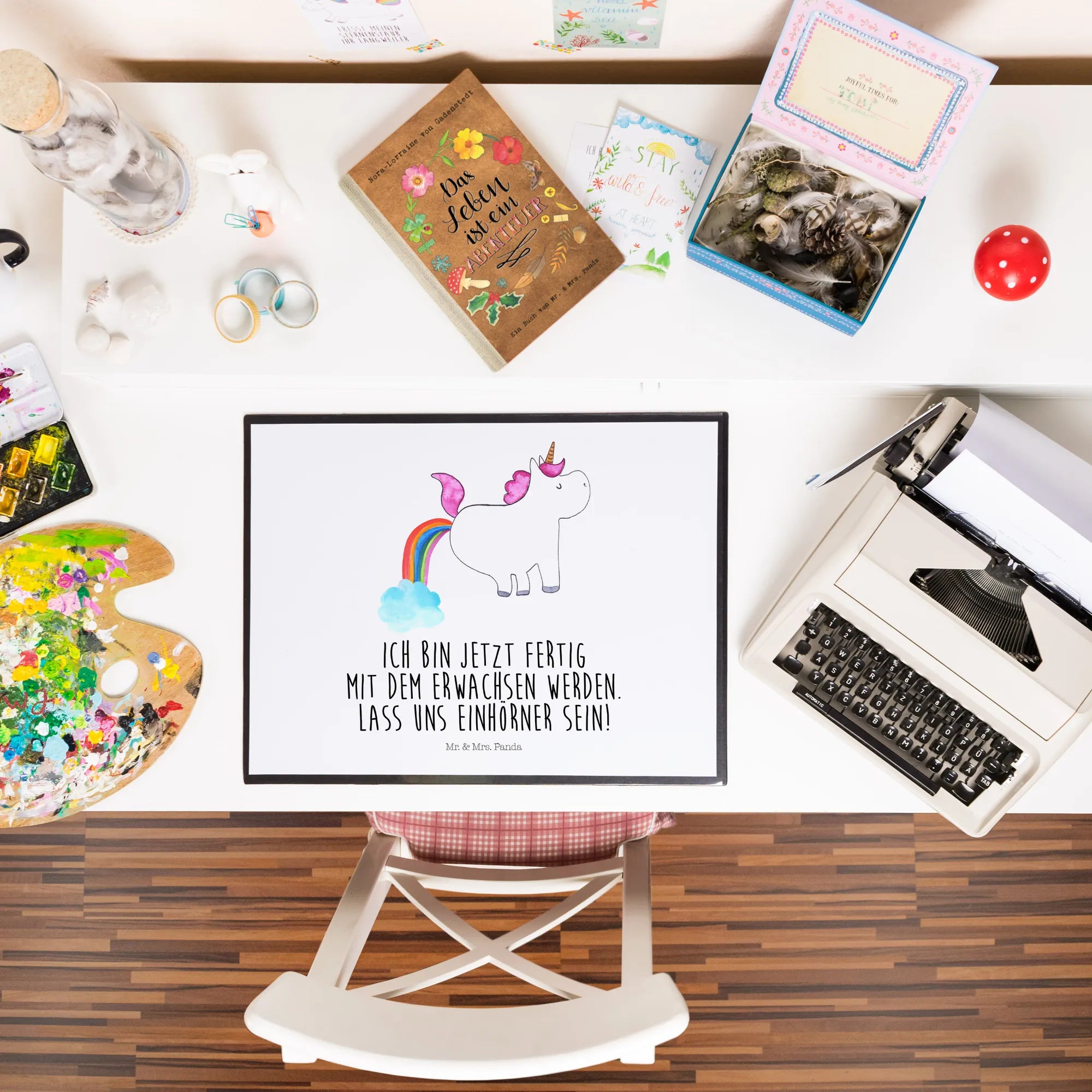 Triff unser zauberhaftes Einhorn, das entspannt mit einem Regenbogenpups durch die Lüfte schwebt. Es ermutigt uns, all das Ernsthafte hinter uns zu lassen und uns auf die Aussicht der Freude zu konzentrieren! "Ich bin jetzt fertig mit dem Erwachsenwerden. Lass uns Einhörner sein!" – dieser spritzige Spruch bringt uns dazu, uns an die kreativen und lebendigen Momente zu erinnern, die das Leben ausmachen. Lasst uns diese magischen Erinnerungen annehmen und uns das Recht geben, Spaß zu haben, wo auch immer wir sind. Mit einem Hauch von Glitzer und einer Portion Humor wird unser Leben bunter. Lass uns gemeinsam brillante Momente kreieren und die Dinge leicht nehmen. Wir haben die Kraft, wie ein Einhorn zu lächeln und in eine Welt voller Wunder einzutauchen!