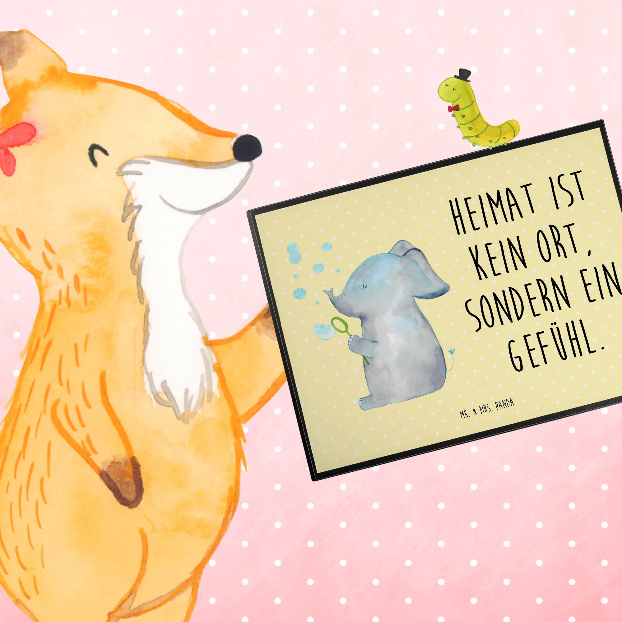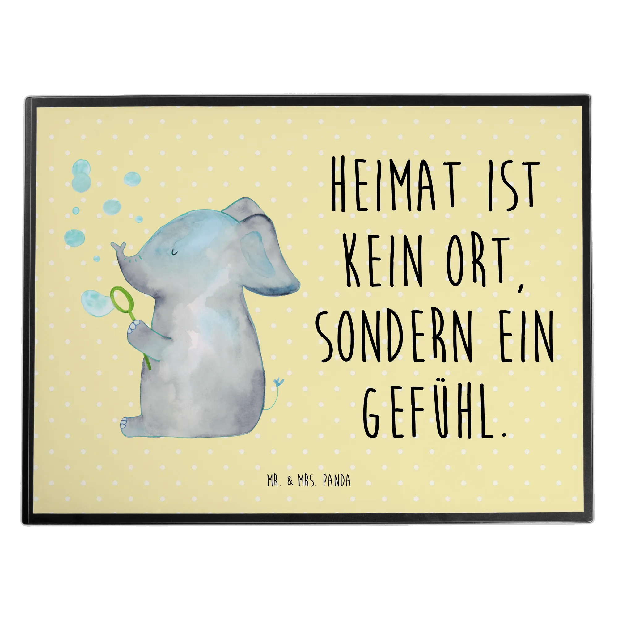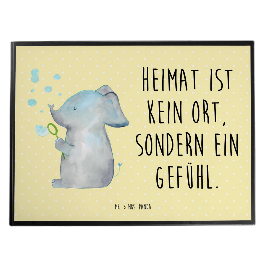 Entdecke die fröhliche Schreibtischauflage von Mr. & Mrs. Panda: Ein niedlicher Elefant pustet bunte Seifenblasen vor einem sanften Gelb Pastell Hintergrund und trägt den liebevollen Spruch „Heimat ist kein Ort, sondern ein Gefühl.“ Diese Schreibtischunterlage verbindet herzerwärmende Optik mit praktischem Nutzen und ist das perfekte Bürozubehör für Zuhause, Schule oder Büro. 😊