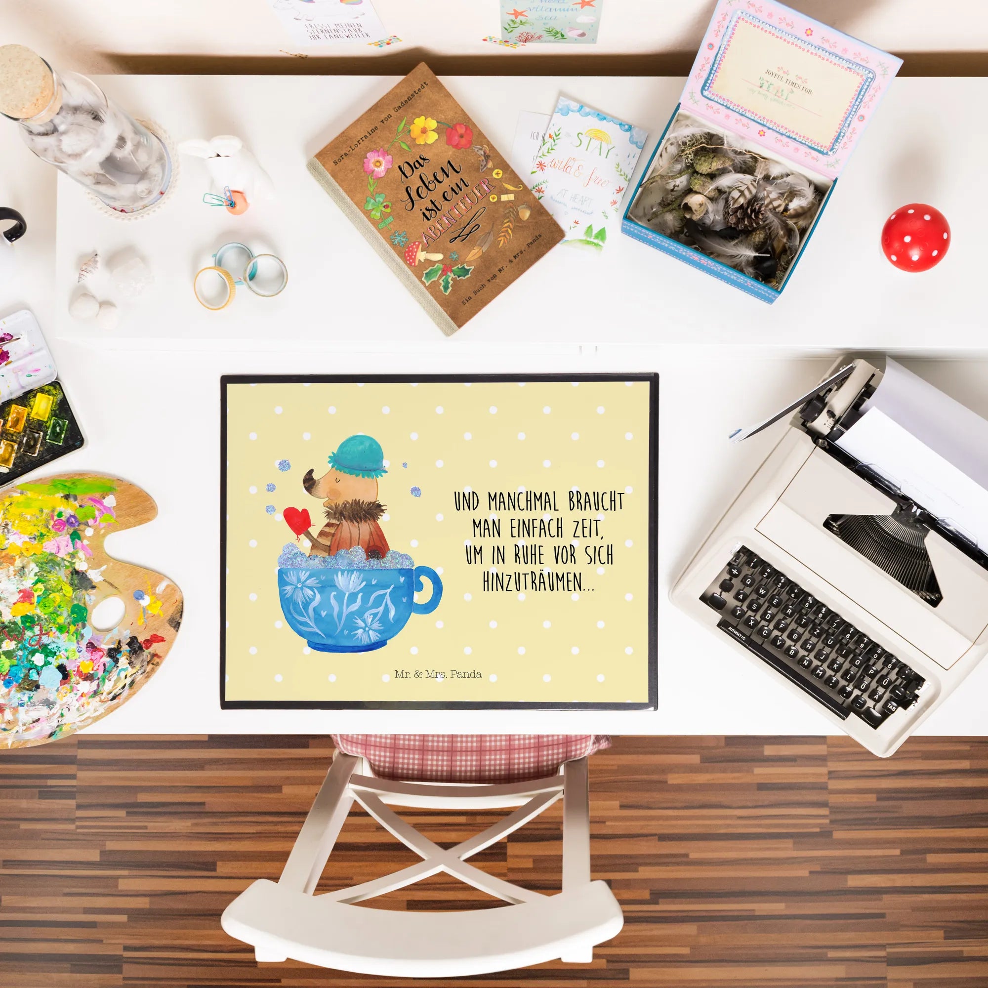 Kannst du dir vorstellen, wie es sich anfühlen würde, für einen kurzen Moment all deine Sorgen hinter dir zu lassen und in eine Tasse voll Schaumbad einzutauchen, genau wie der süße Nachtfalter von Mr. & Mrs. Panda? Dieses Motiv fängt die pure Essenz von Ruhe und Zufriedenheit ein. Der Spruch 'Und manchmal braucht man einfach Zeit, um in Ruhe vor sich hin zu träumen...' spricht zu jedem von uns mit einer sanften Stimme, die sagt: Es ist in Ordnung, eine Pause zu machen, tief durchzuatmen und die Seele baumeln zu lassen. Dieses liebevolle Kunstwerk lädt uns ein, das Badezimmer als unseren persönlichen Traumort zu sehen, wo wir uns erlauben können, verträumt und frei zu sein, weit entfernt von den Anforderungen des Alltags.