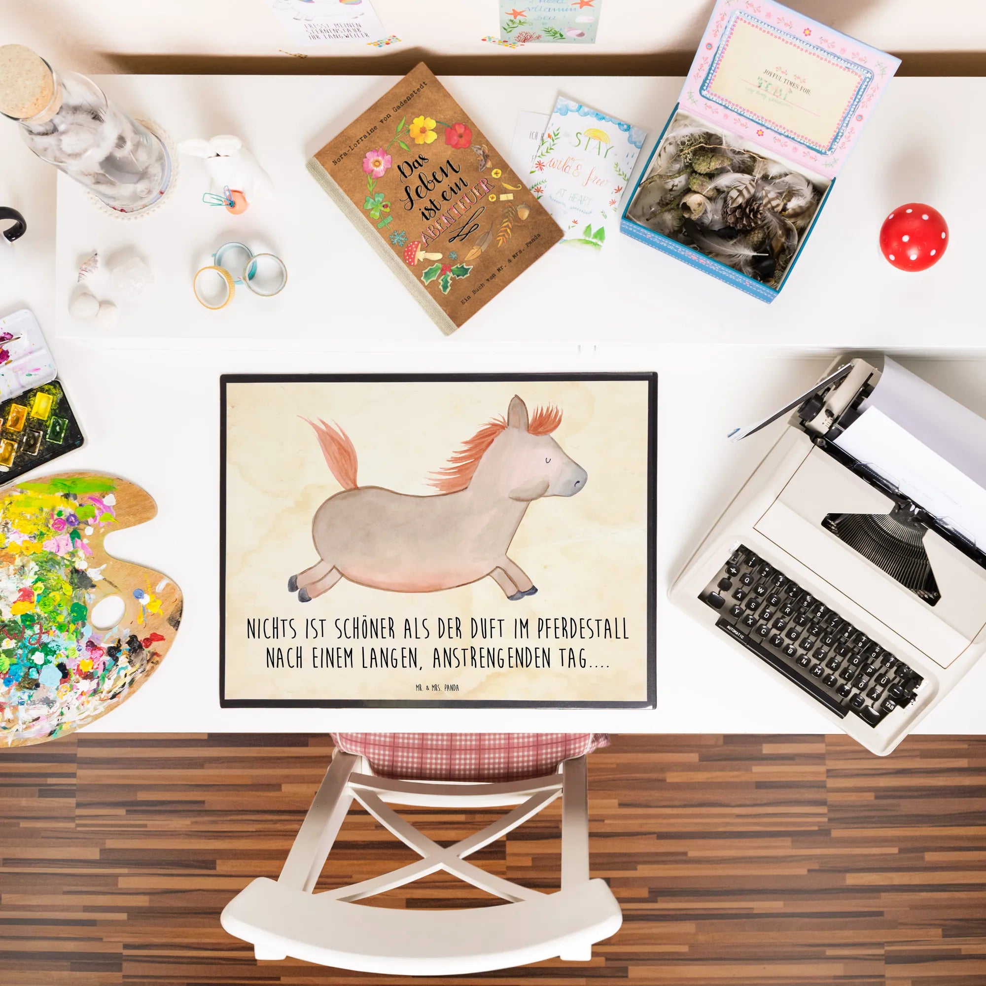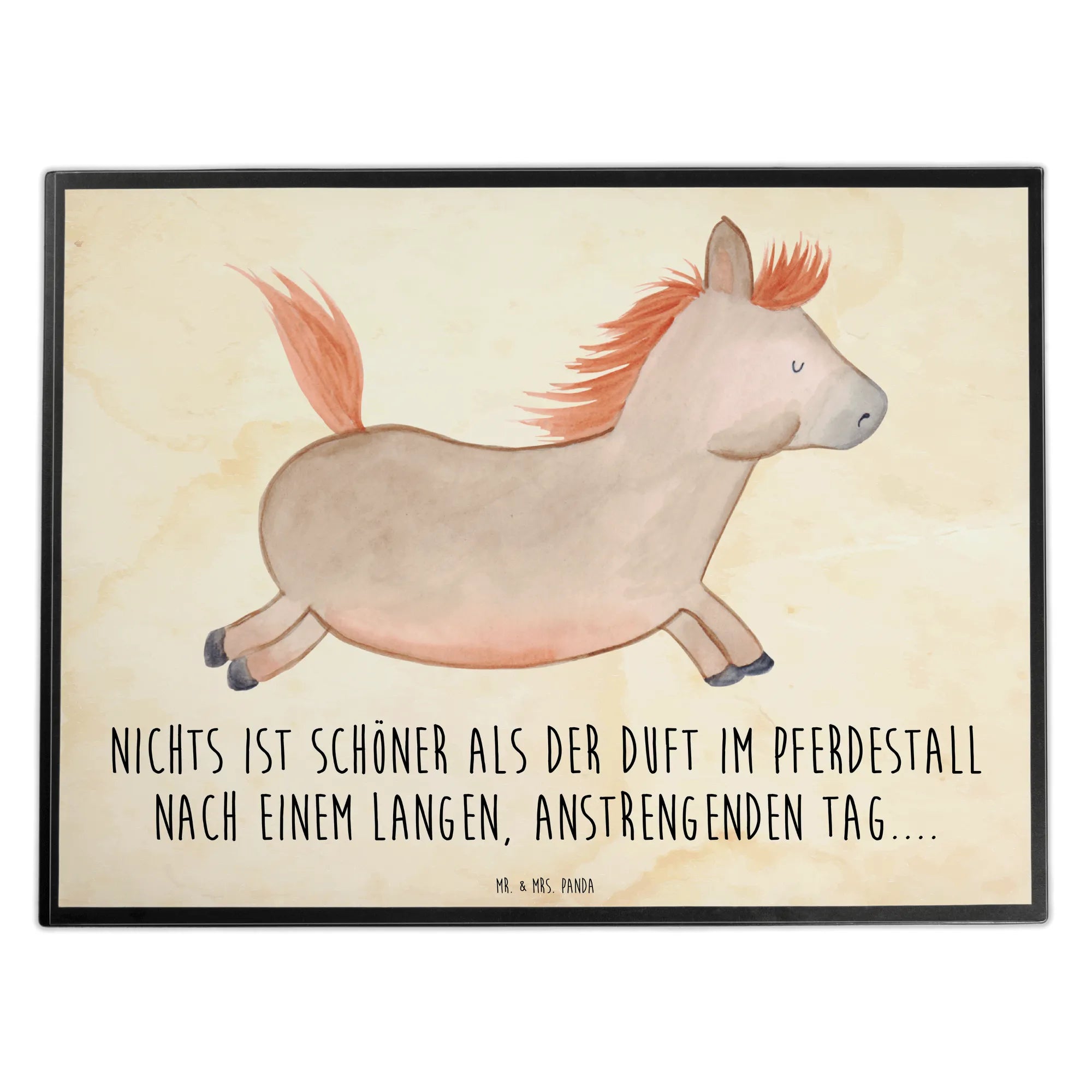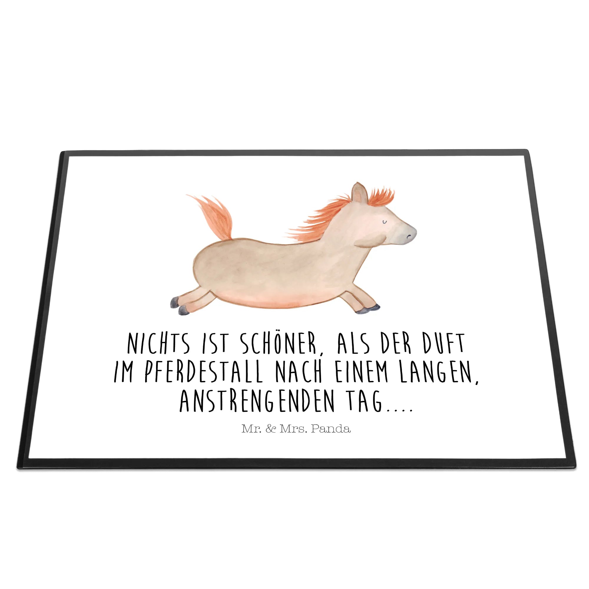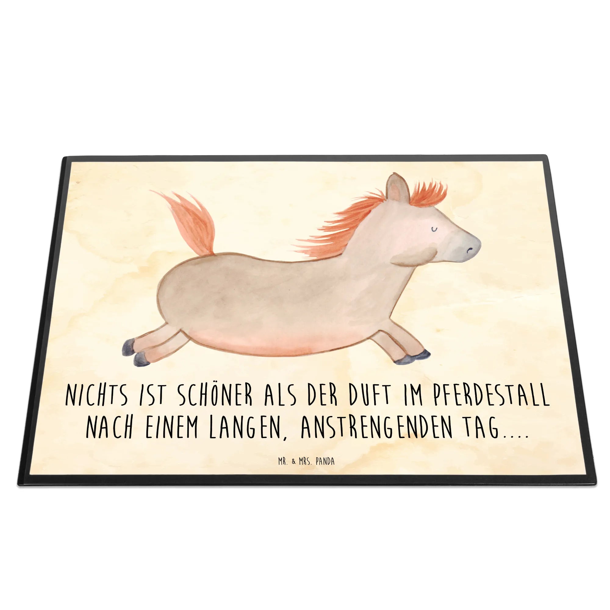 Die hochwertige Zellkautschuk-Oberfläche sorgt für ein angenehmes Schreibgefühl und schützt deinen Schreibtisch zugleich. Die Schreibtischunterlage hat die Maße von 400 mm x 530 mm, was sie perfekt für jeden Arbeitsplatz macht – egal, ob im Kindergarten, in der Schule, im Home Office oder im Büro. Das niedliche Motiv, das mit viel Liebe von Mrs. Panda handgezeichnet wurde, bringt Freude in jeden Arbeitstag. Mit unserem Slogan "Nichts ist schöner als der Duft im Pferdestall nach einem langen, anstrengenden Tag..." erinnert sie dich immer daran, die kleinen Dinge im Leben zu schätzen.