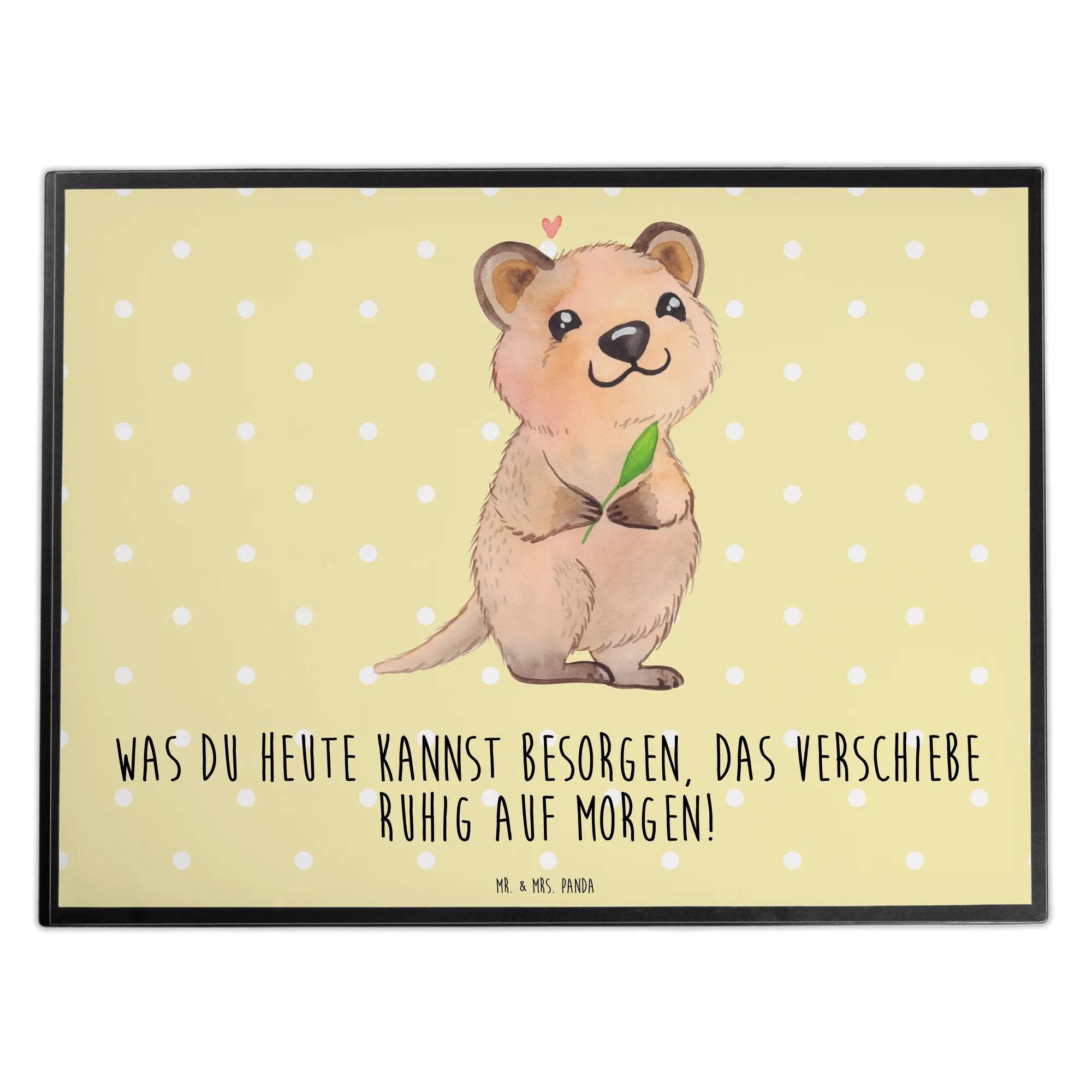 Entdecke die zauberhafte Schreibtischunterlage "Quokka Happy" aus der Small World Kollektion von Mr. & Mrs. Panda! Diese liebevoll gestaltete Schreibtischauflage ist der perfekte Begleiter für alle, die es lieben, ihre Schreib- und Arbeitswerkzeuge stilvoll zu präsentieren. Mit ihrem spritzigen Spruch: "Was du heute kannst besorgen, das verschiebe ruhig auf morgen!", bringt sie nicht nur einen Hauch von Humor auf deinen Schreibtisch, sondern erinnert dich auch auf spielerische Weise, dass jeder Tag seine eigene Zeit hat.
